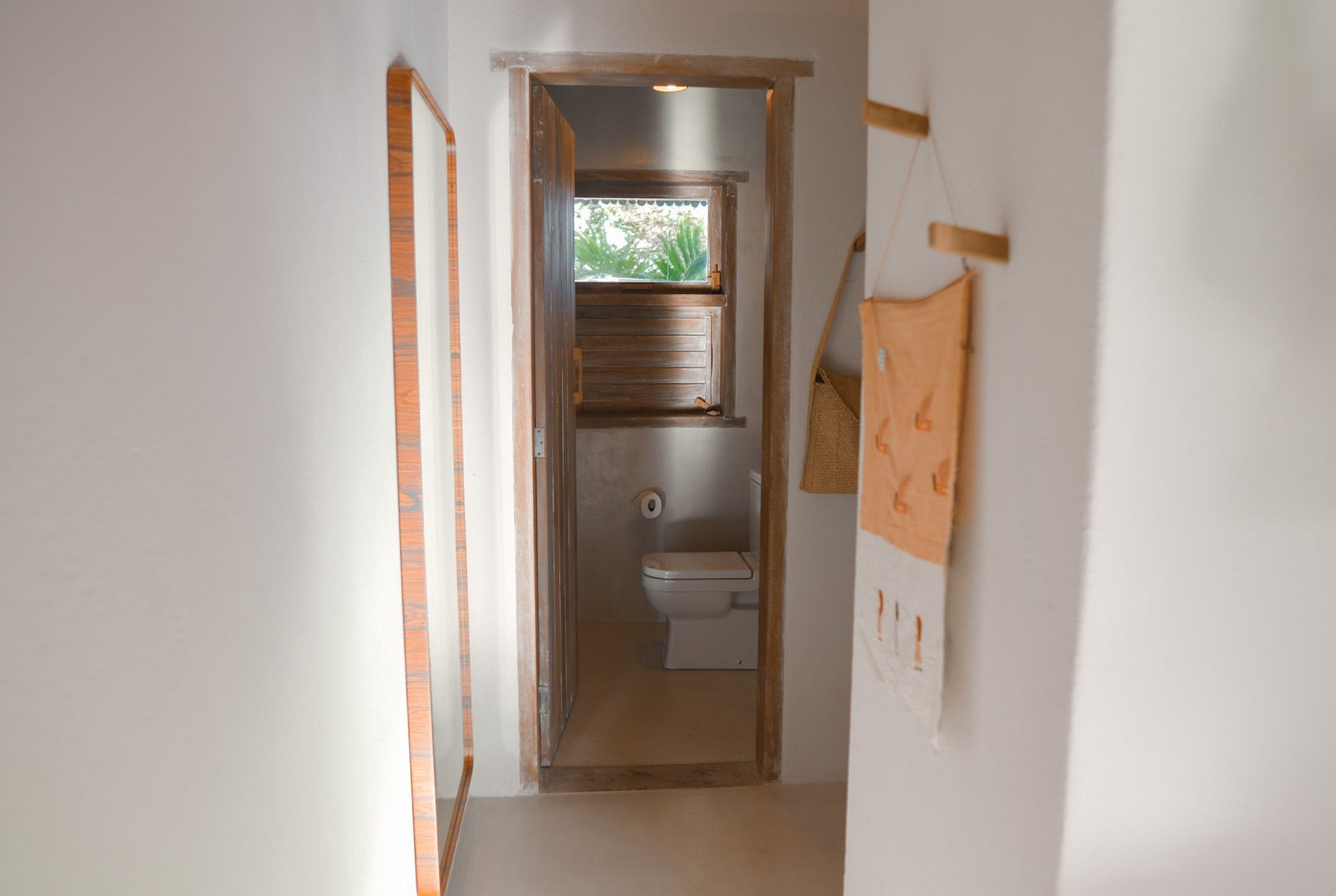 A casa, de estilo minimalista com influência da arquitetura de Trancoso, valoriza materiais e texturas locais, criando ambientes iluminados e acolhedores. A sala de estar conta com um generoso sofá, ideal para momentos de convivência, enquanto a sala de jantar dispõe de uma elegante mesa de madeira para refeições inesquecíveis.
