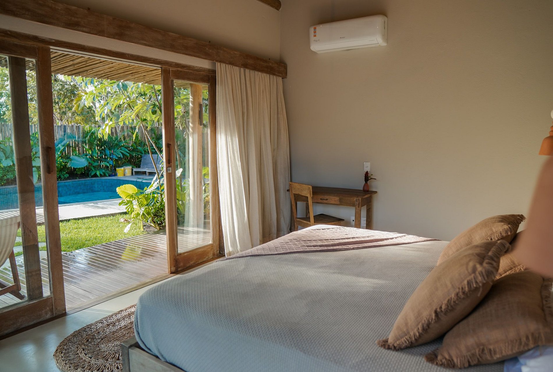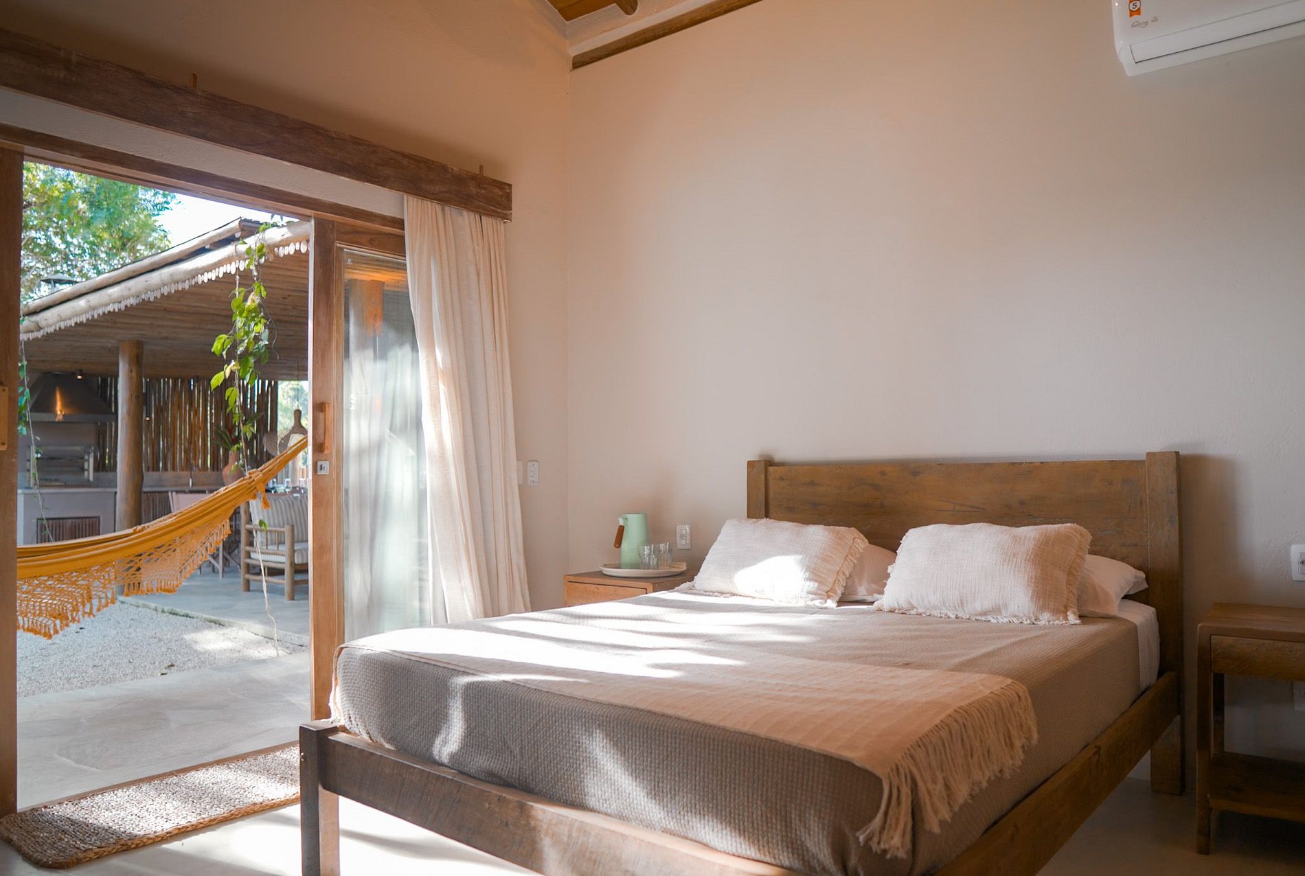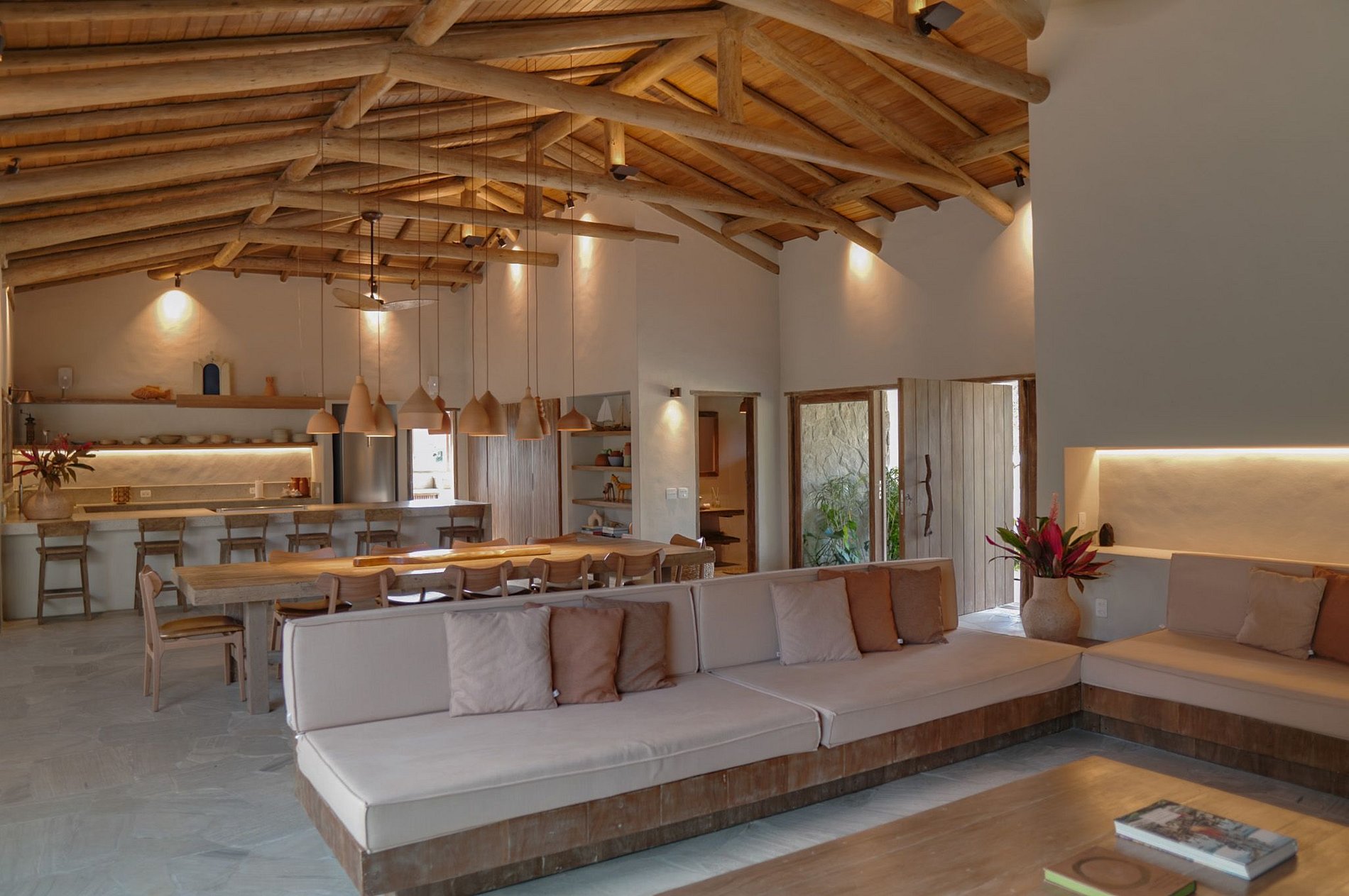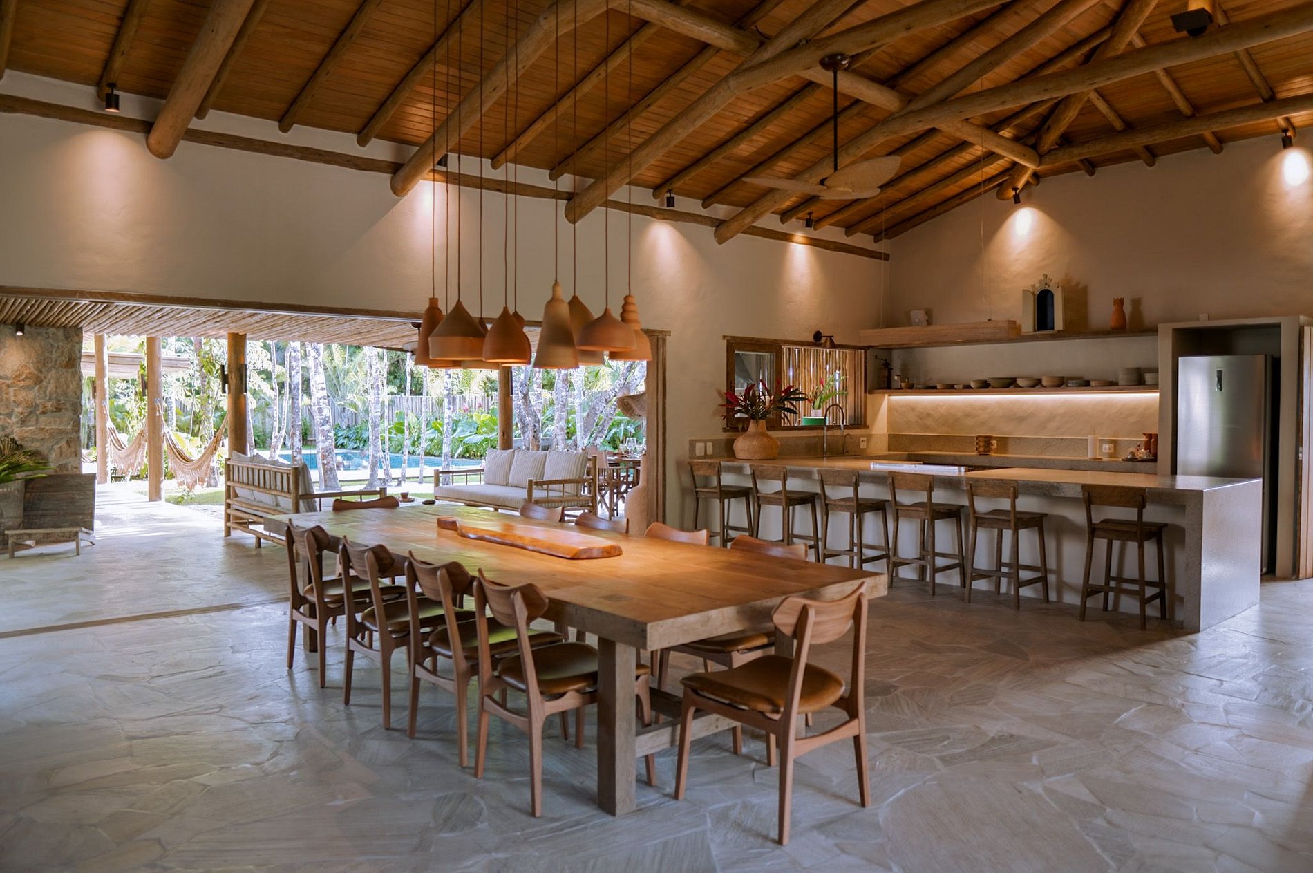 A casa, de estilo minimalista com influência da arquitetura de Trancoso, valoriza materiais e texturas locais, criando ambientes iluminados e acolhedores. A sala de estar conta com um generoso sofá, ideal para momentos de convivência, enquanto a sala de jantar dispõe de uma elegante mesa de madeira para refeições inesquecíveis.