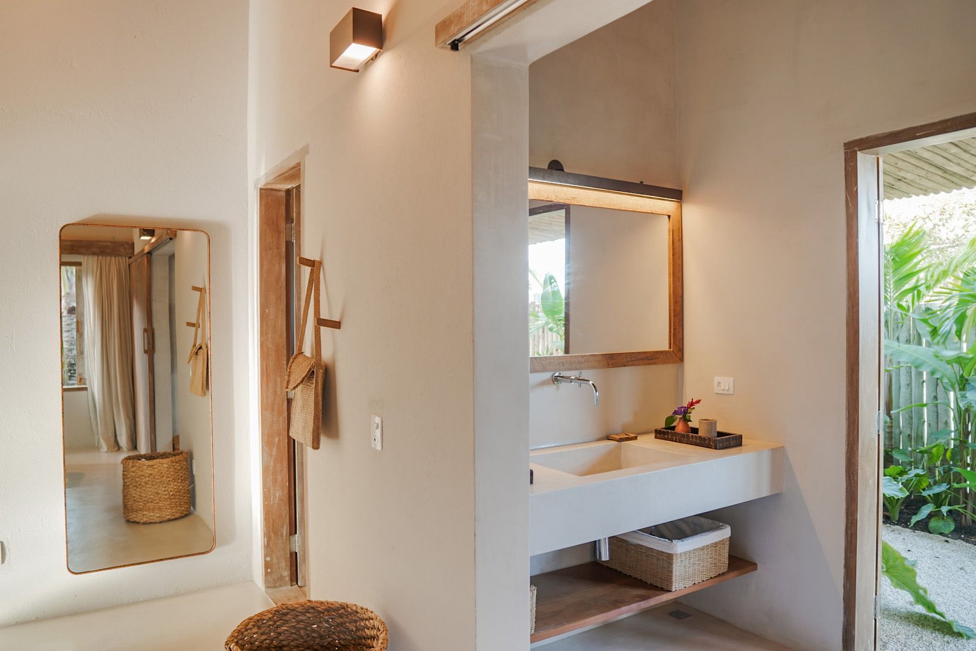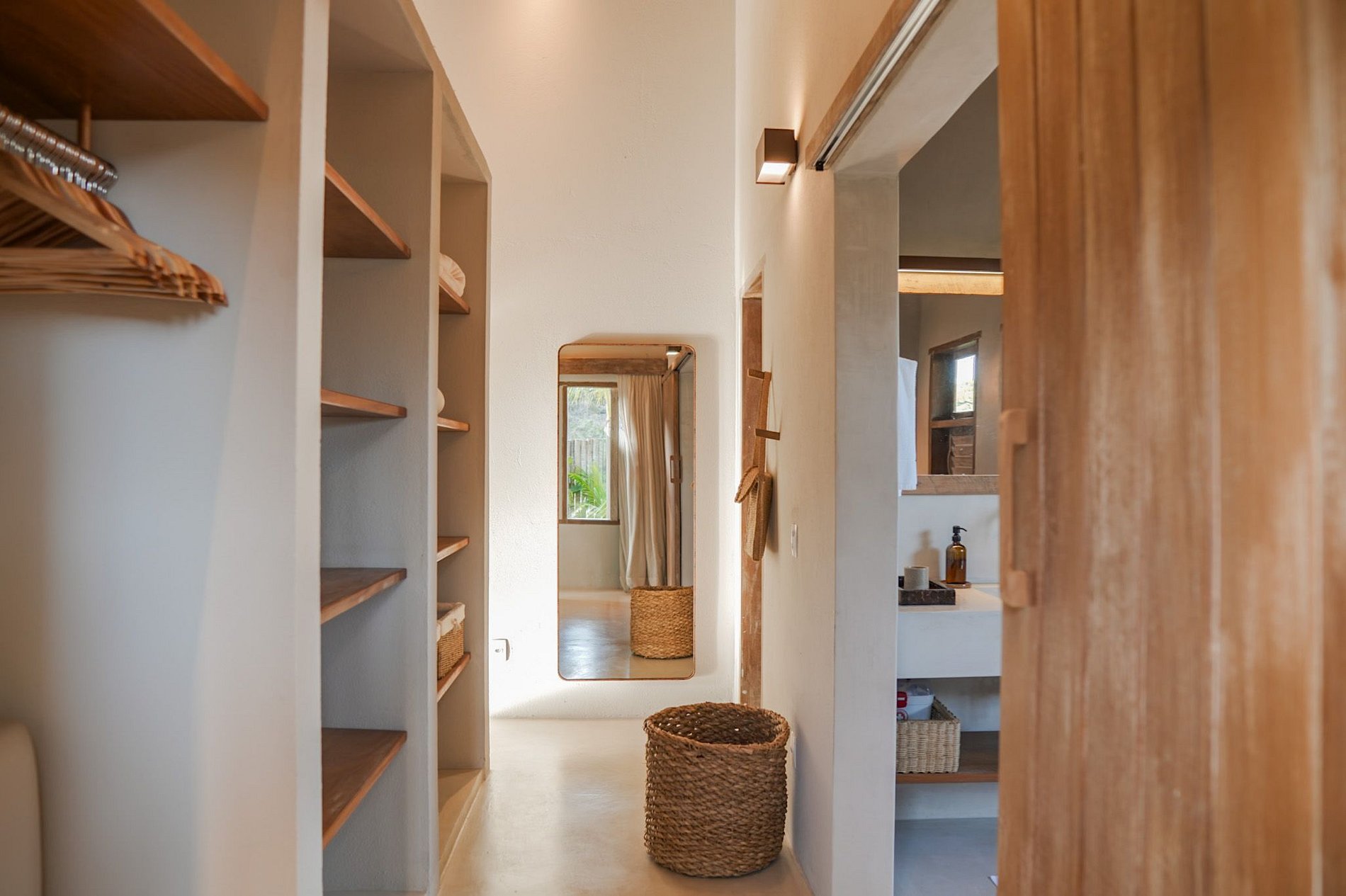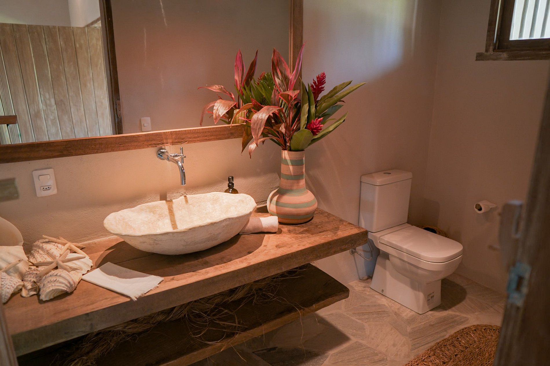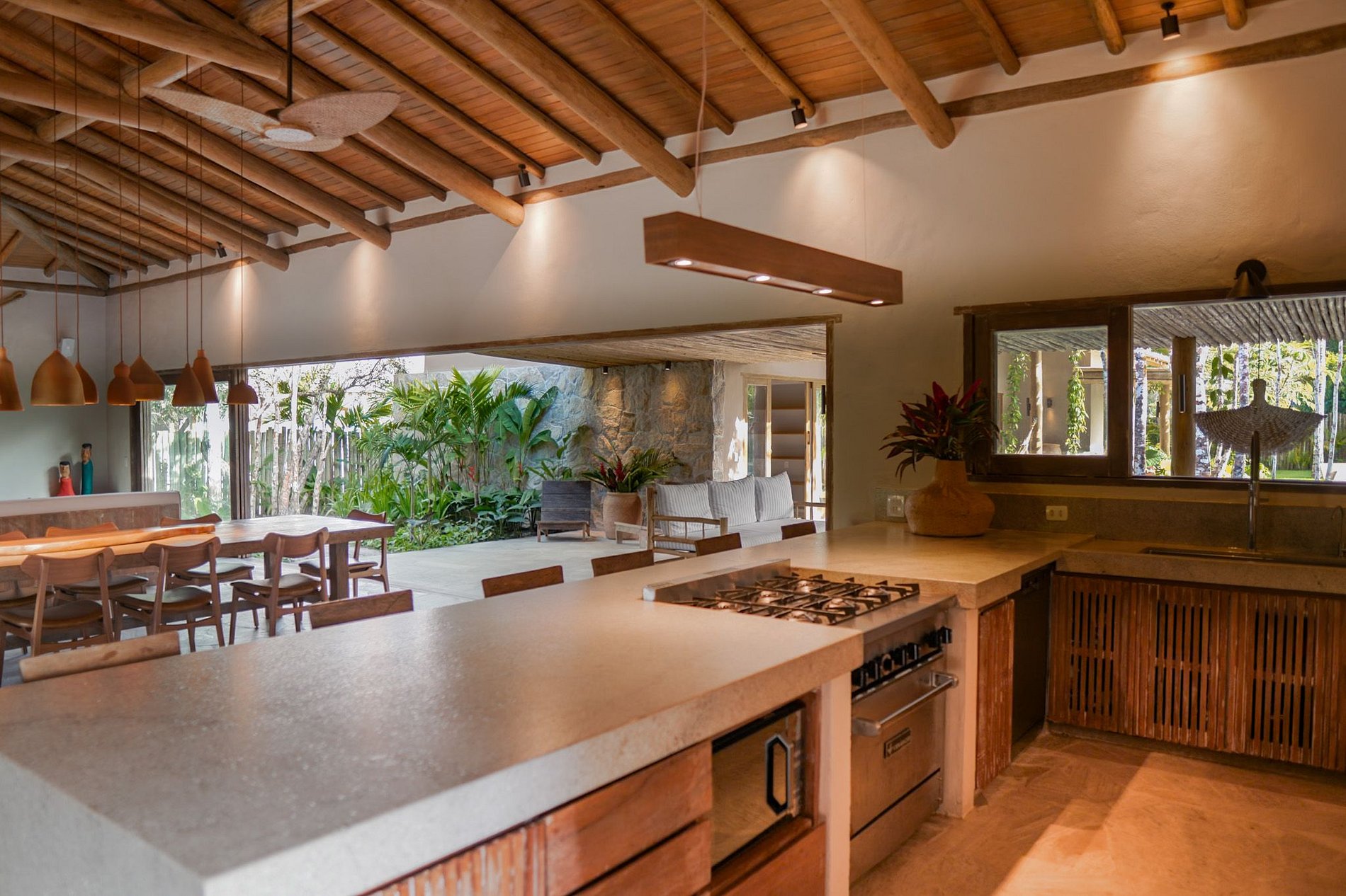 A casa, de estilo minimalista com influência da arquitetura de Trancoso, valoriza materiais e texturas locais, criando ambientes iluminados e acolhedores. A sala de estar conta com um generoso sofá, ideal para momentos de convivência, enquanto a sala de jantar dispõe de uma elegante mesa de madeira para refeições inesquecíveis.