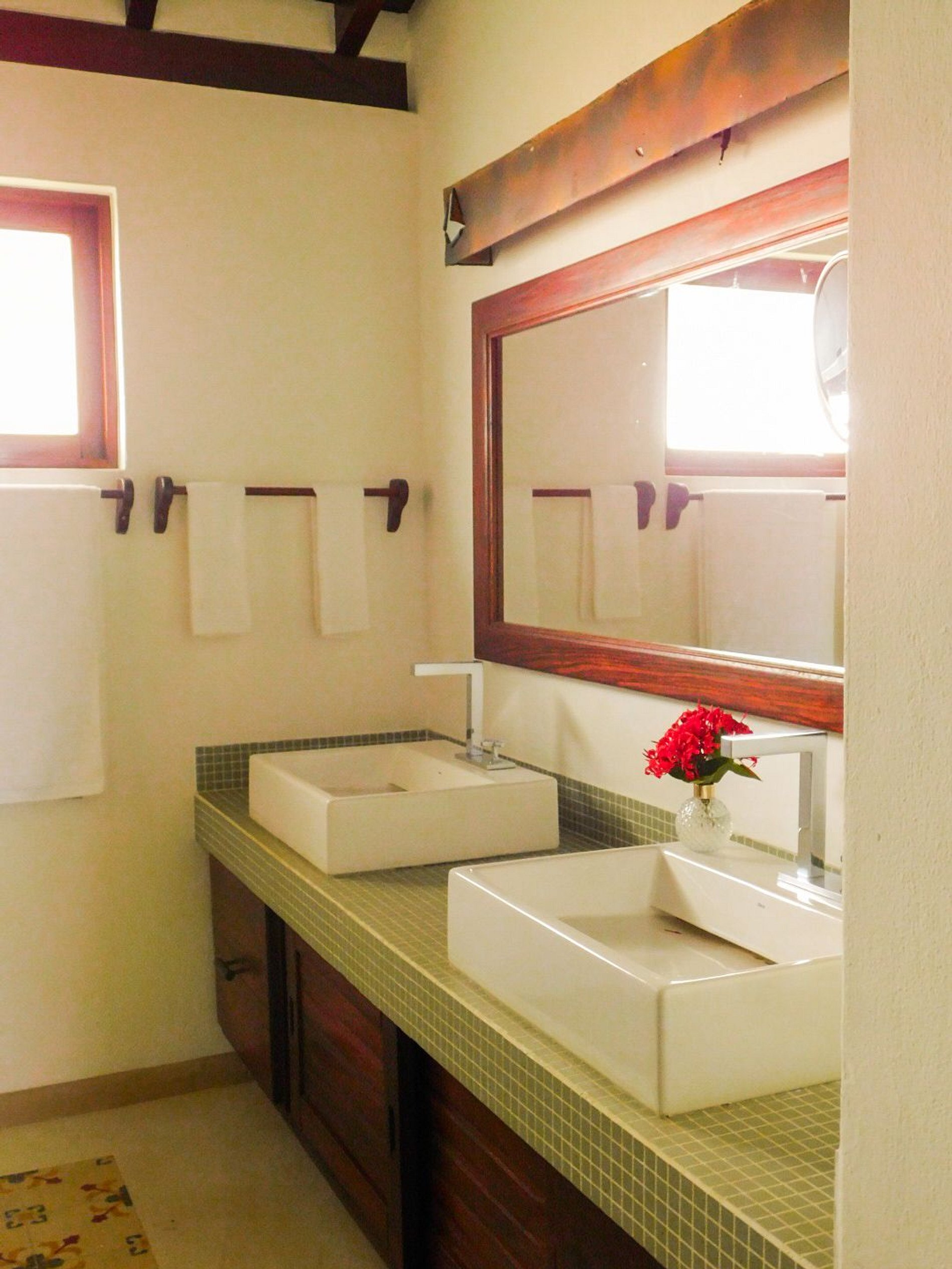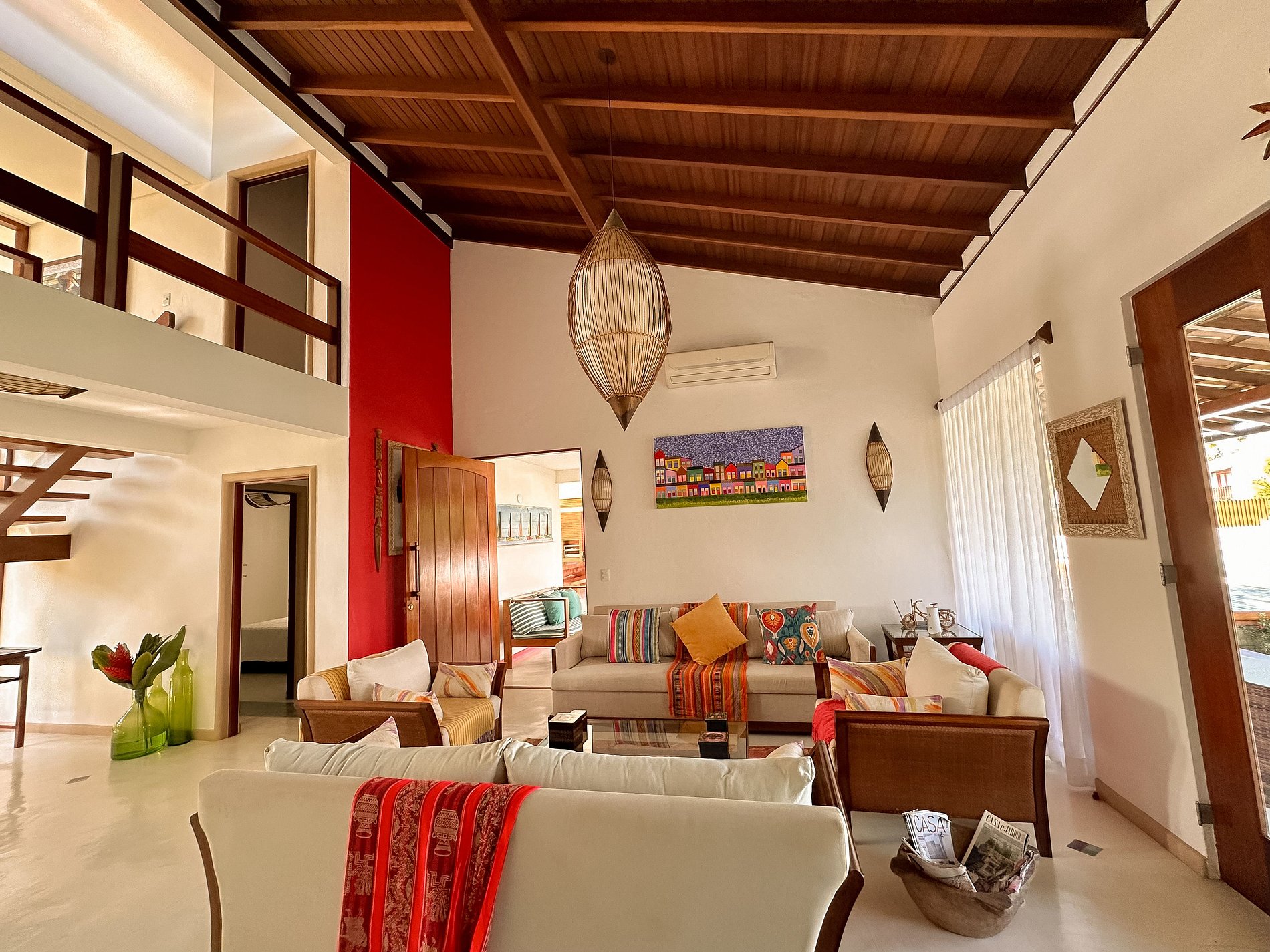 A casa acomoda confortavelmente até 6 pessoas em 3 suítes, todas com camas de casal, ar-condicionado e decoração que harmoniza conforto e simplicidade.