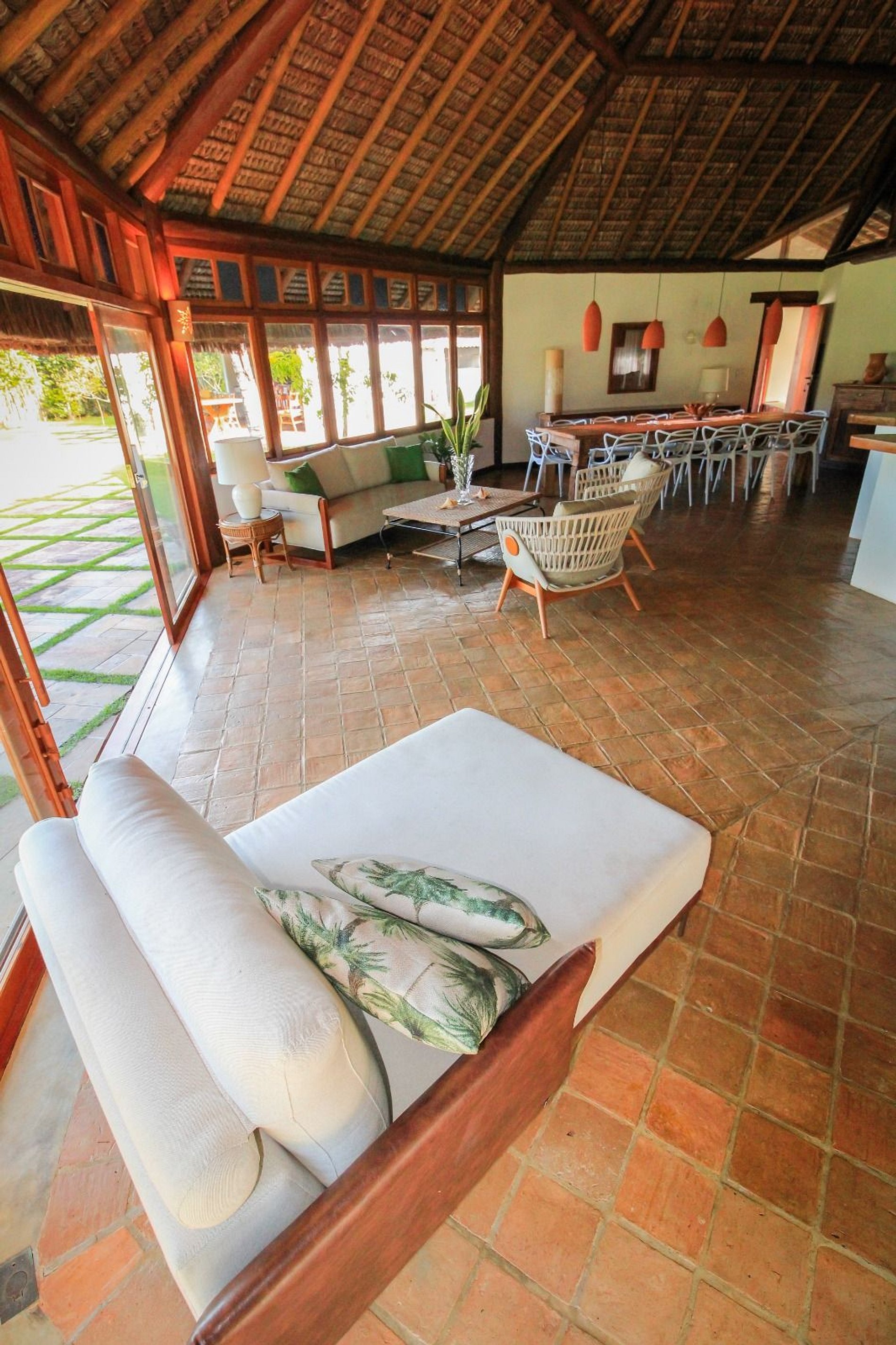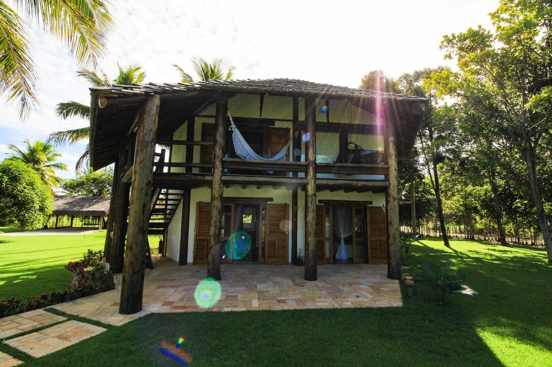 Cercada por um exuberante jardim tropical de 15.000 m², com palmeiras imponentes, pergolados charmosos e uma piscina deslumbrante ladeada por confortáveis espreguiçadeiras, a Casa Paradiso é um verdadeiro oásis localizado no prestigiado Condomínio Outeiro das Brisas, na Praia do Espelho, sul de Trancoso.