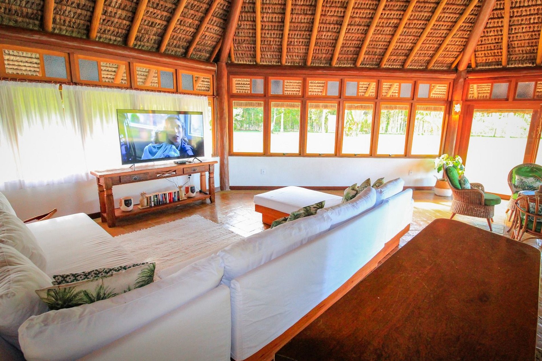 Cercada por um exuberante jardim tropical de 15.000 m², com palmeiras imponentes, pergolados charmosos e uma piscina deslumbrante ladeada por confortáveis espreguiçadeiras, a Casa Paradiso é um verdadeiro oásis localizado no prestigiado Condomínio Outeiro das Brisas, na Praia do Espelho, sul de Trancoso.