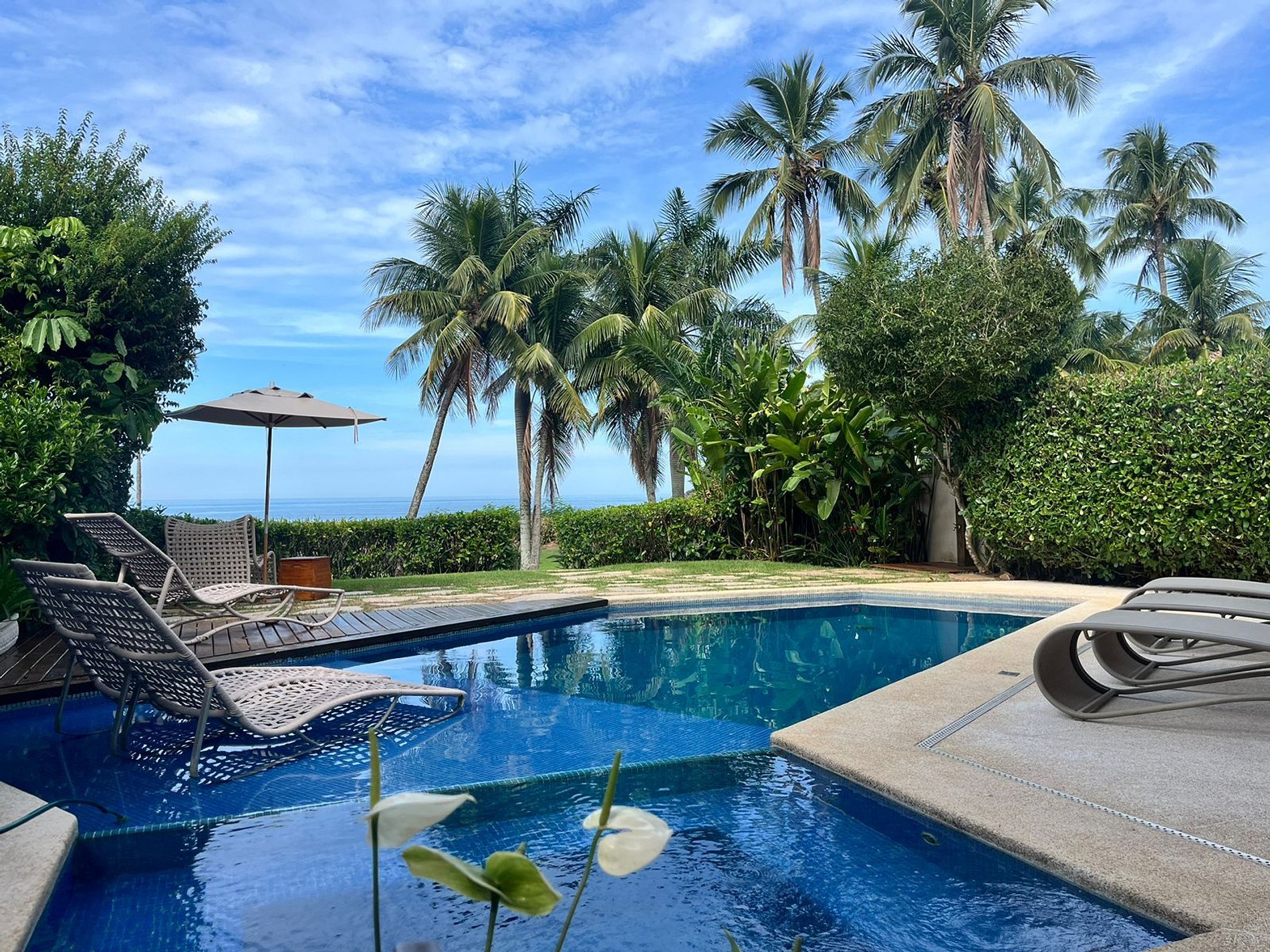 Piscina privativa com vista para o mar, ideal para um mergulho ao pôr do sol ou para dias inteiros de descanso.