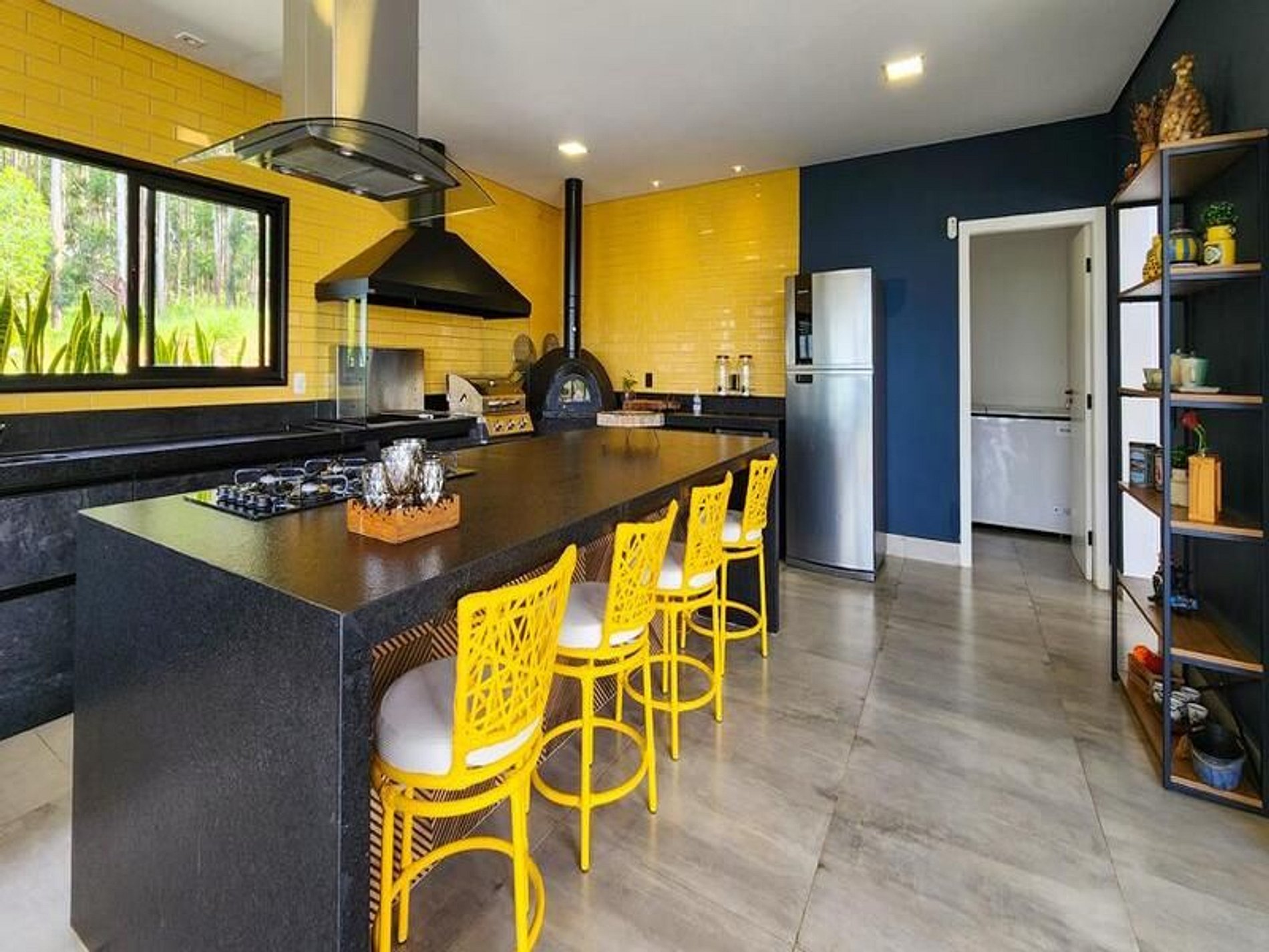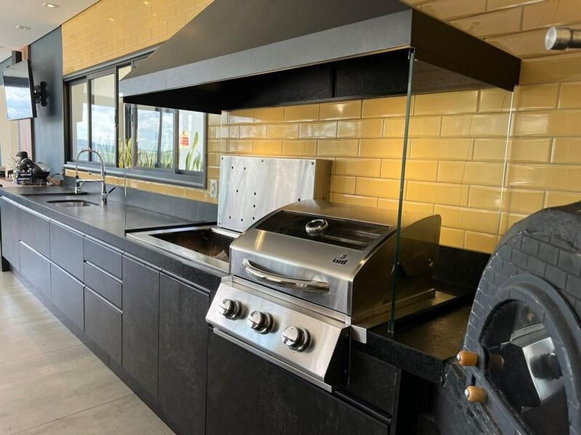 O espaço gourmet é um destaque à parte: conta com balcão central, coifa de ilha, churrasqueira, forno a lenha e forno a bafo — perfeito para momentos de confraternização e gastronomia ao ar livre.