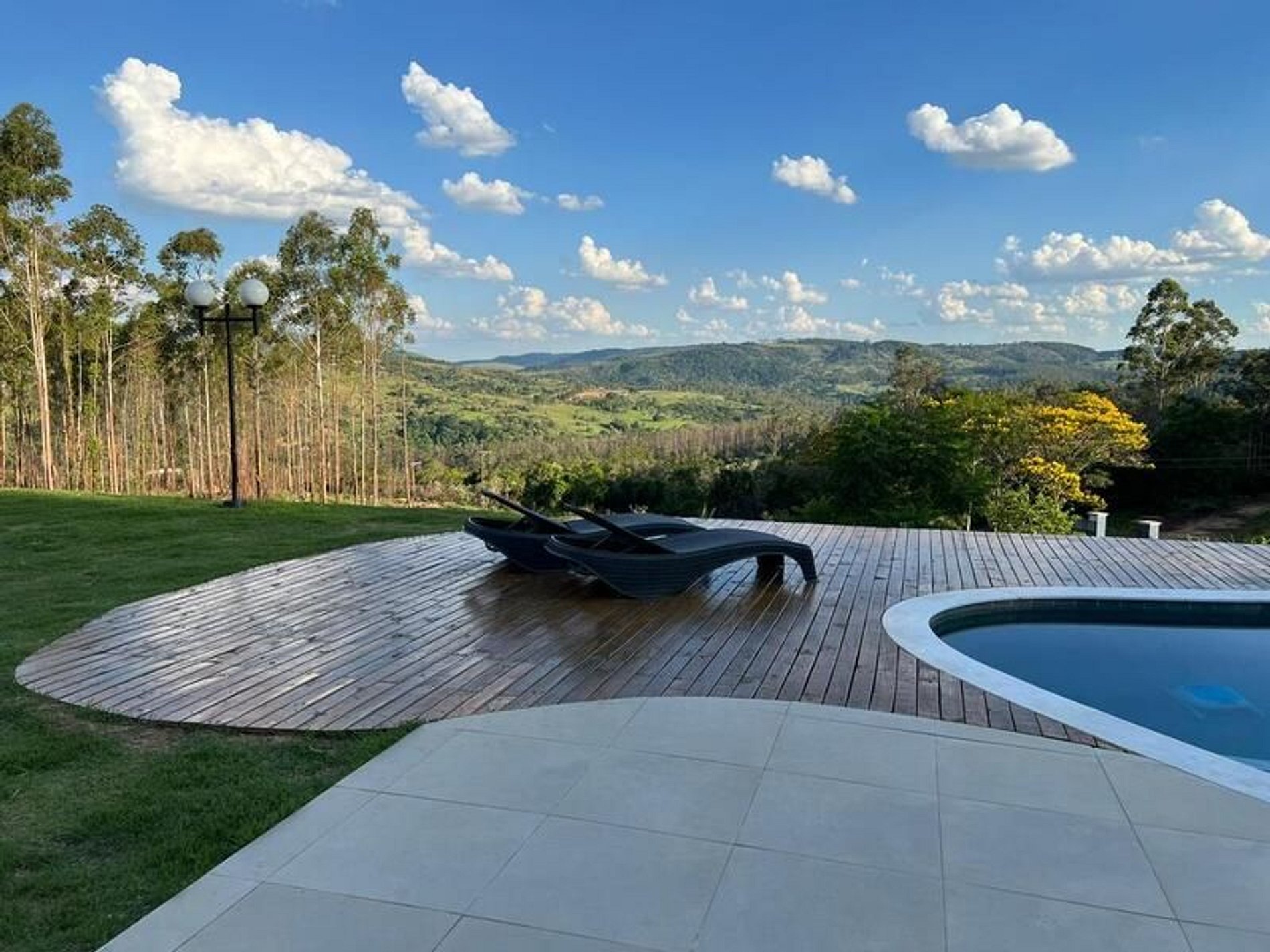 Para o relaxamento, a casa oferece uma piscina de alvenaria aquecida com iluminação especial, jacuzzi com hidromassagem aquecida, sauna e um ofurô externo com vista para a paisagem do entorno — ideal para curtir o pôr do sol ou simplesmente contemplar o silêncio do campo.