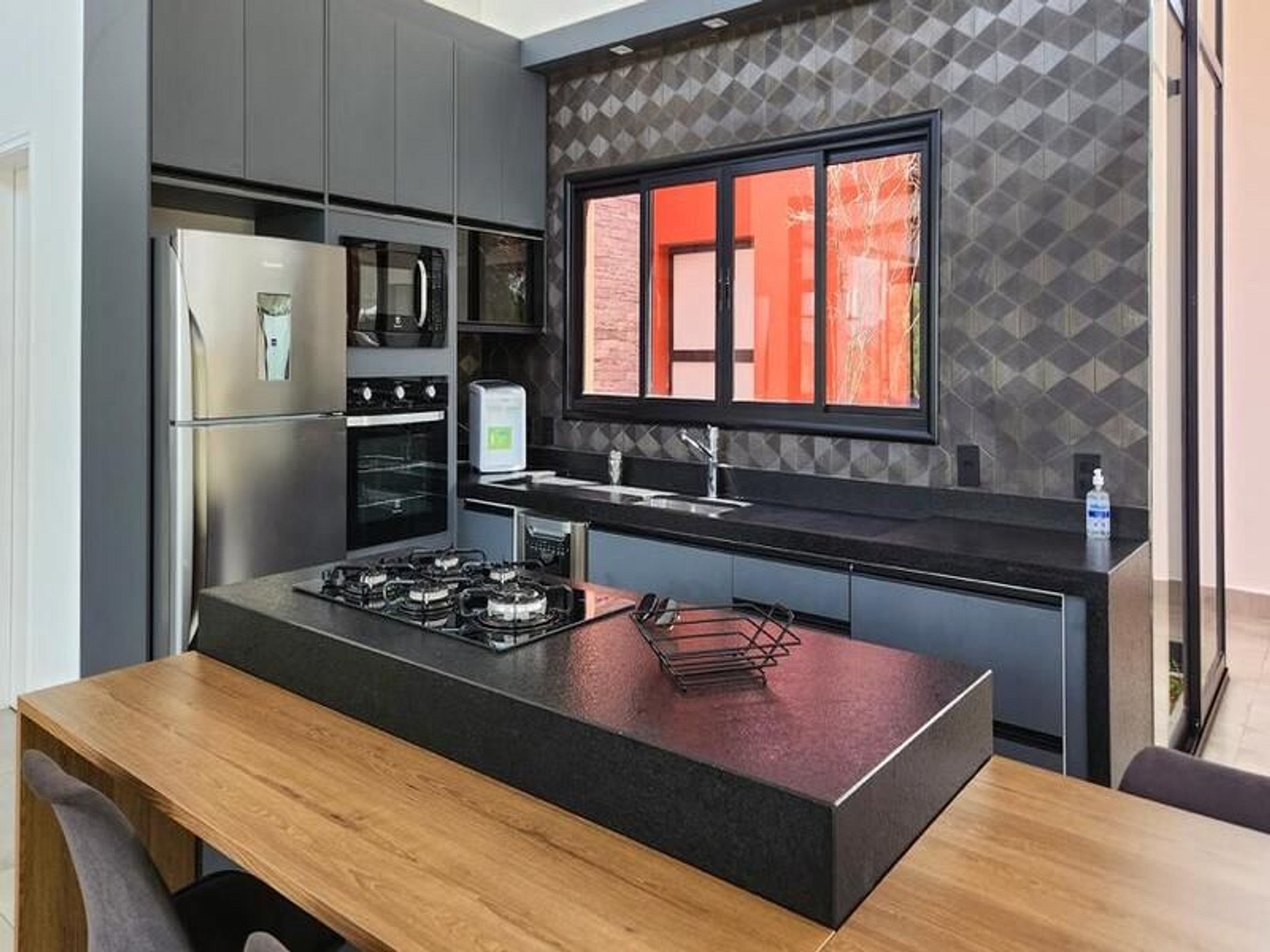 A cozinha planejada é completamente equipada com geladeira, cooktop, forno elétrico, microondas e outros eletrodomésticos modernos, tornando o preparo das refeições mais prazeroso e eficiente.