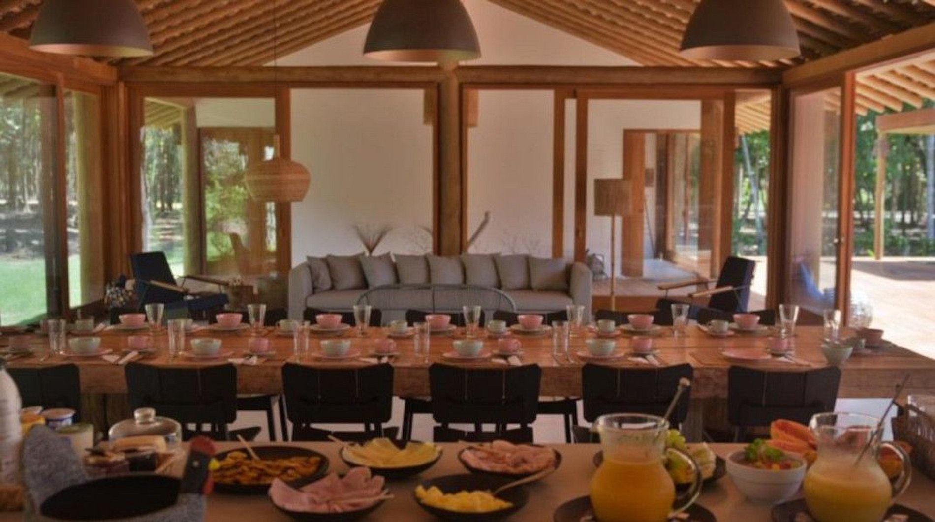 In the center of the dining room, a vast wooden table meets the demand of friends and family, as an integrated living room with air conditioning and a 55" TV.