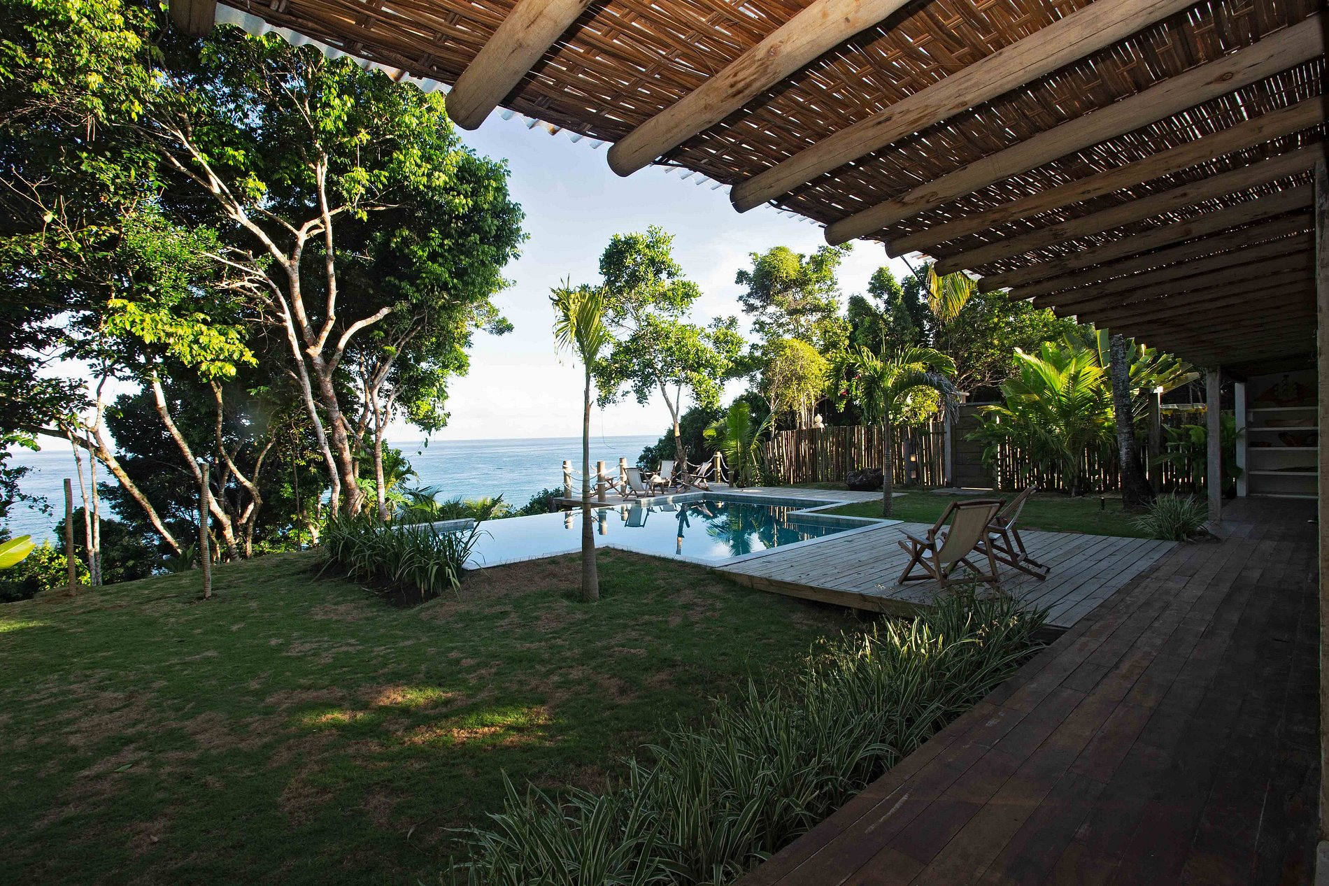 A piscina de borda infinita, localizada na beira da falésia, se mistura ao horizonte azul do mar, criando uma sensação de infinito. O deck suspenso e o jardim ao redor completam o cenário paradisíaco. A ampla varanda e o lavabo garantem conforto e praticidade para receber e relaxar.