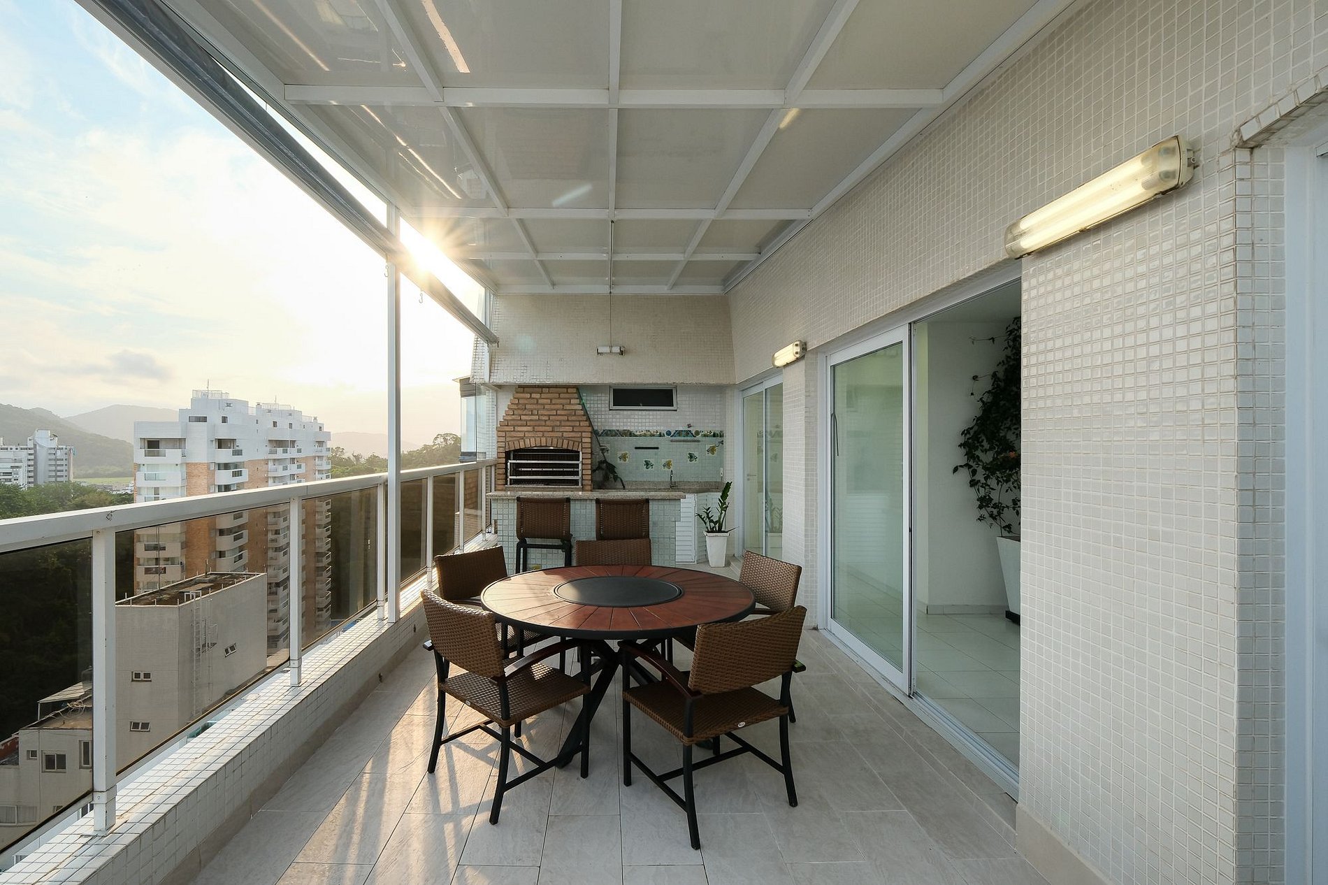 A parte externa da cobertura foi pensada para oferecer lazer e relaxamento em grande estilo. A piscina com vista para o mar é o ponto alto, acompanhada de uma jacuzzi privativa e de uma varanda ampla, perfeita para momentos de descanso ao som das ondas. O espaço gourmet com churrasqueira a carvão complementa a estrutura, garantindo experiências completas para confraternizações e refeições ao ar livre. O condomínio ainda disponibiliza serviço de praia exclusivo, para que os hóspedes desfrutem do mar com total comodidade.