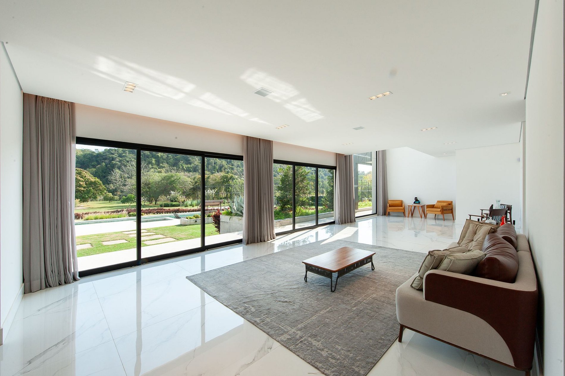 O amplo jardim gramado se integra perfeitamente com a natureza da região, criando um ambiente de paz e contemplação. A casa conta com uma piscina imponente, rodeada por espreguiçadeiras e um deck generoso, ideal para momentos de lazer ao sol. Além disso, há quadra poliesportiva, espaço de convivência ao ar livre e vistas deslumbrantes para as montanhas que cercam a propriedade, tornando cada instante ainda mais especial.