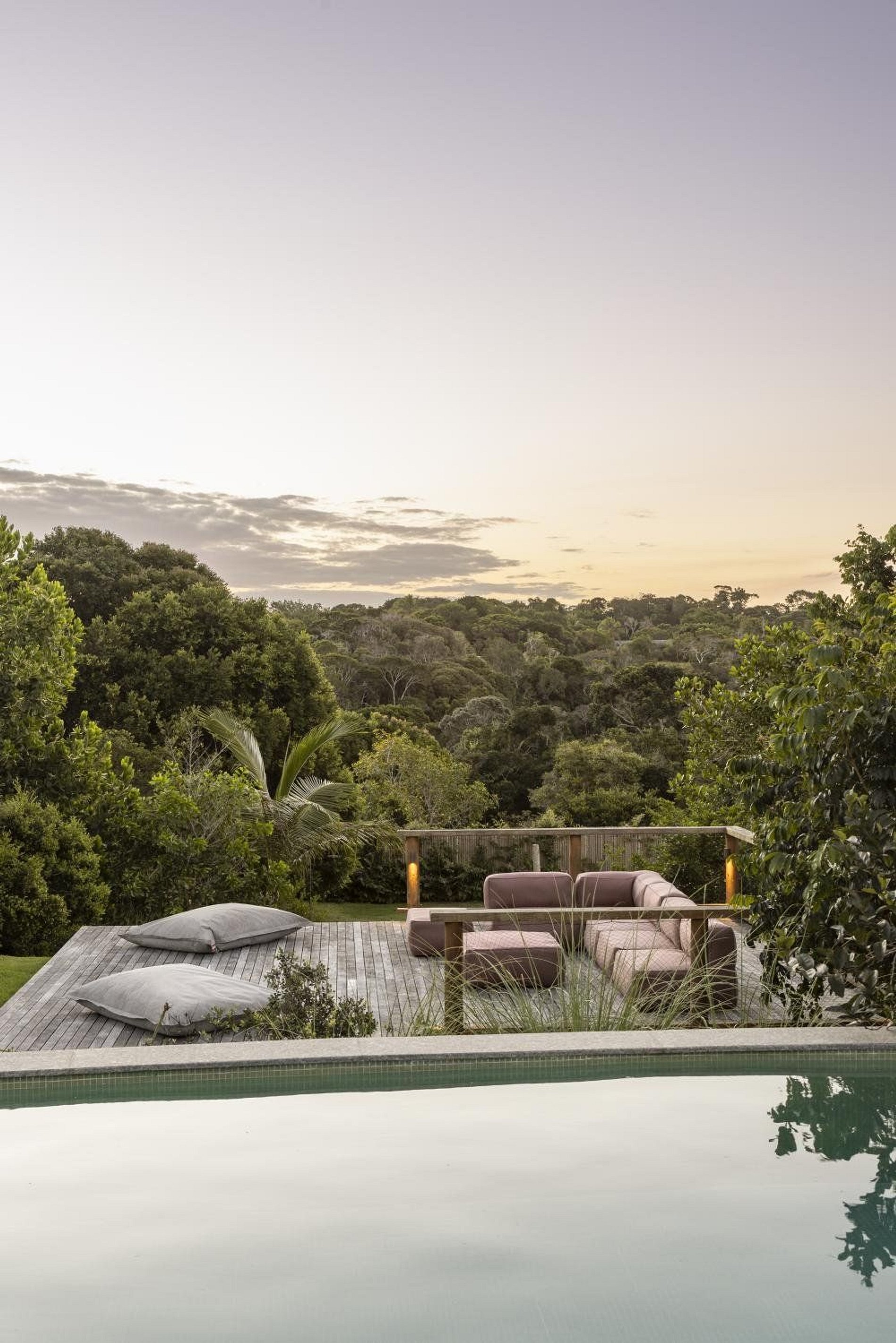 O jardim tropical é o grande destaque da propriedade — um espaço amplo, silencioso e repleto de verde, onde só se ouve o canto dos pássaros. A casa conta com uma piscina de borda infinita com vista para o vale, ducha externa e deck para observação das estrelas, criando um verdadeiro ambiente de spa a céu aberto.