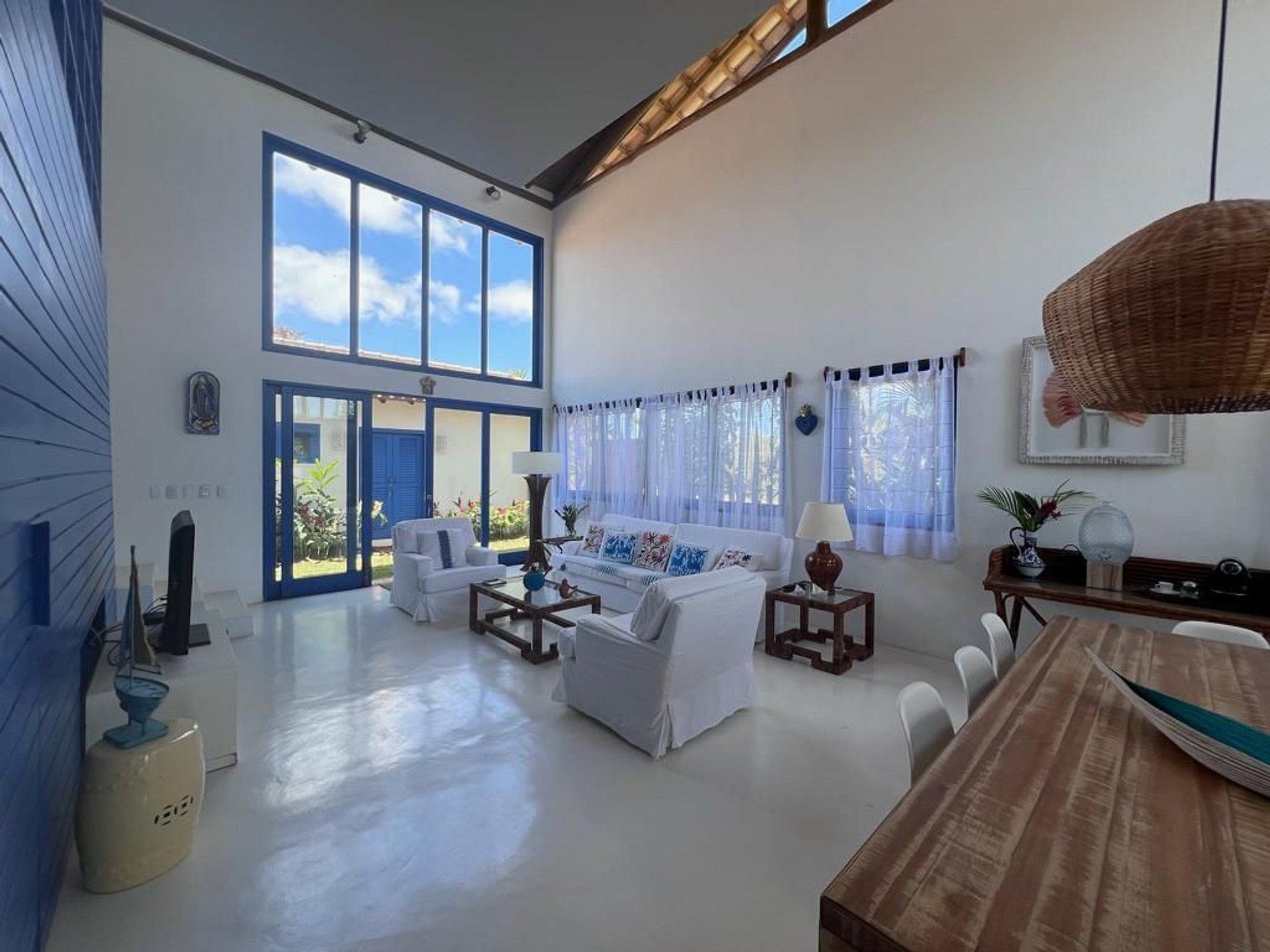 A casa conta com uma sala ampla, integrada à mesa de jantar e à cozinha completa, proporcionando praticidade e conforto em um único espaço. Os sofás espaçosos e a decoração leve tornam o ambiente acolhedor e convidativo, ideal para convívio e descanso após um dia de praia.