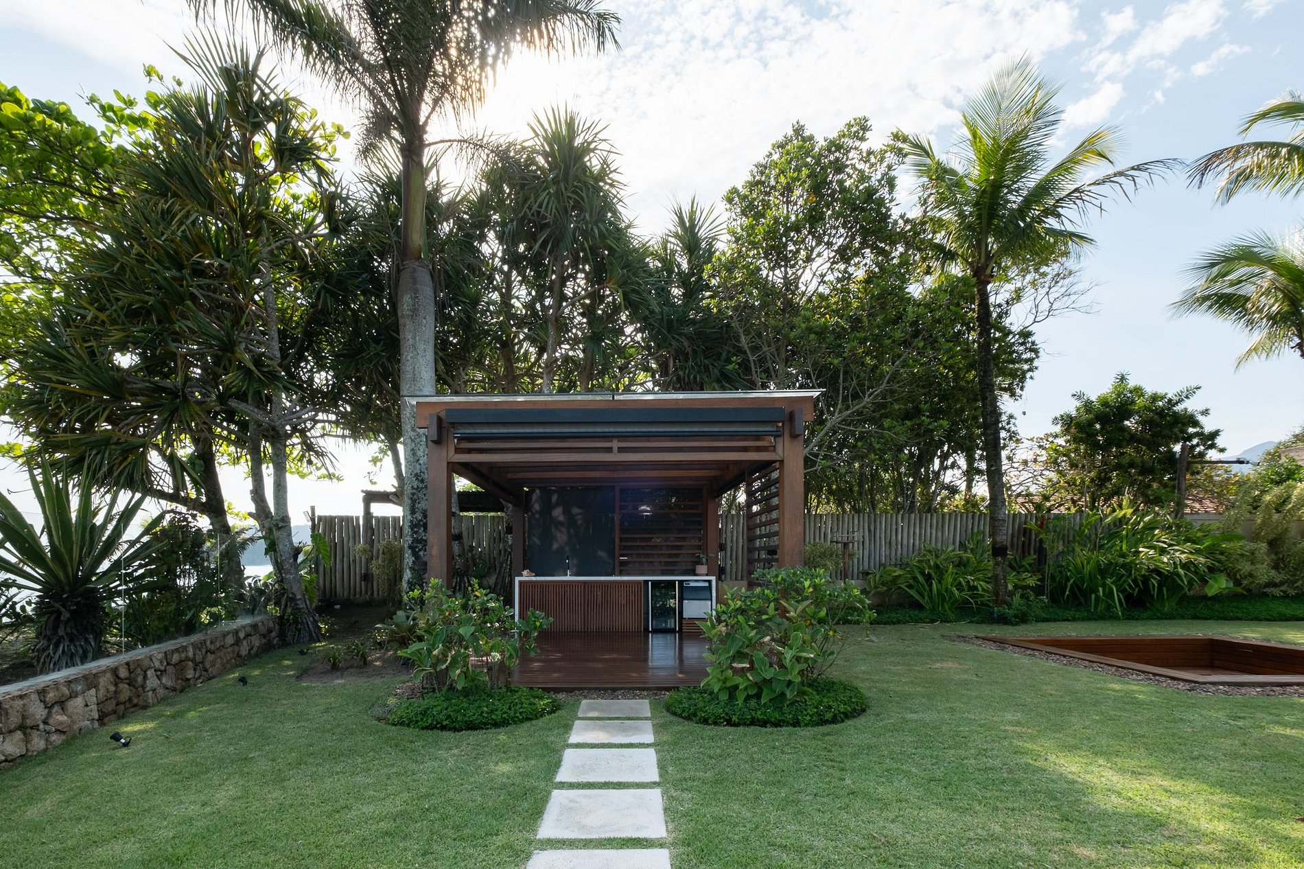 Há também um espaço gourmet coberto, ideal para refeições ao ar livre, e áreas de convivência que se integram perfeitamente à natureza e à vista para o mar. O pôr do sol visto da piscina é um espetáculo à parte.