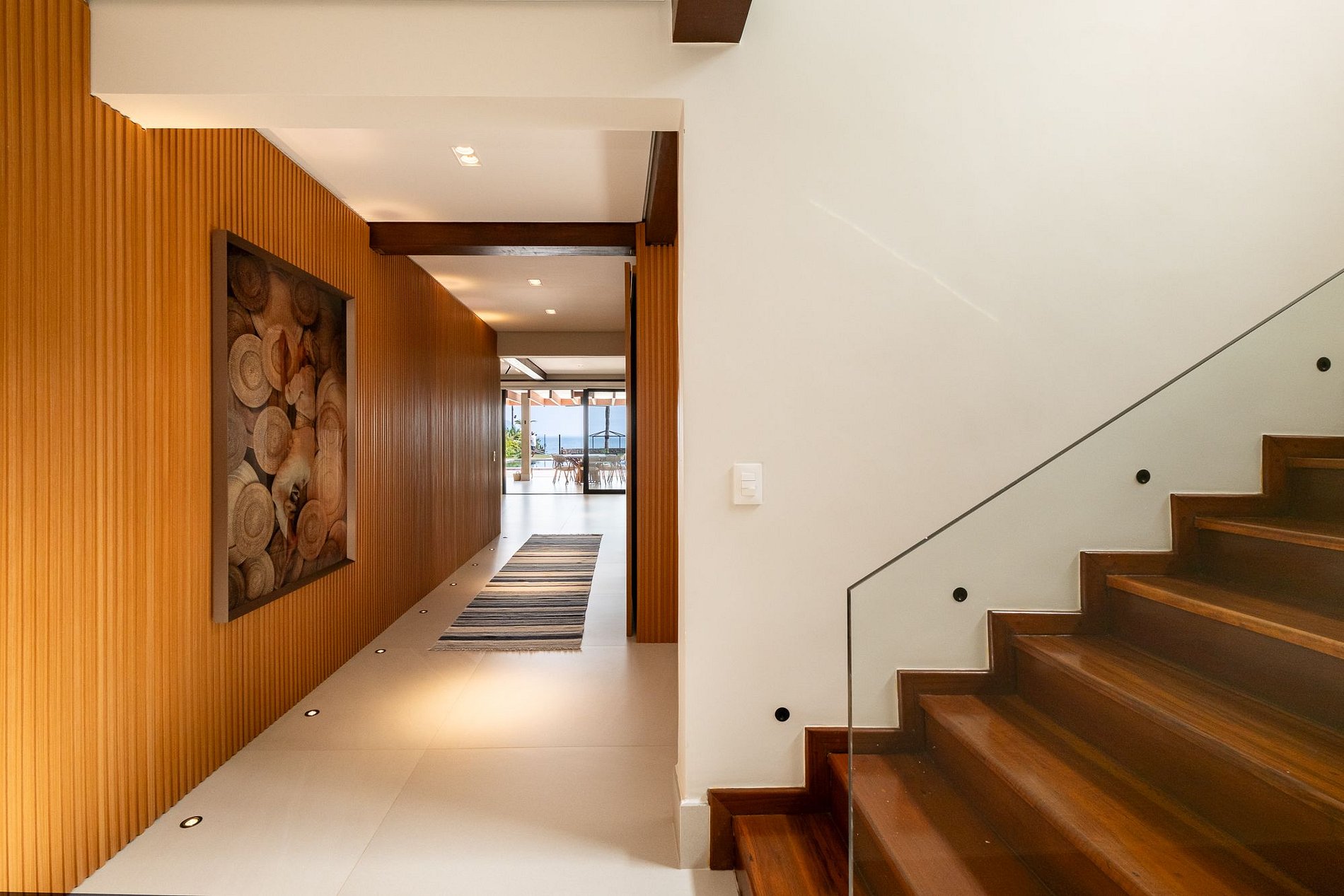 Ambientes amplos e integrados com o exterior, cercados por grandes aberturas que permitem entrada abundante de luz natural e vista para o mar.