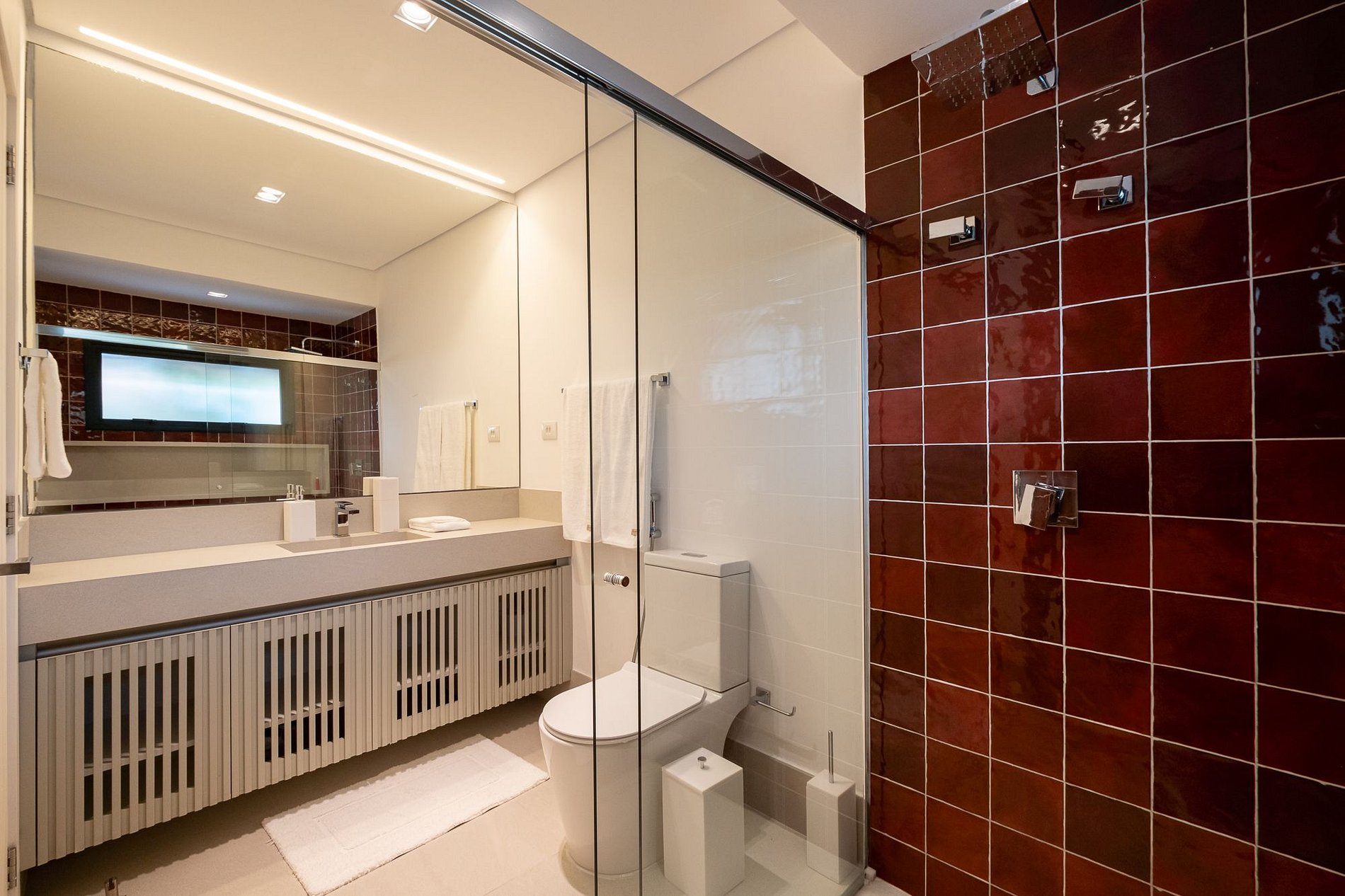 A casa conta com 8 suítes, todas climatizadas e decoradas com conforto e bom gosto: