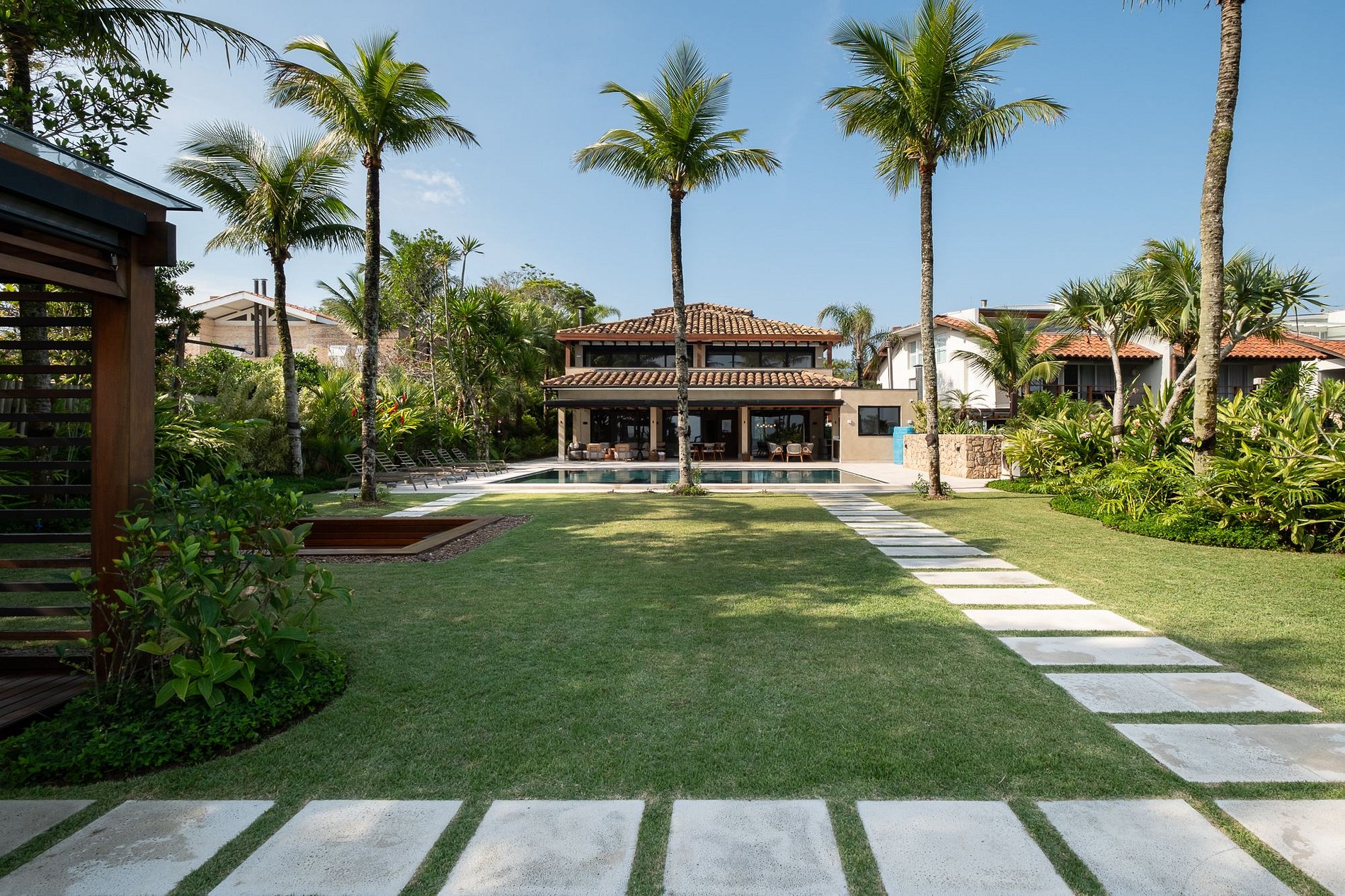 A área externa é um verdadeiro paraíso tropical, com piscina ampla de borda retangular, rodeada por espreguiçadeiras, palmeiras e jardim exuberante.