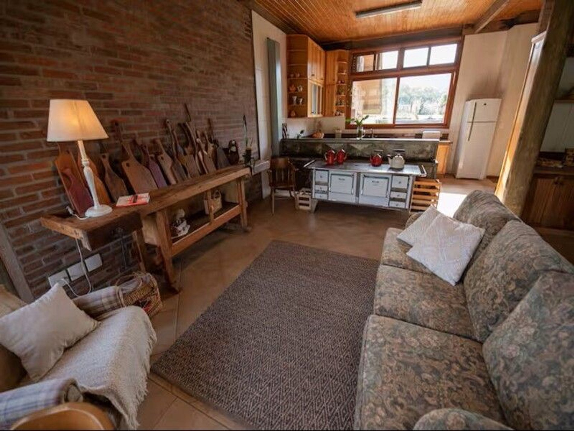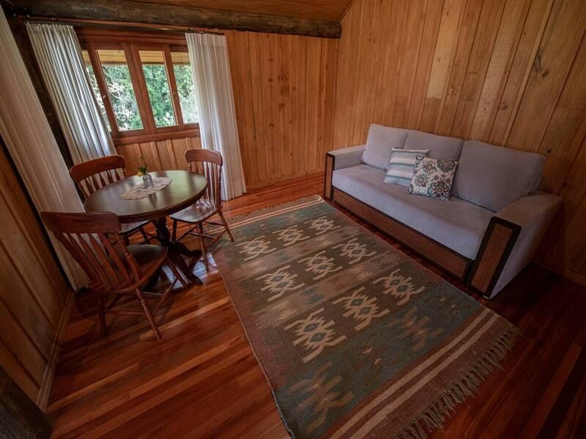A sala de estar é ampla, aconchegante e de uso exclusivo dos hóspedes — o espaço perfeito para boas conversas, jogos e momentos de descanso. O ambiente combina o charme rústico da serra com o conforto de uma hospedagem cuidadosamente preparada.