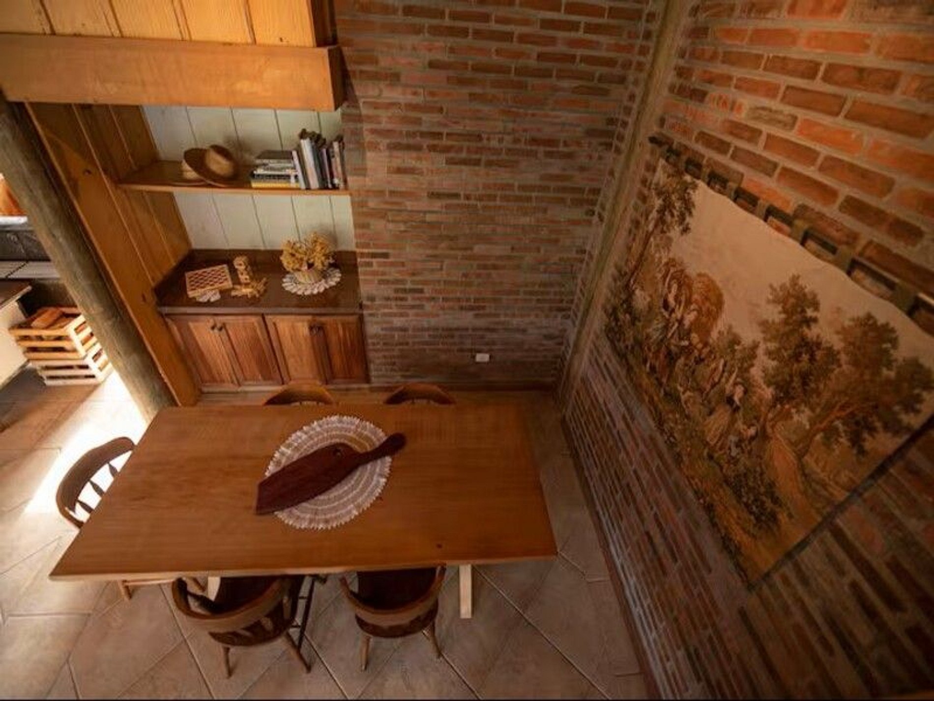 A casa preserva o encanto das antigas construções rurais, com madeira aparente, janelas amplas e ambientes integrados que convidam à convivência.