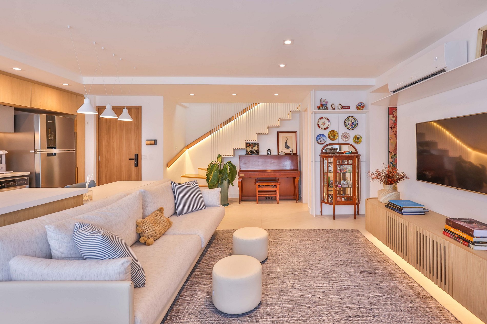 Os espaços de convivência são amplos, confortáveis e muito bem iluminados. A sala de estar integra-se à sala de jantar, criando um ambiente perfeito para relaxar, receber convidados ou compartilhar refeições. A cobertura conta ainda com uma sala de TV adicional, equipada com sofá confortável, ideal para momentos de descanso e entretenimento.
