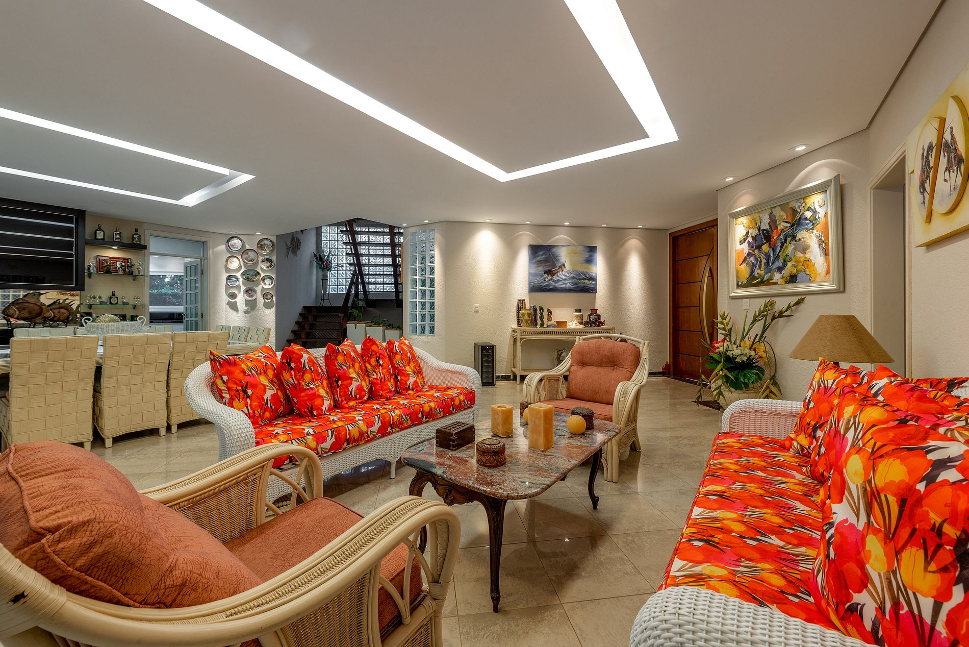 Casa com 6 suítes sendo 1 máster com 2 banheiros e com 1 dt. na parte inferior, 8 banheiros no total.
