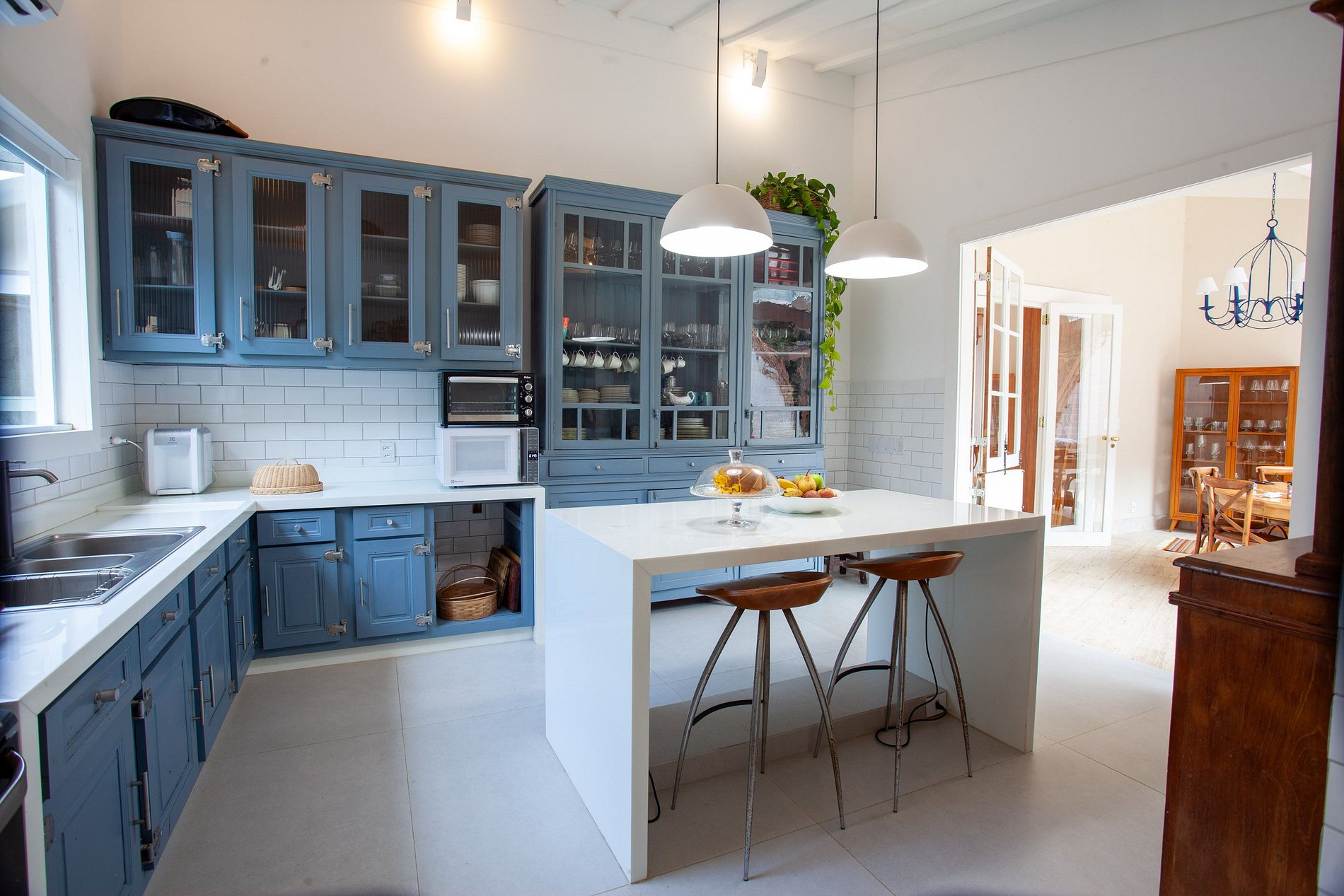 Cozinha completa com armários, eletrodomésticos e utensílios necessários para todo tipo de refeição.