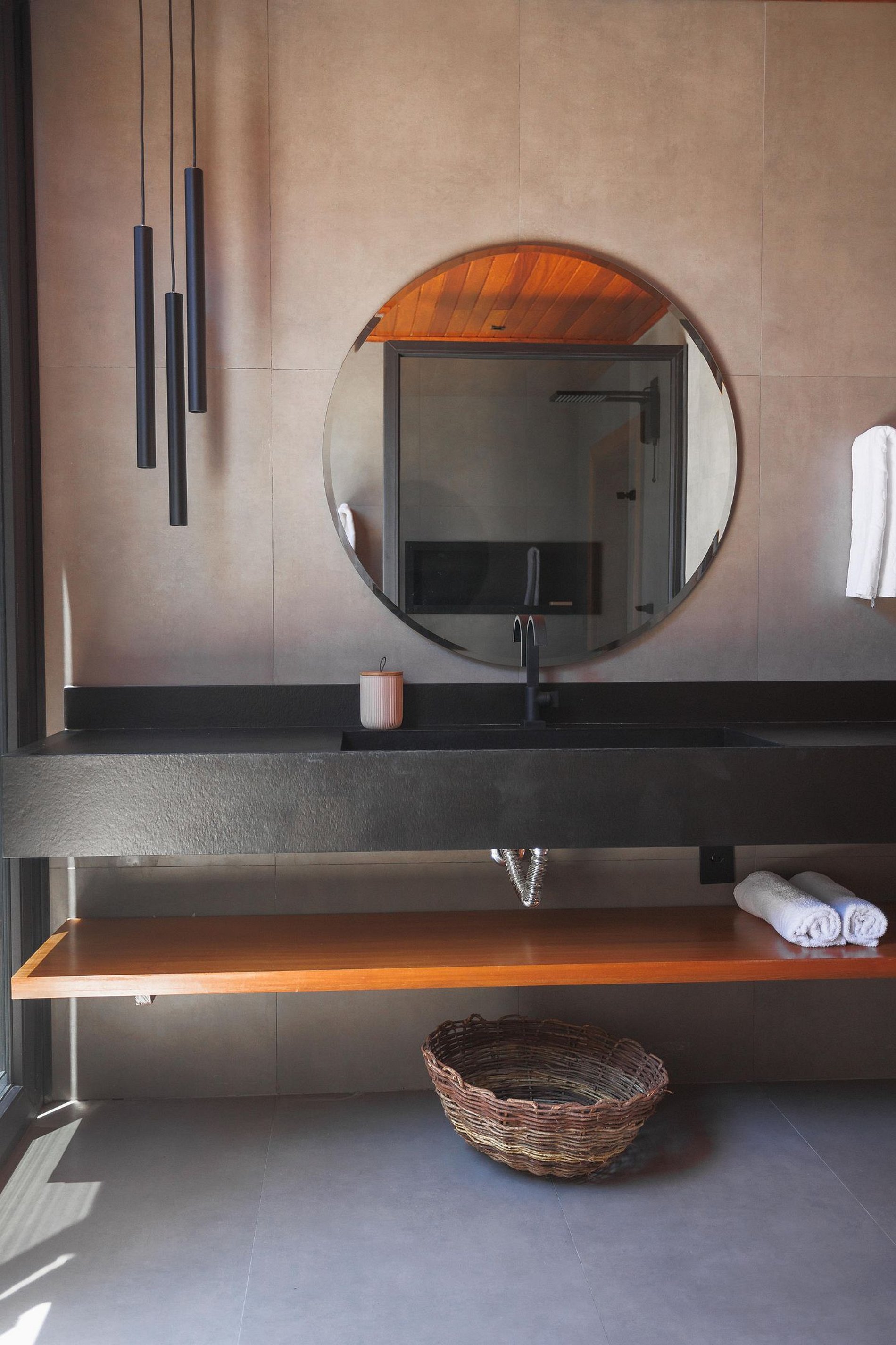 A casa se destaca pela amplitude e luminosidade, proporcionadas pelas portas de correr que integram os ambientes internos à beleza natural do exterior. Ao lado, a aconchegante sala de estar, decorada com tons neutros e elegantes, oferece sofás e poltronas confortáveis, além de uma mesa de madeira redonda para oito pessoas e outra maior, com capacidade para acomodar também oito pessoas, perfeita para momentos de convivência.