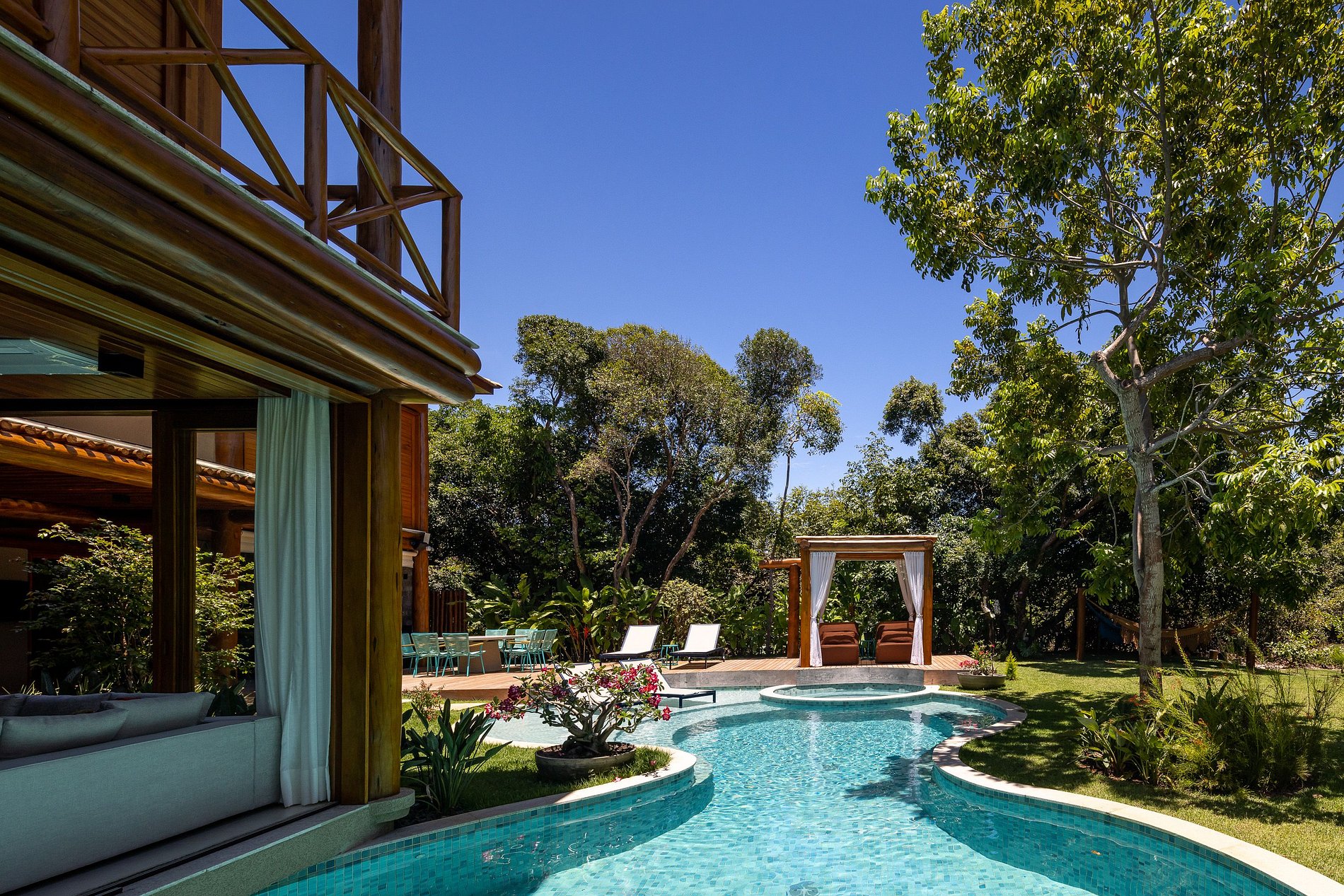 Área externa e demais ambientes com mobiliário de alto padrão. Piscina com vários níveis de profundidade, hidromassagem aquecida ao lado da piscina, redário e mobiliário confortável para descanso e meditação. Mesa redonda com 08 lugares.