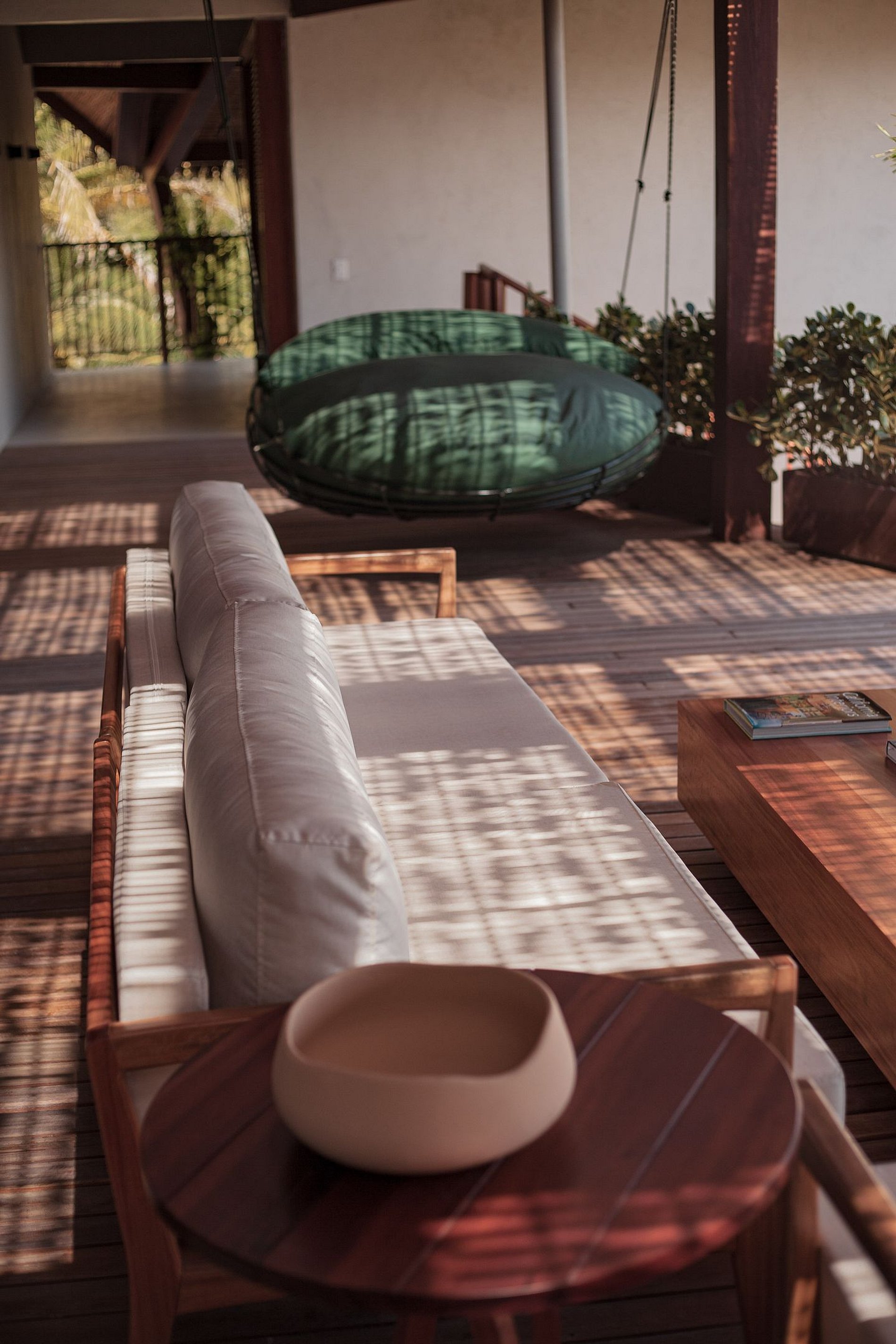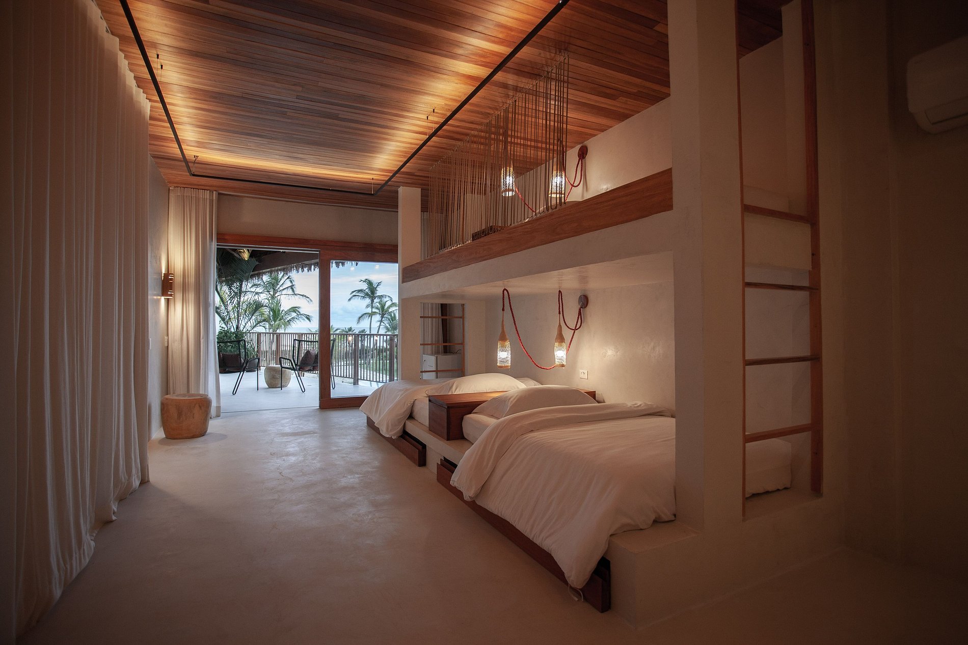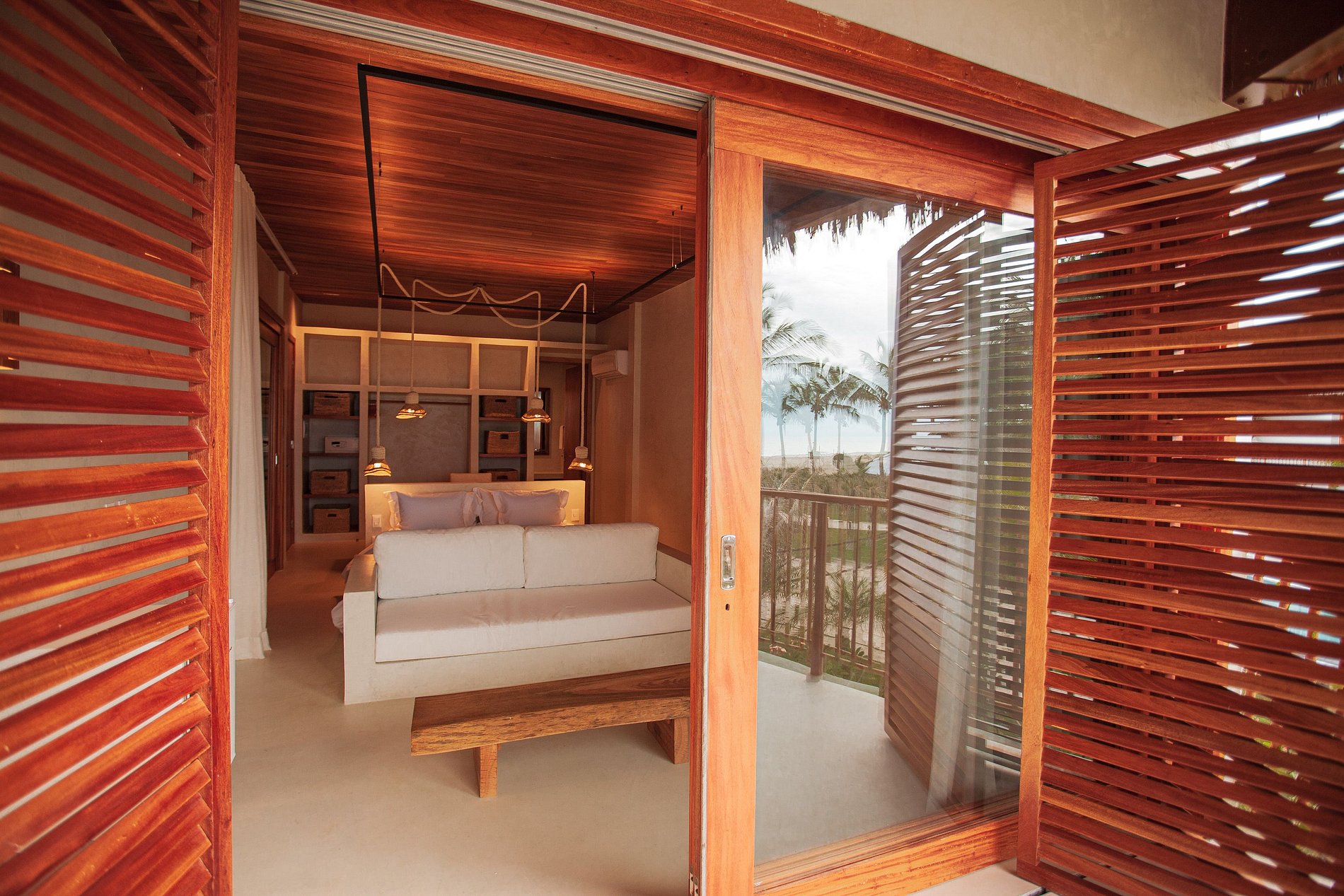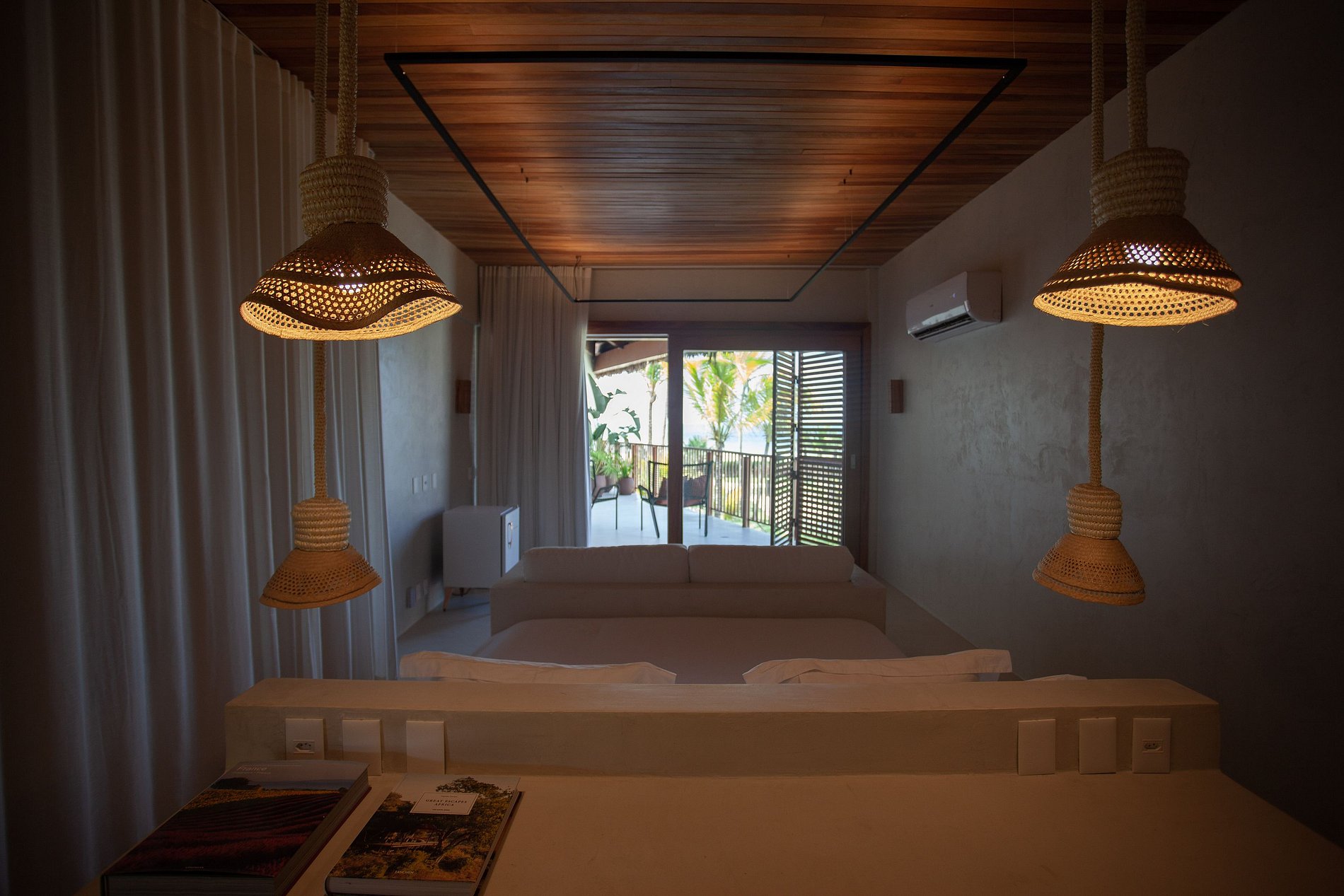Ambientes arejados e bem iluminados, com mobiliário elegante e confortável, e uma decoração sofisticada e contemporânea, mantendo o estilo praiano. Sala de estar integrada à sala de jantar, num ambiente com pé-direito duplo e charmosas esteiras de bambu revestindo o teto. A parte de lazer interna da casa é de encantar, com um aconchegante home theater, brinquedoteca com mesa de pingue-pongue e mesa de jogos e um spa com sauna e ofurô.