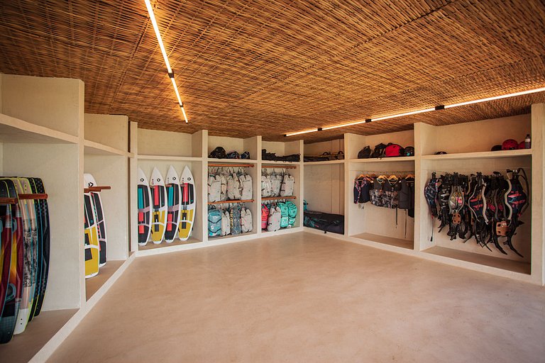 Linda piscina com prainha, e um deck de madeira com confortáveis espreguiçadeiras para relaxar ao sol. A casa dispõe ainda de quadras de tênis e beach tênis, academia e equipamentos e equipe de supervisão para prática de kitesurf.