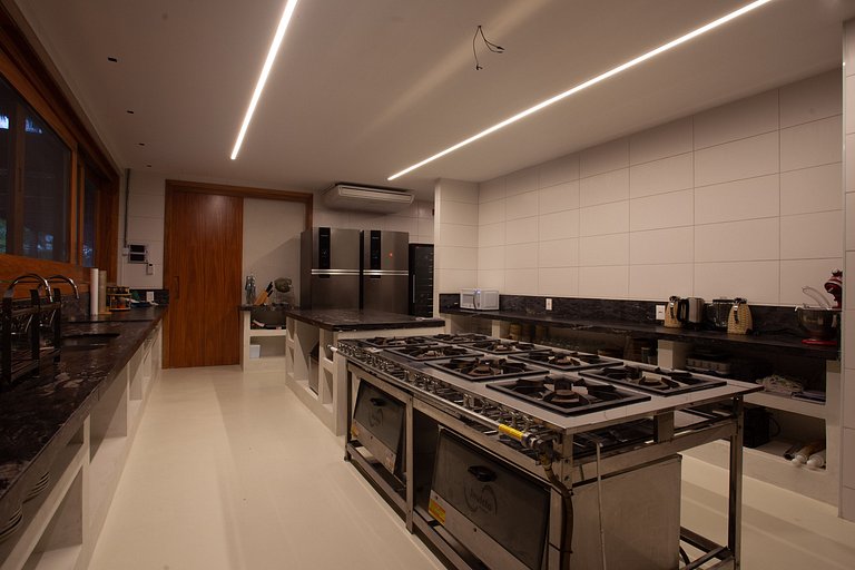 Espaçosa e clara, a cozinha é completa, com armários, diversos utensílios de cozinha para o preparo de qualquer tipo de refeição, além de eletrodomésticos e eletroportáteis de primeira linha, como os dois belos fogões industriais que se destacam no centro do ambiente.