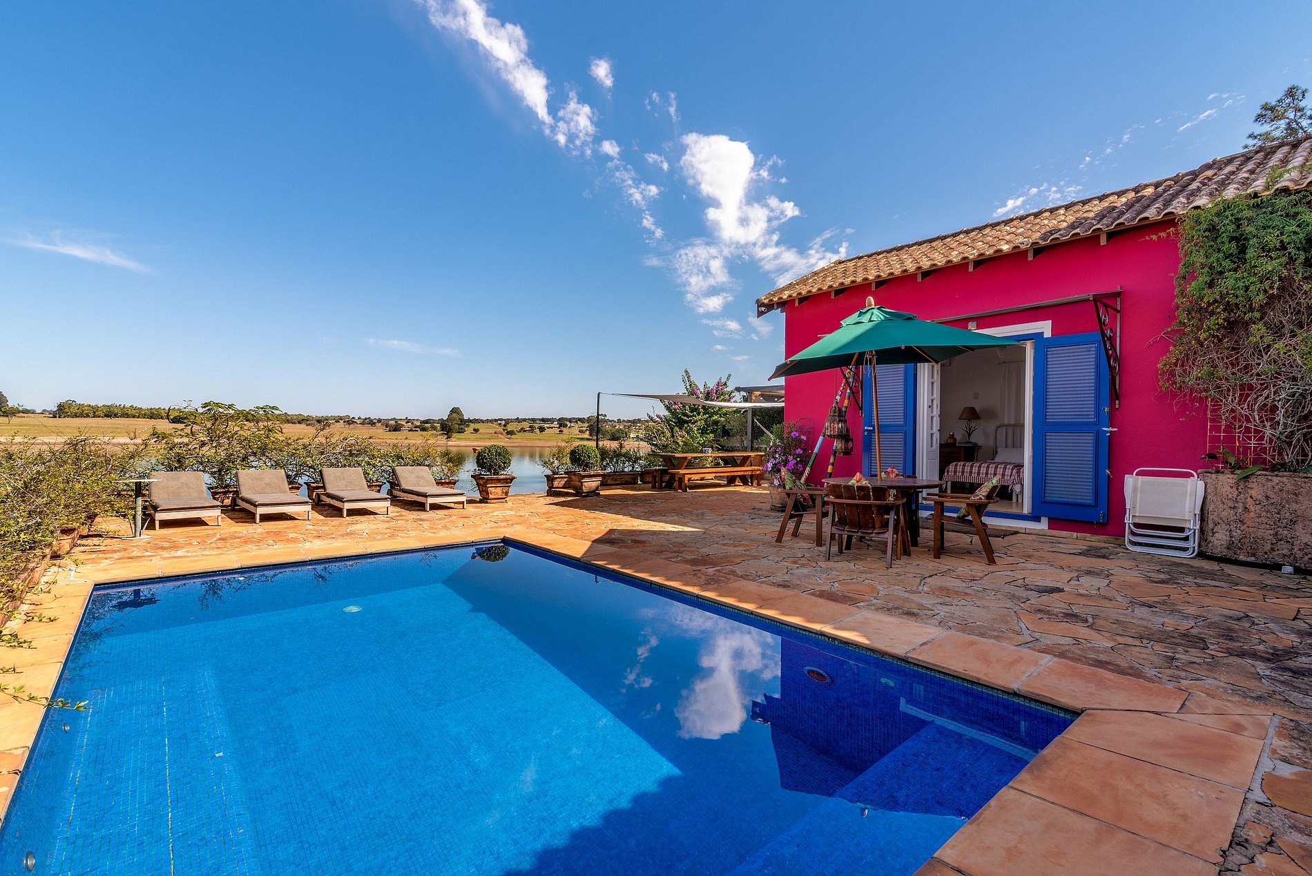 Construção moderna e sofisticada, com espaços amplos, mobiliário bonito e confortável e decoração discreta e harmoniosa. Ideal para quem busca descanso com privacidade e requinte.