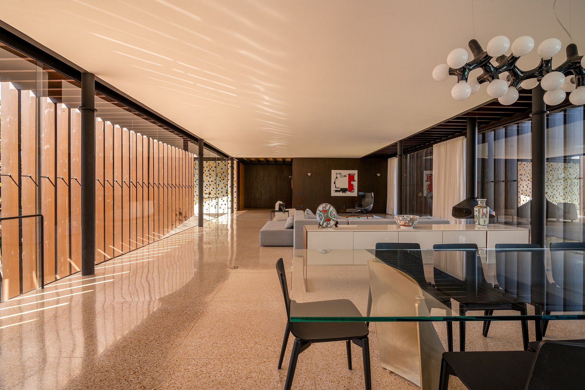 Ambientes arejados e bem iluminados; sala de jantar, com vista para a piscina e o espaço gourmet, se integrada à sala de estar com lareira suspensa em um belíssimo ambiente cercado por paredes de vidro que permitem a entrada de bastante luz natural. Mobiliário e decoração modernos e sofisticados, com obras de arte se destacam na decoração.