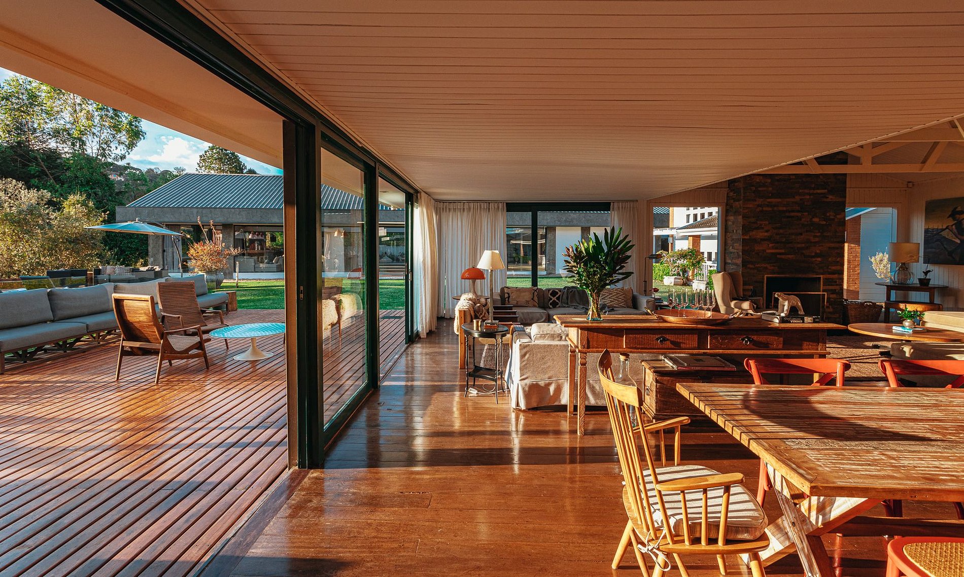 Ambientes amplos, arejados e bem iluminados; sala de estar principal integrada a cozinha gourmet, e com vista privilegiada da natureza que cerca a casa. Sala de televisão exclusiva, onde é possível assistir a filmes e séries a qualquer hora do dia, sem ser incomodado. Mobiliário sofisticado e confortável, e décor contemporâneo e elegante.
