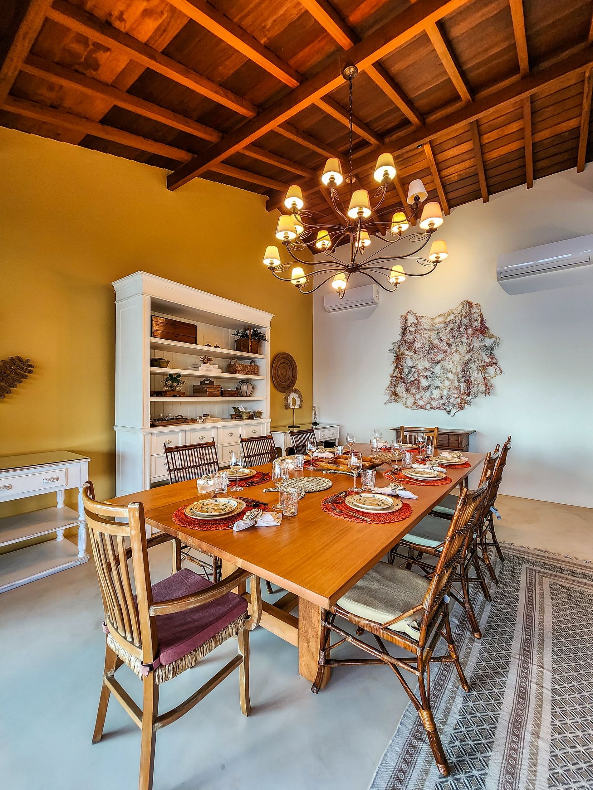 Ambientes amplos e integrados garantem bem-estar em todos os momentos. A sala de estar, com lareira e mobiliário aconchegante, convida à contemplação e ao relaxamento. A sala de jantar, com mesa para oito pessoas, é perfeita para refeições memoráveis entre família e amigos.