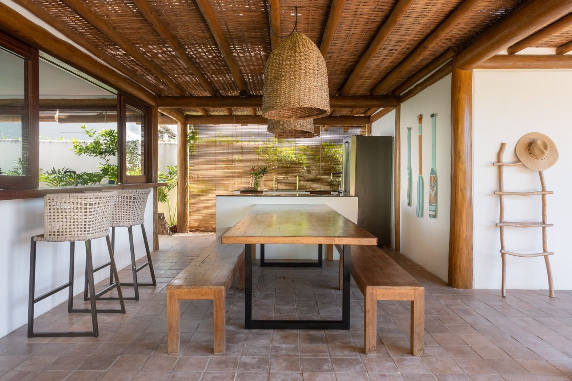 A área gourmet com churrasqueira é perfeita para receber família e amigos. O terraço e a varanda com redes oferecem espaços ideais para relaxar, enquanto o jardim privativo emoldura a piscina exclusiva da casa. Para os amantes do mar, há ainda caiaque disponível para uso (mediante consulta prévia para agendamento).