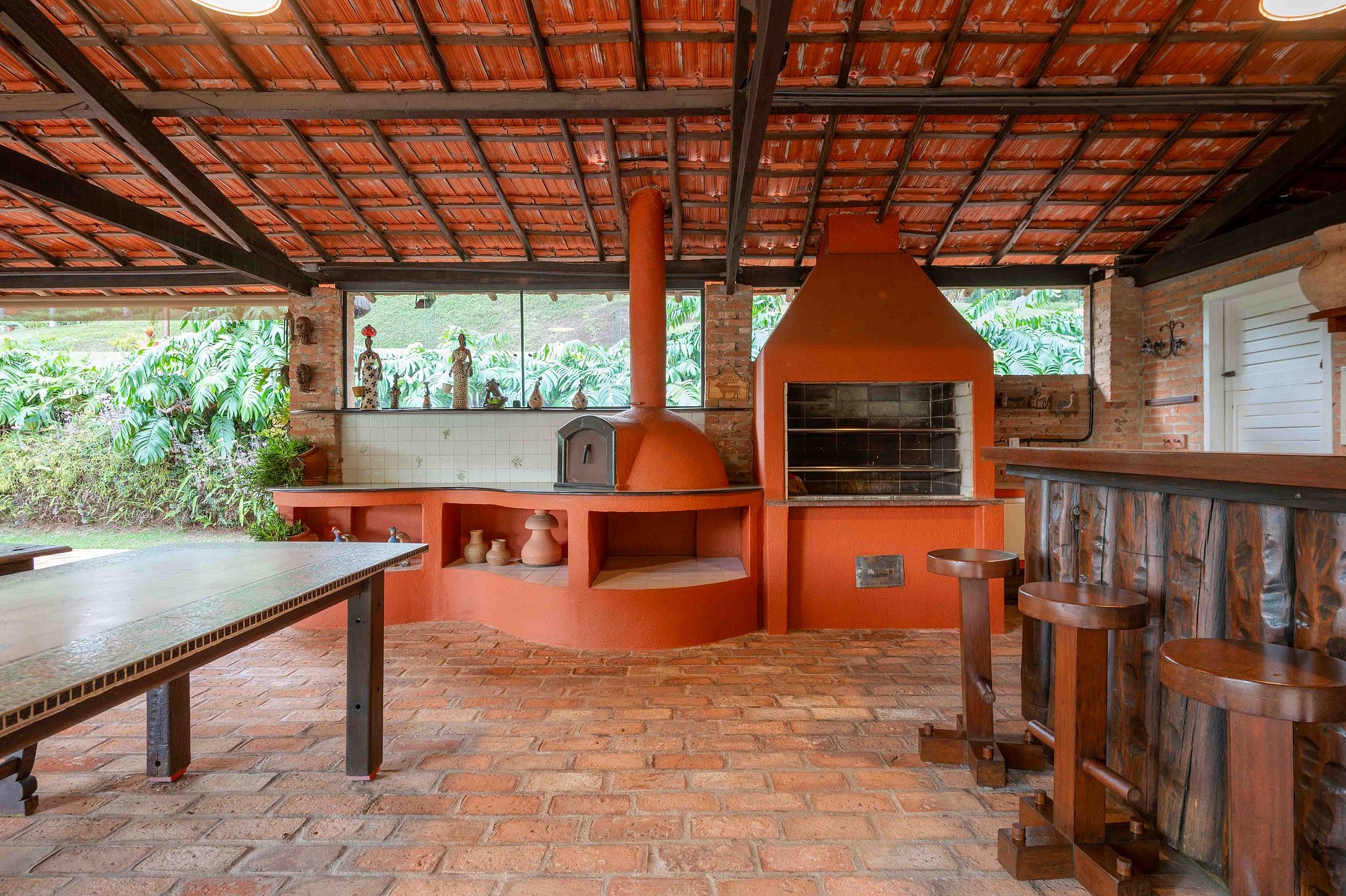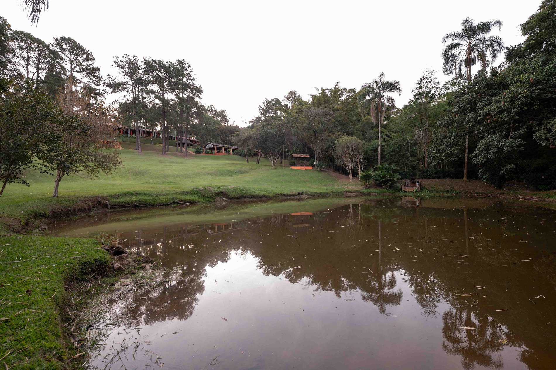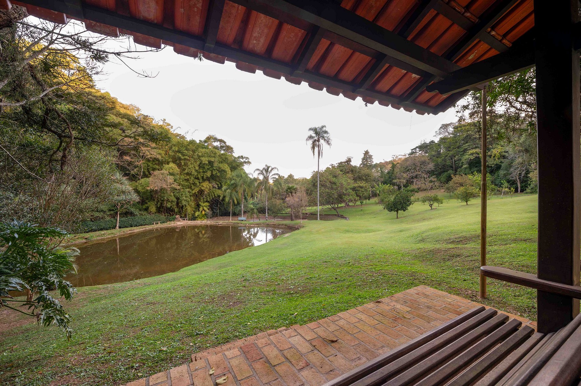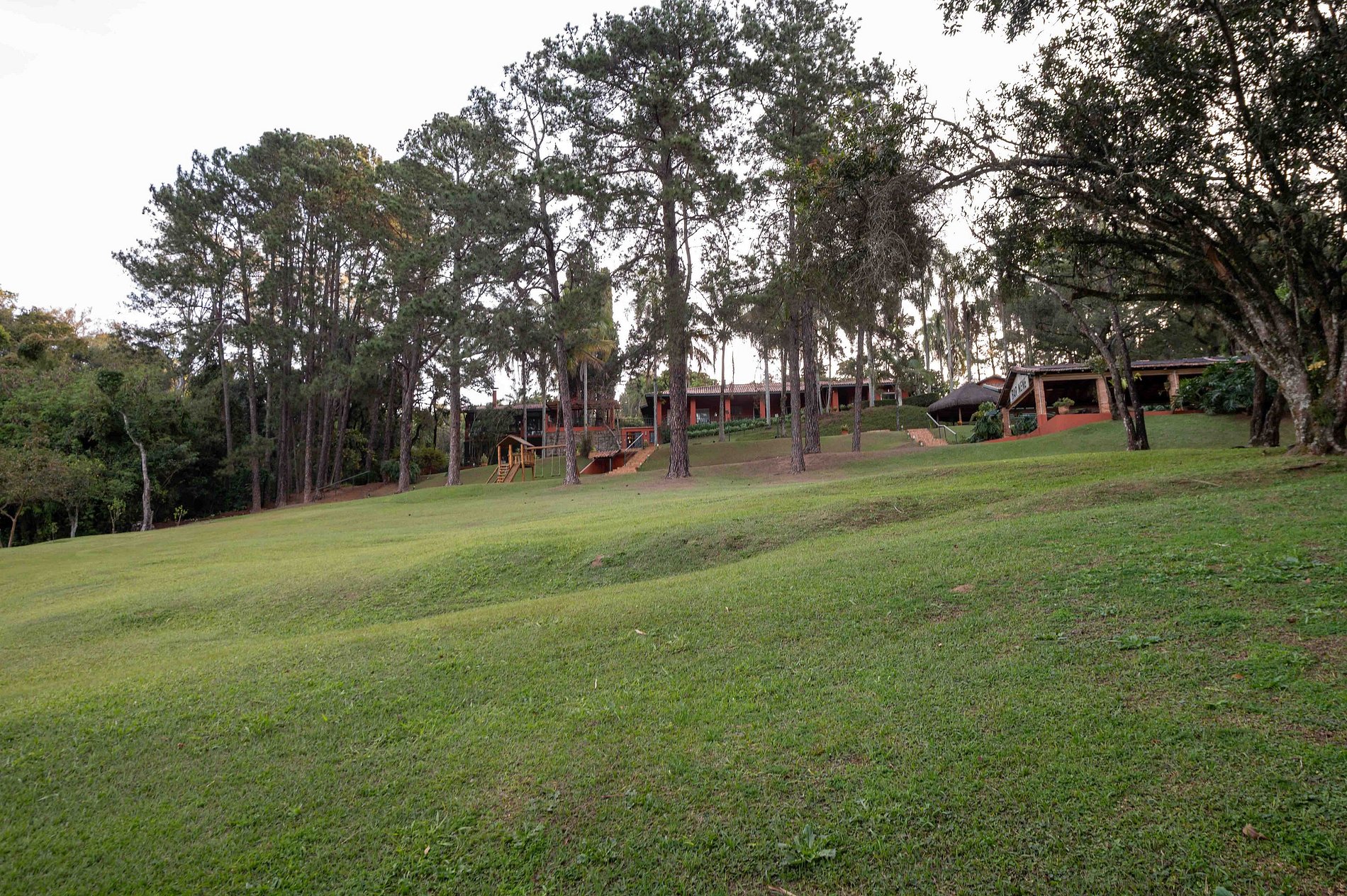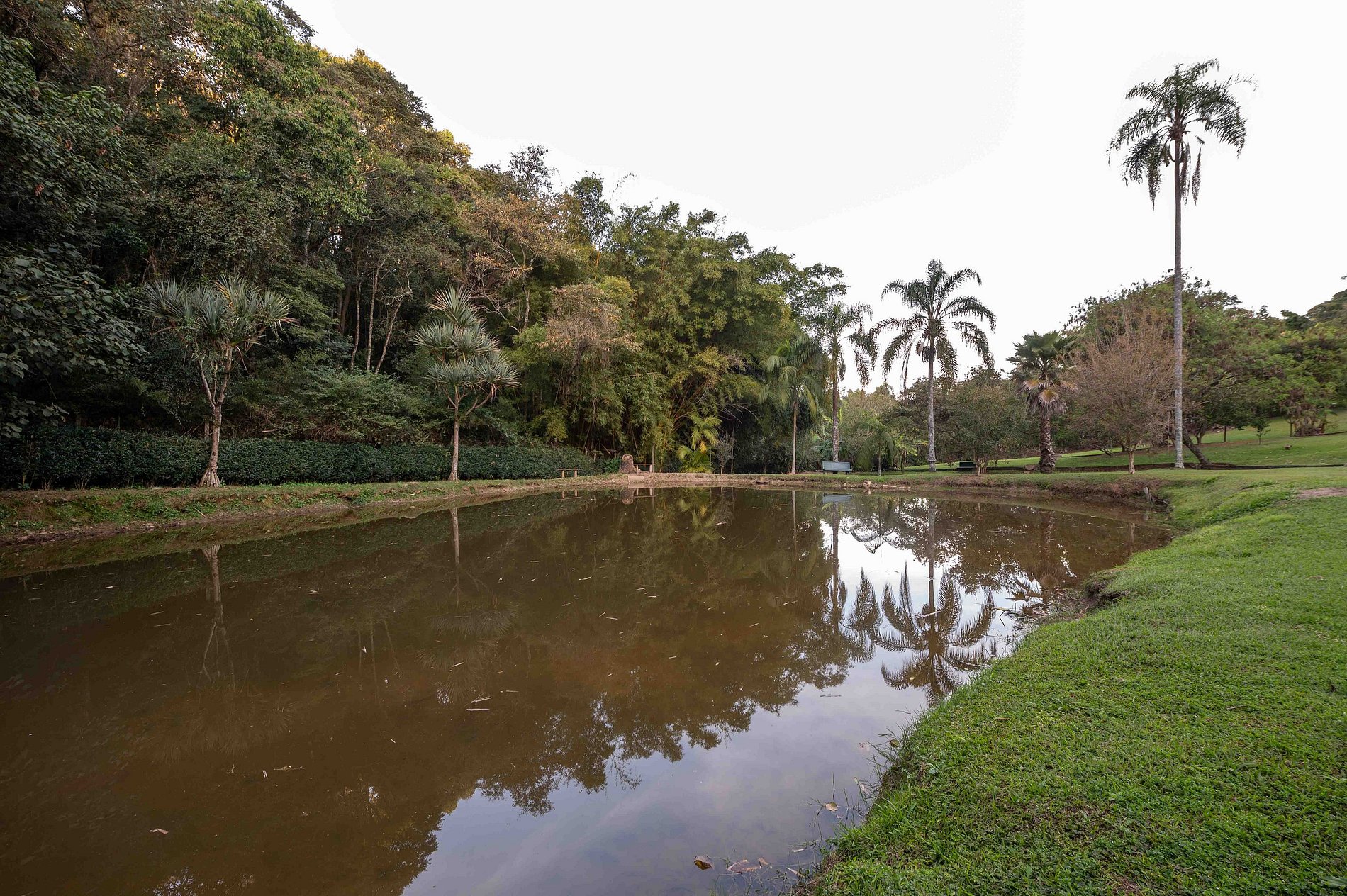 Com 909,02 m², a casa sede foi construída em posição estratégica, oferecendo vista espetacular para a piscina, churrasqueira, lagos e pomar.