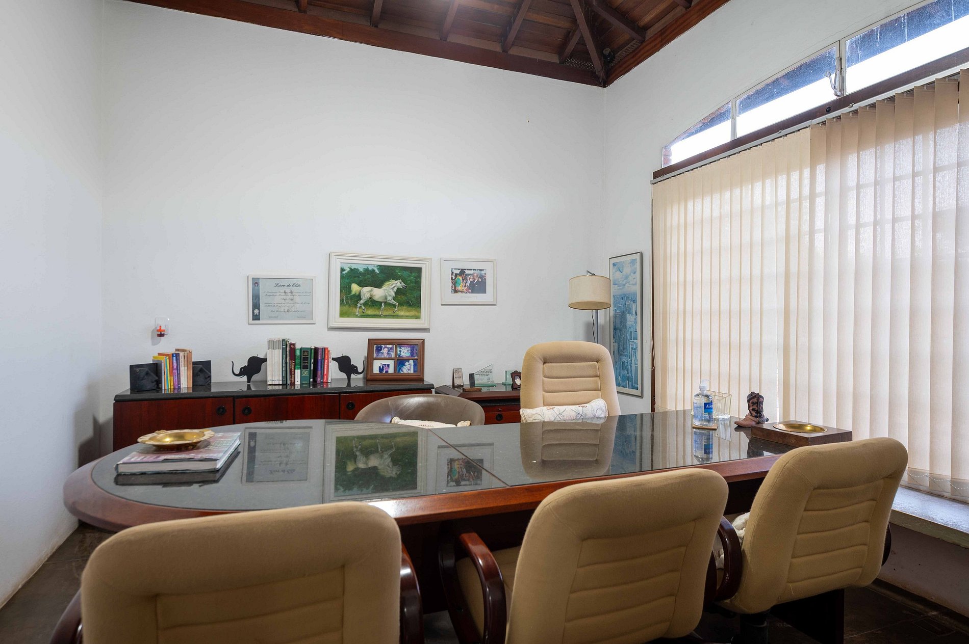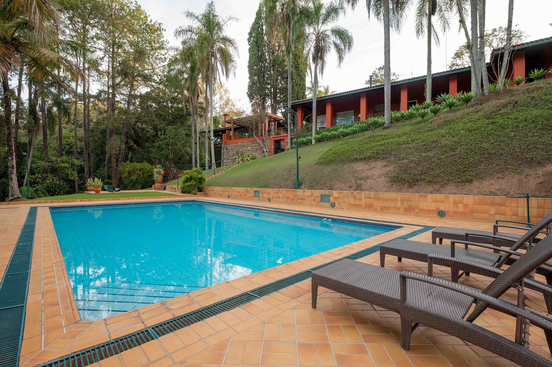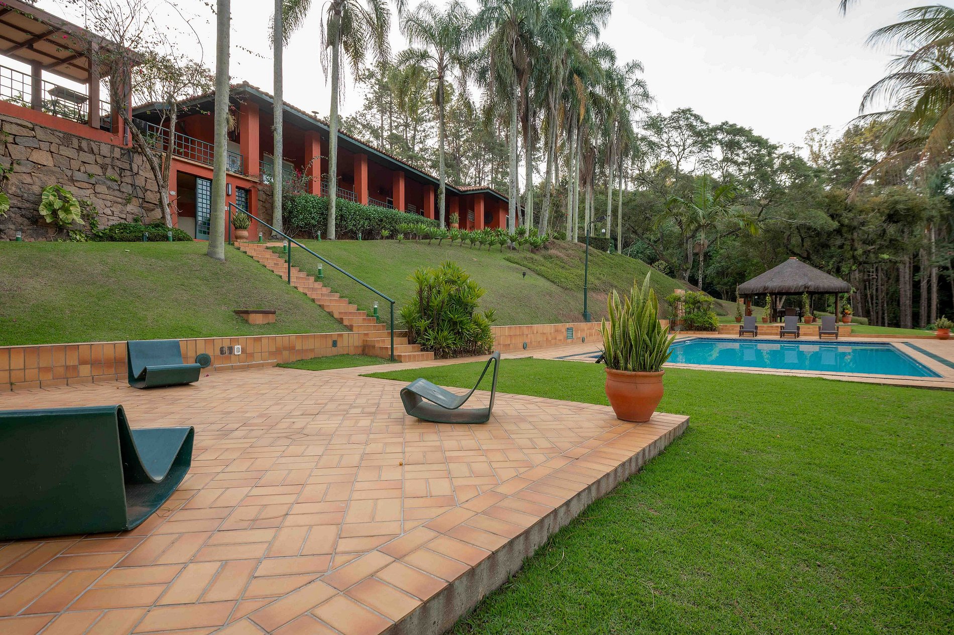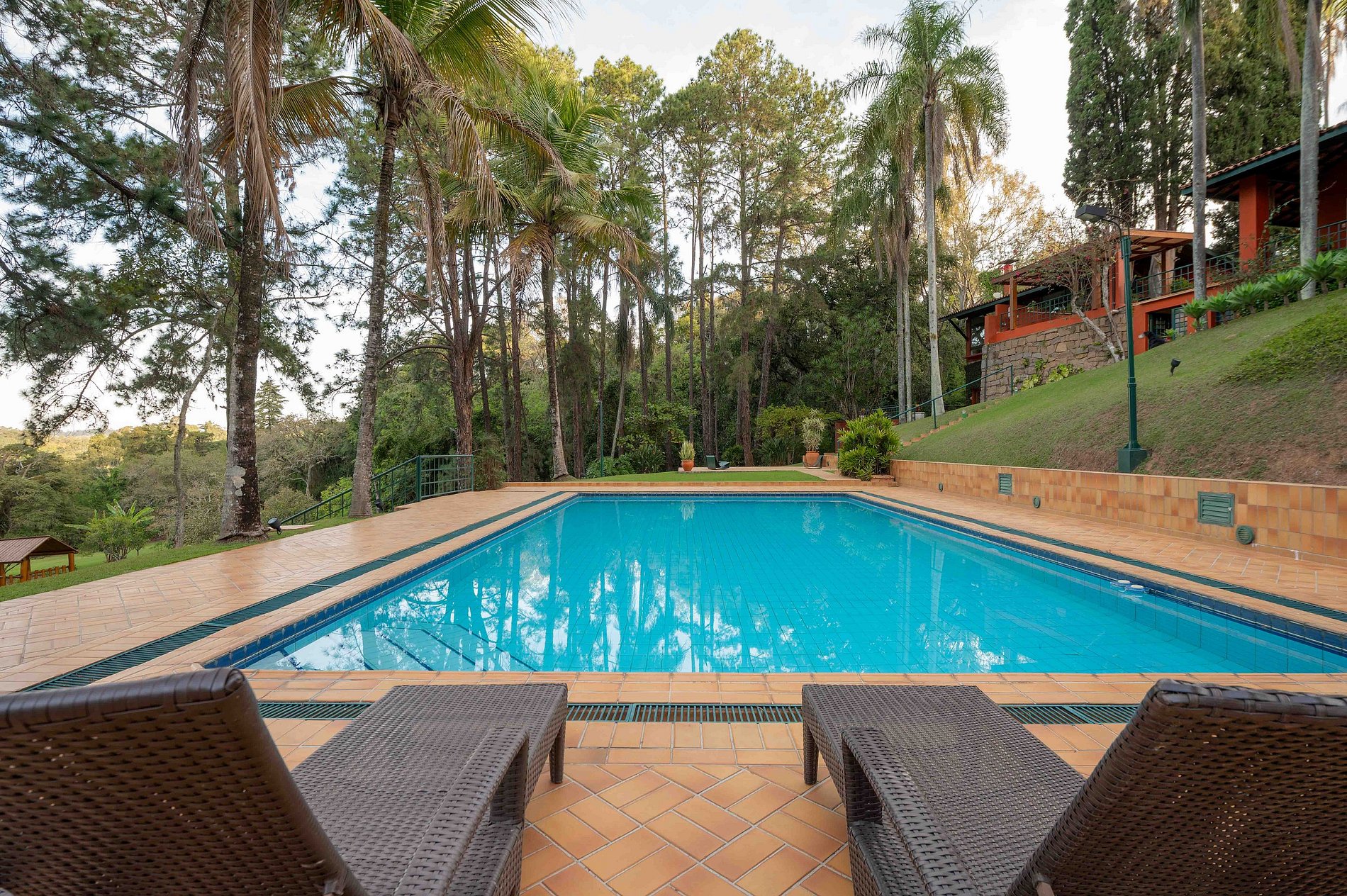 Com 909,02 m², a casa sede foi construída em posição estratégica, oferecendo vista espetacular para a piscina, churrasqueira, lagos e pomar.