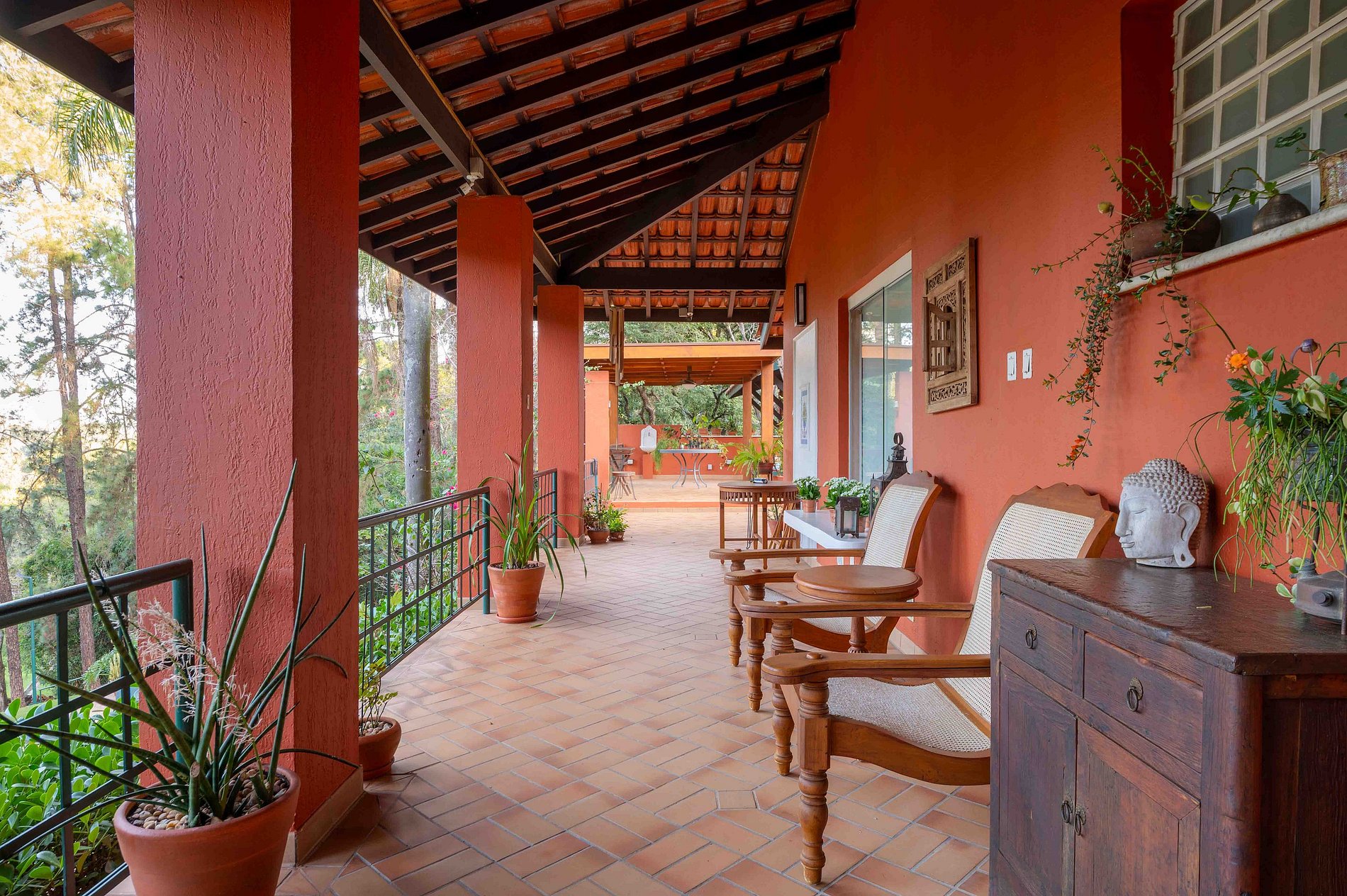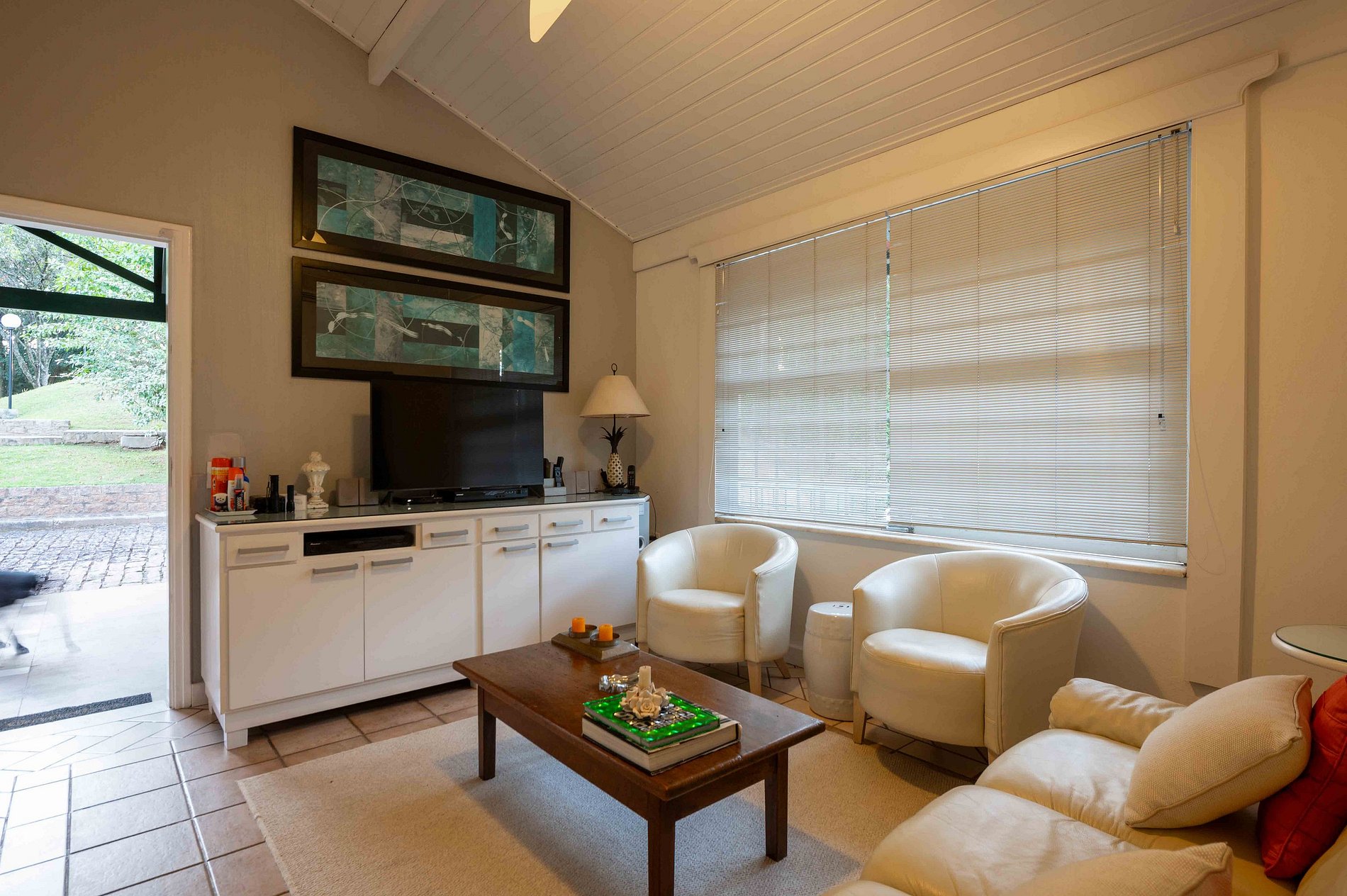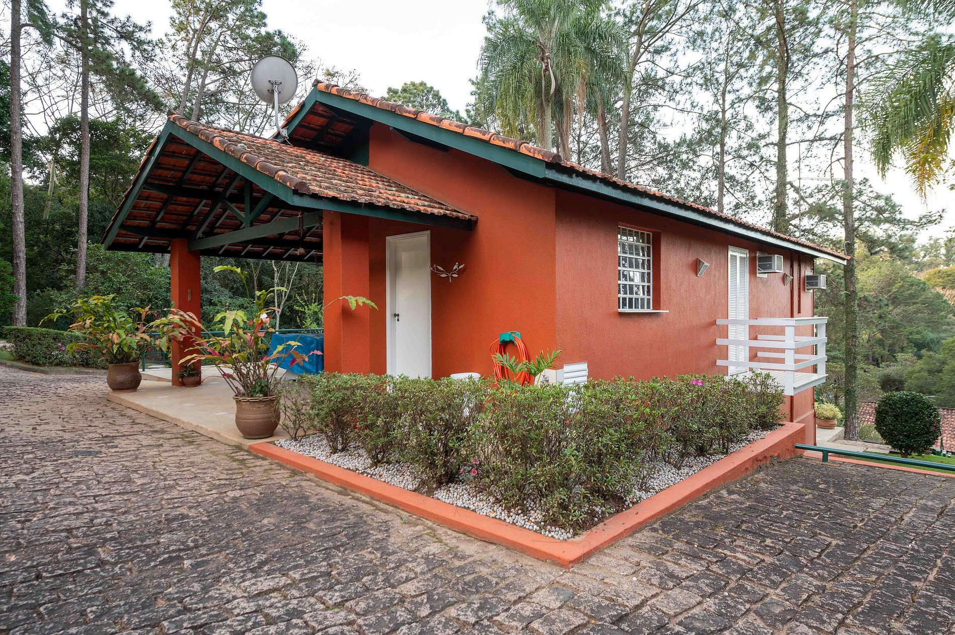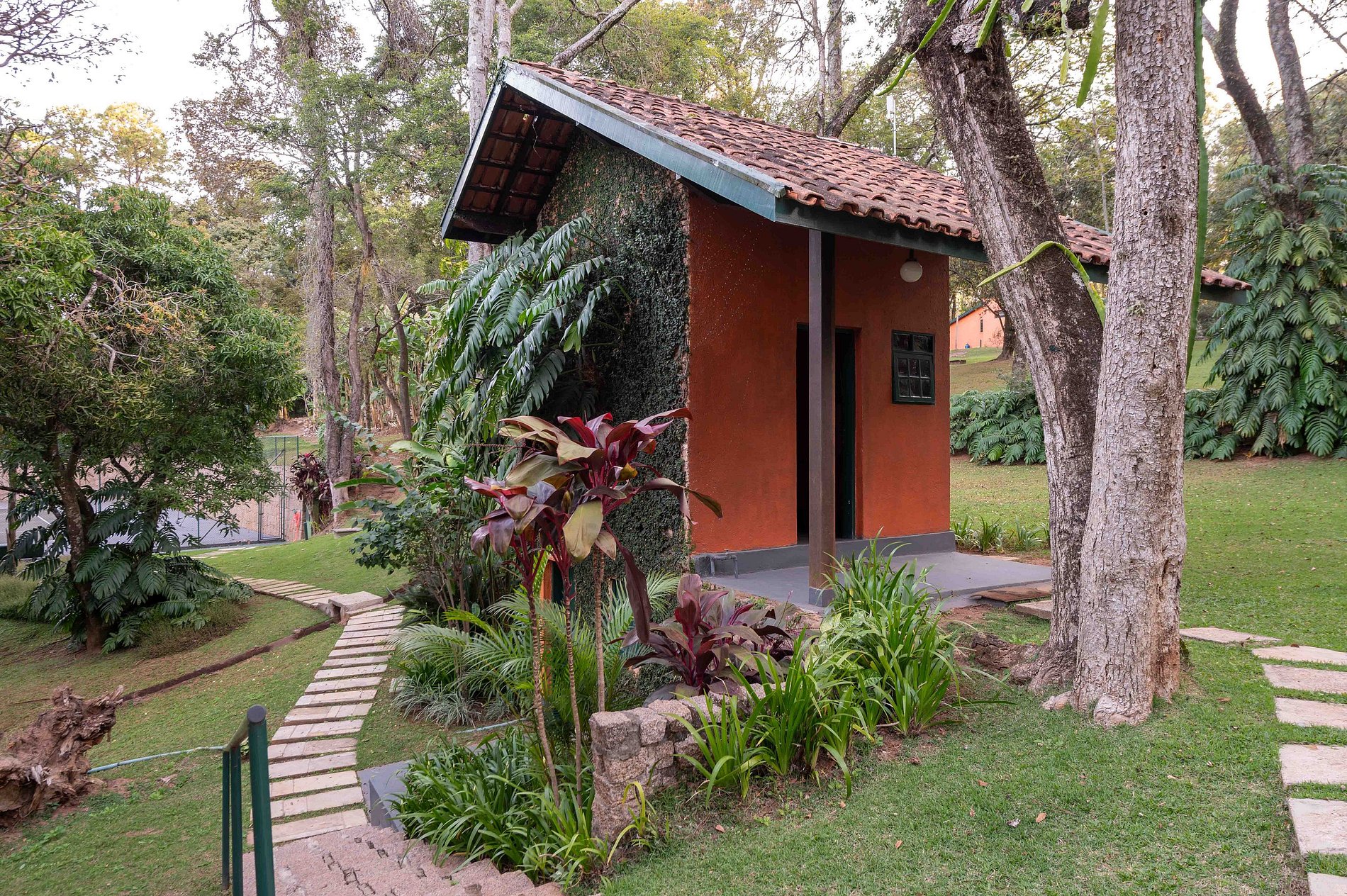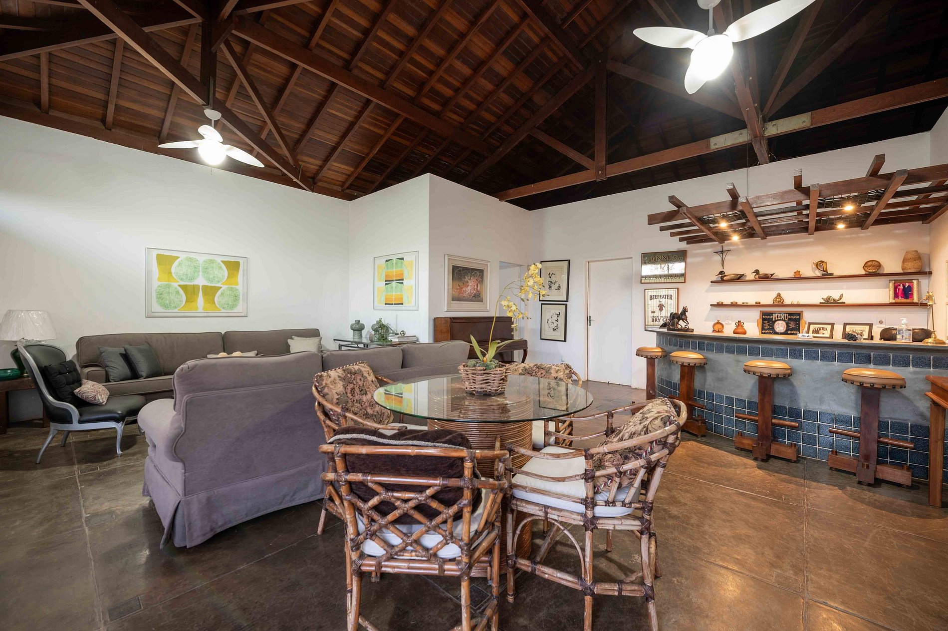 Com 909,02 m², a casa sede foi construída em posição estratégica, oferecendo vista espetacular para a piscina, churrasqueira, lagos e pomar.