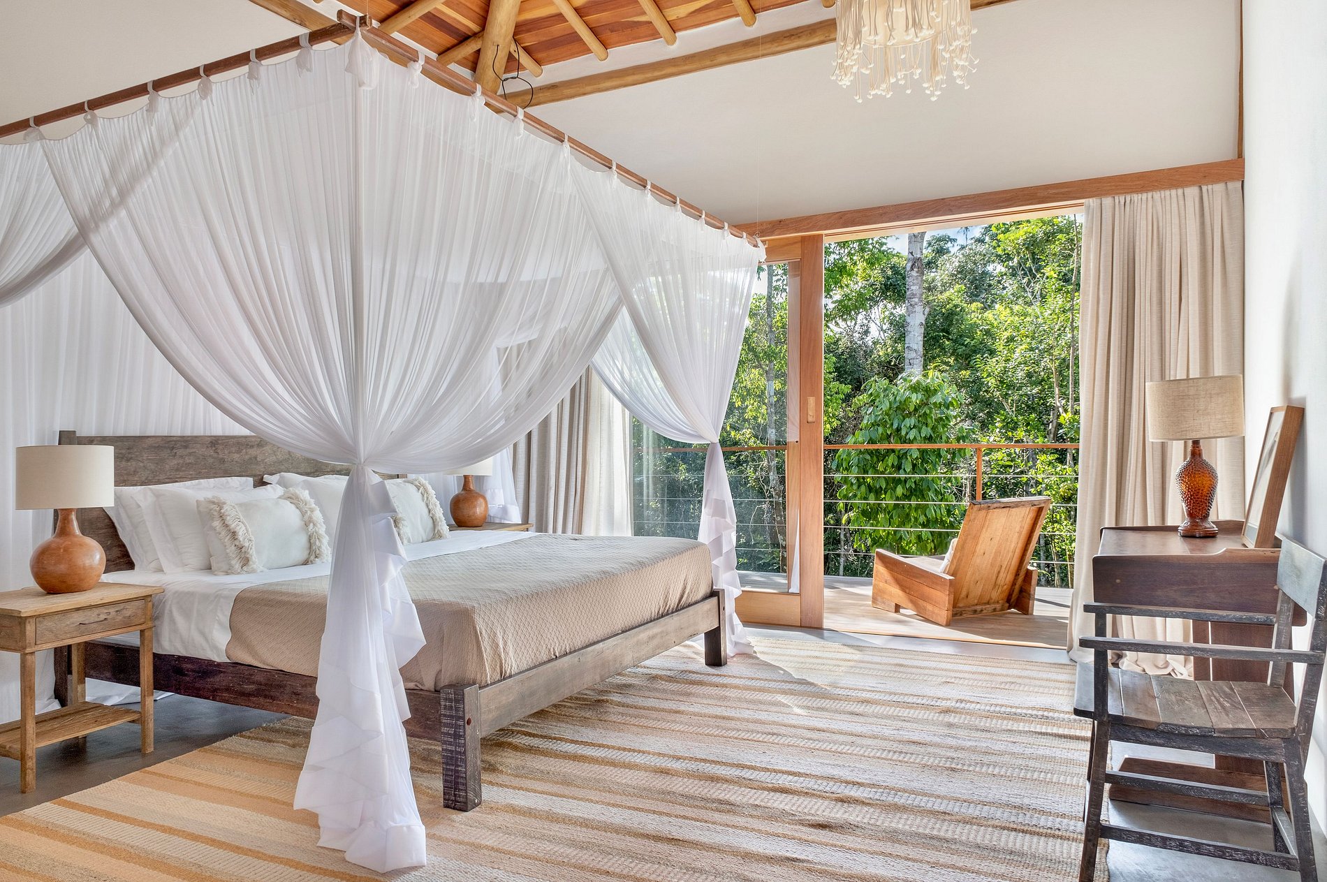 Suíte 05: 01 Cama de casal king size, mosquiteiro, cortinas com blecaute, ar condicionado, mesa de trabalho, banheiro com jardim e varanda