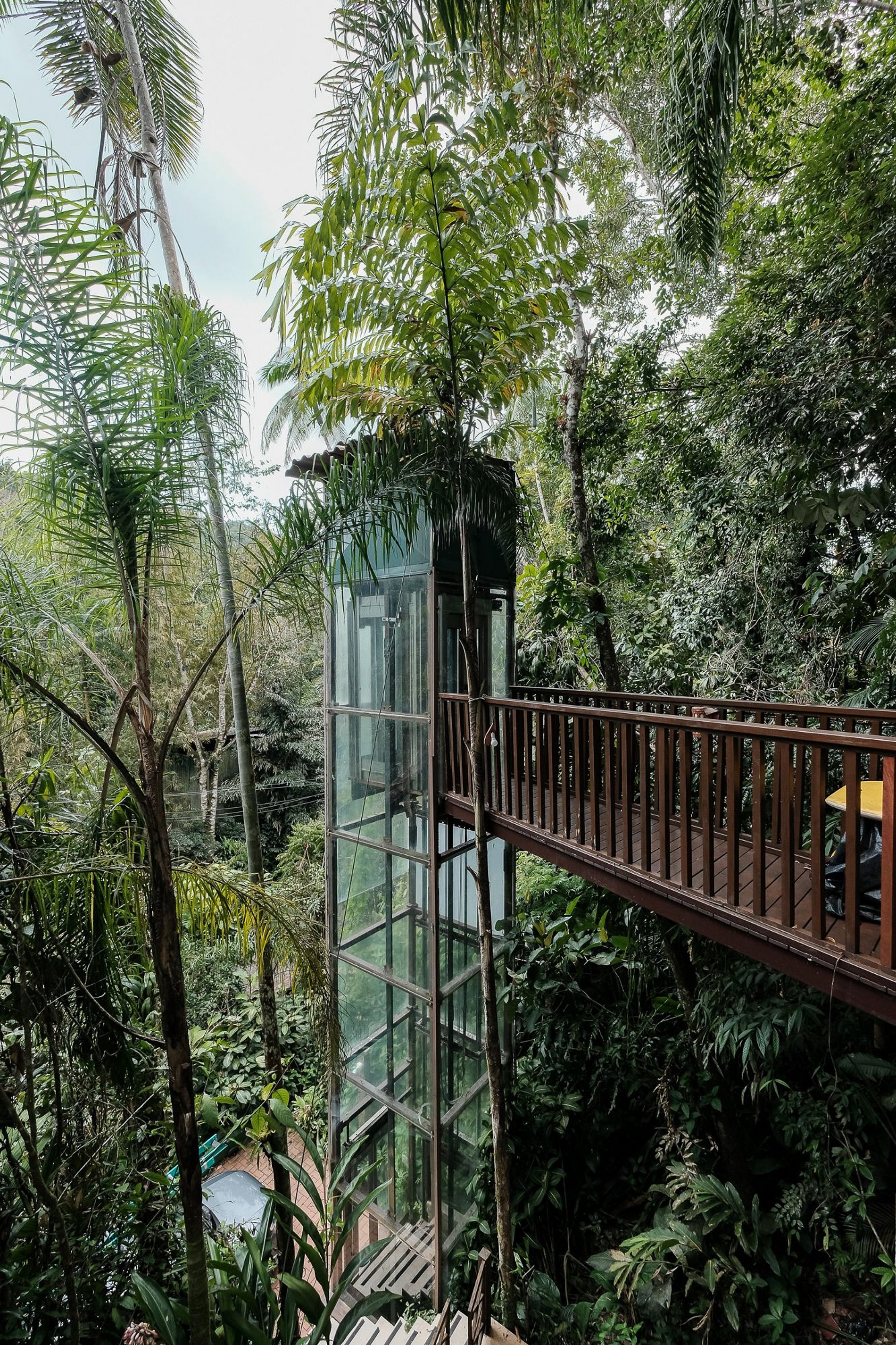• Amplo terraço coberto no último andar, equipado com mesas e sofás, ideal para contemplar a vista deslumbrante da mata.