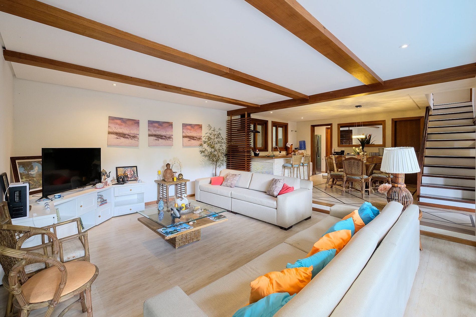 • Sala espaçosa e iluminada, integrando ambientes de estar, jantar, TV e uma moderna cozinha americana.
