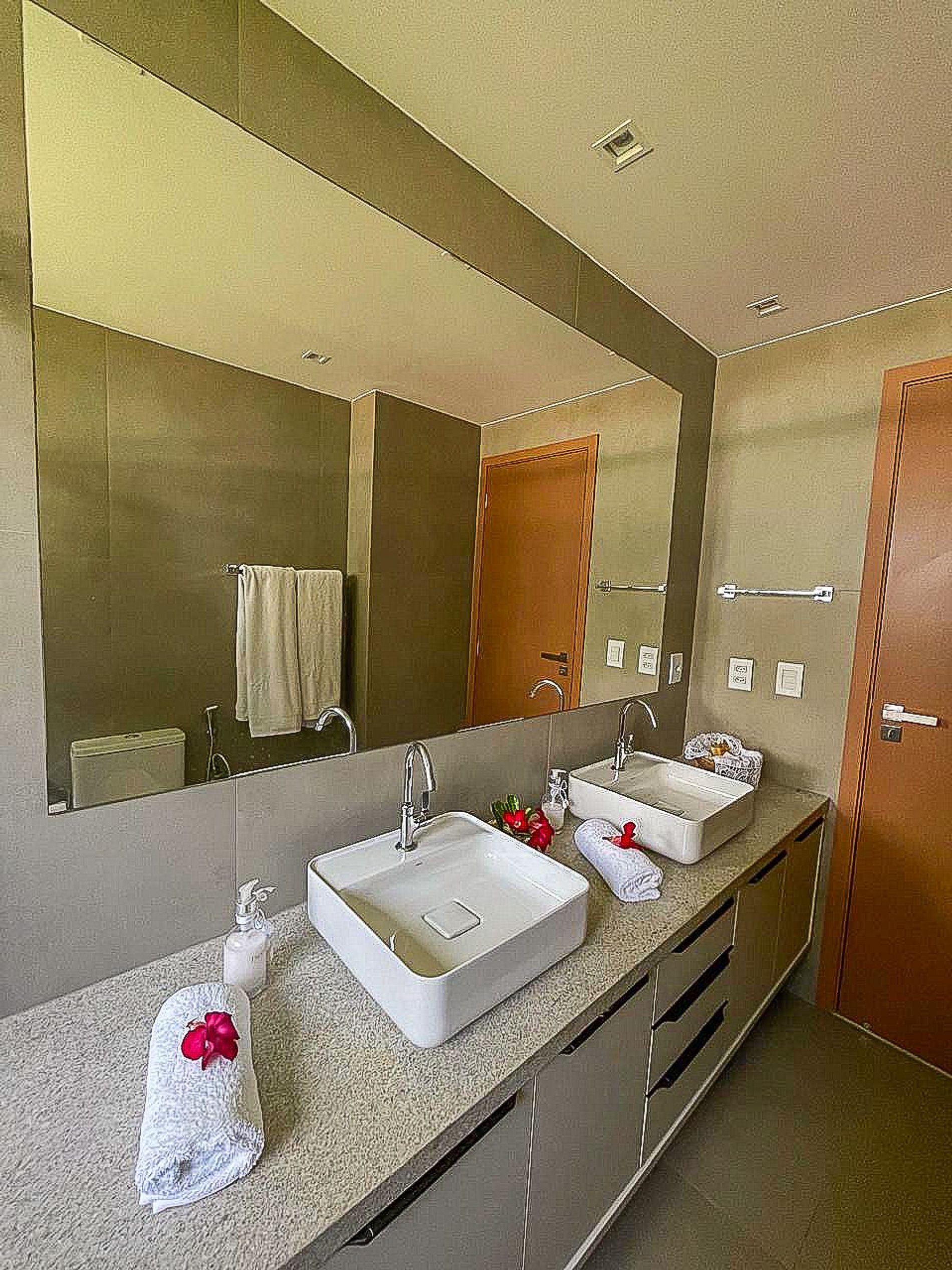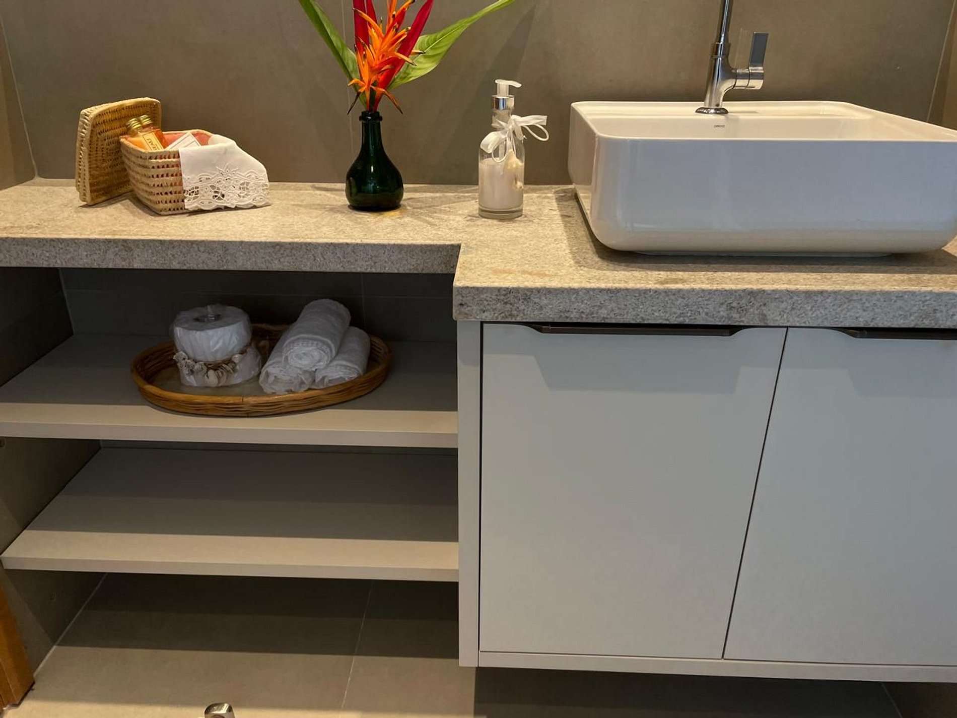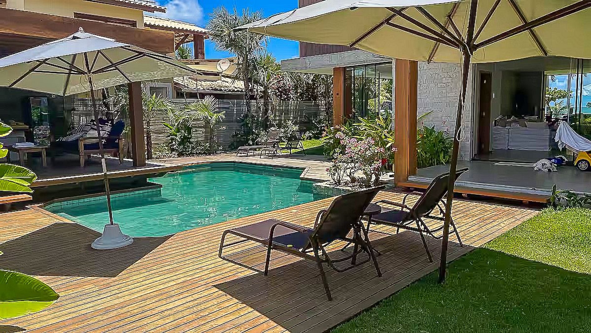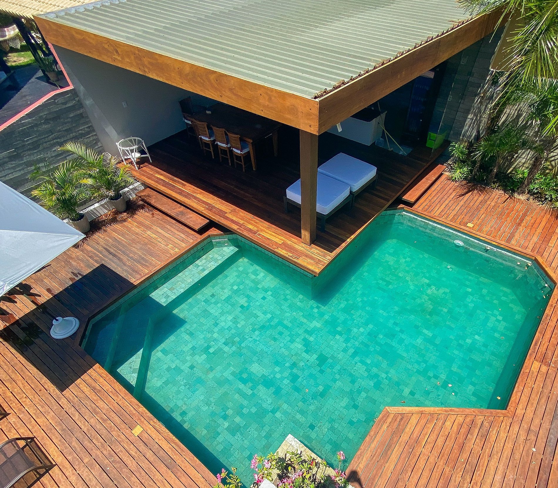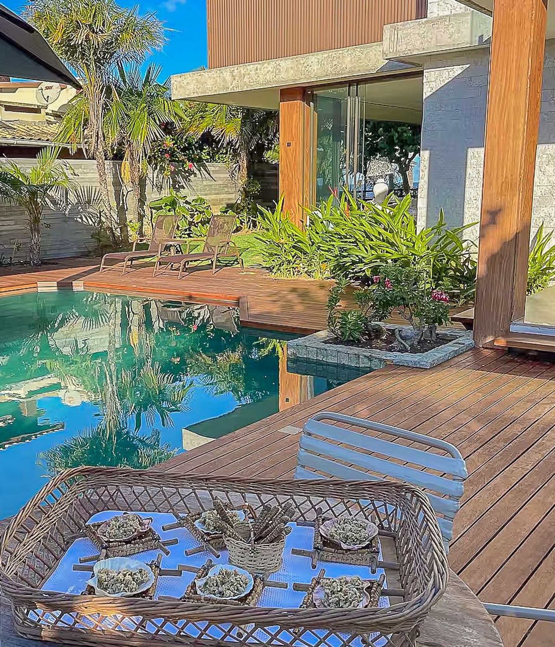 A piscina, revestida em pedra hijau e ladeada por um charmoso deck de madeira, é perfeita para se refrescar nos dias quentes da Bahia. Integrado a ela está o espaço gourmet completo, com parrilla, churrasqueira, bar com freezer, adega e área coberta para refeições — um ambiente ideal para encontros descontraídos, almoços ao ar livre e jantares especiais com os pés na areia.