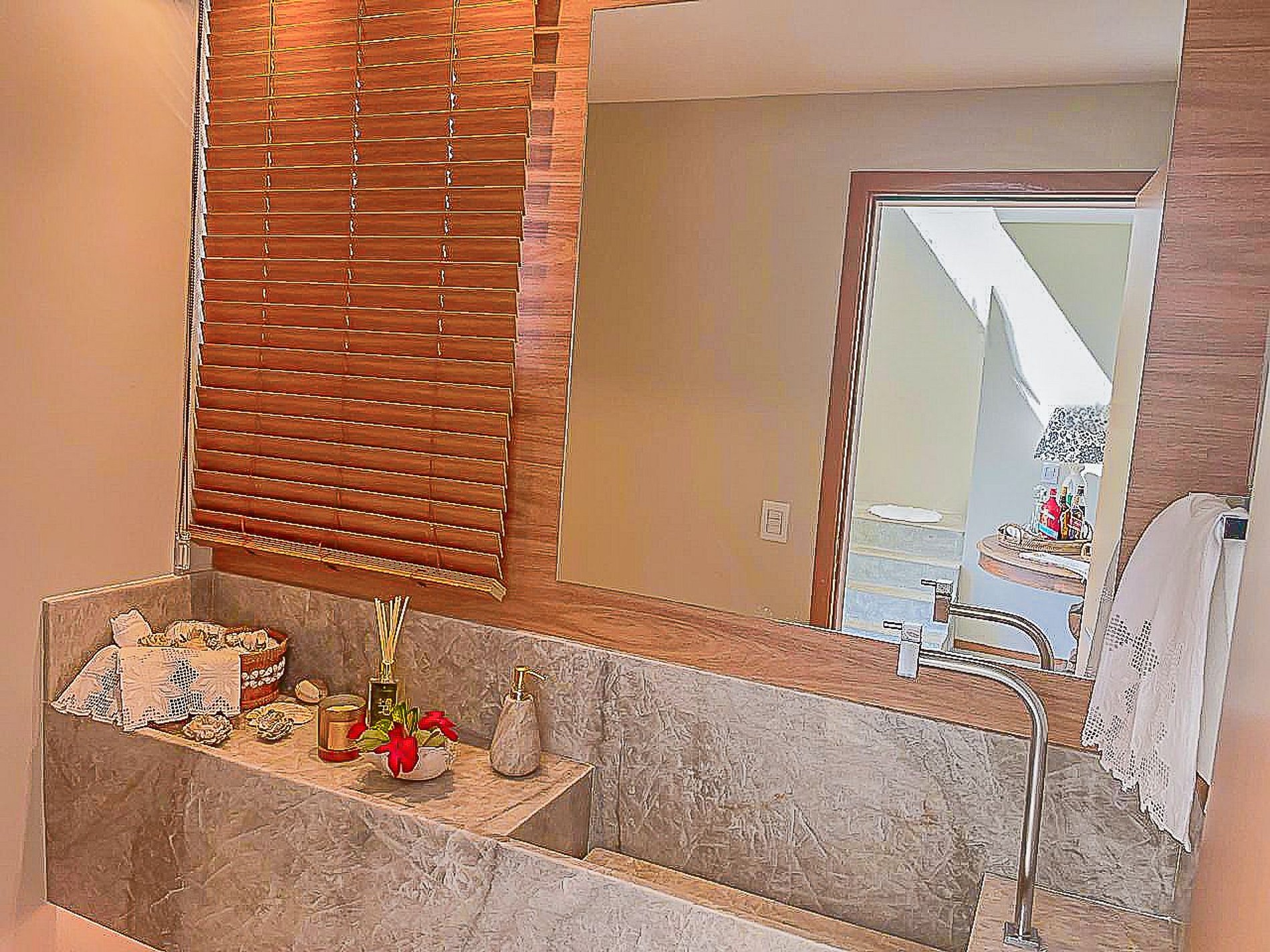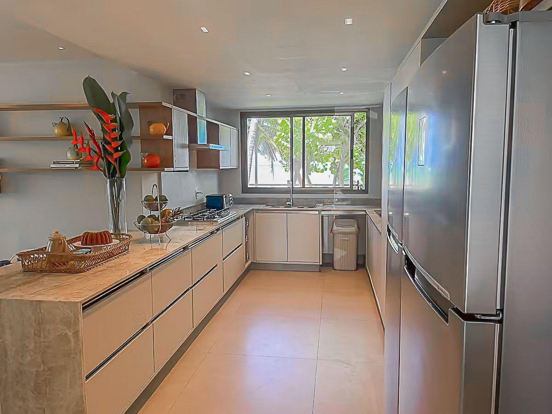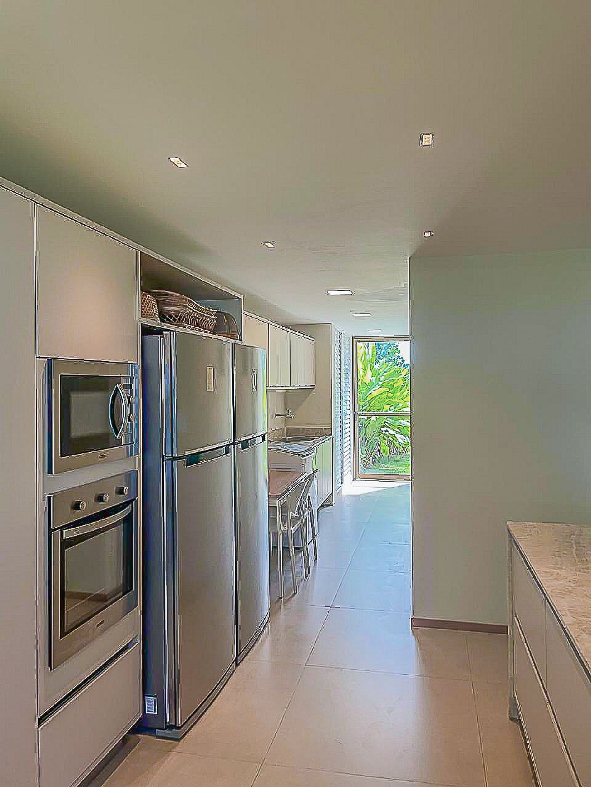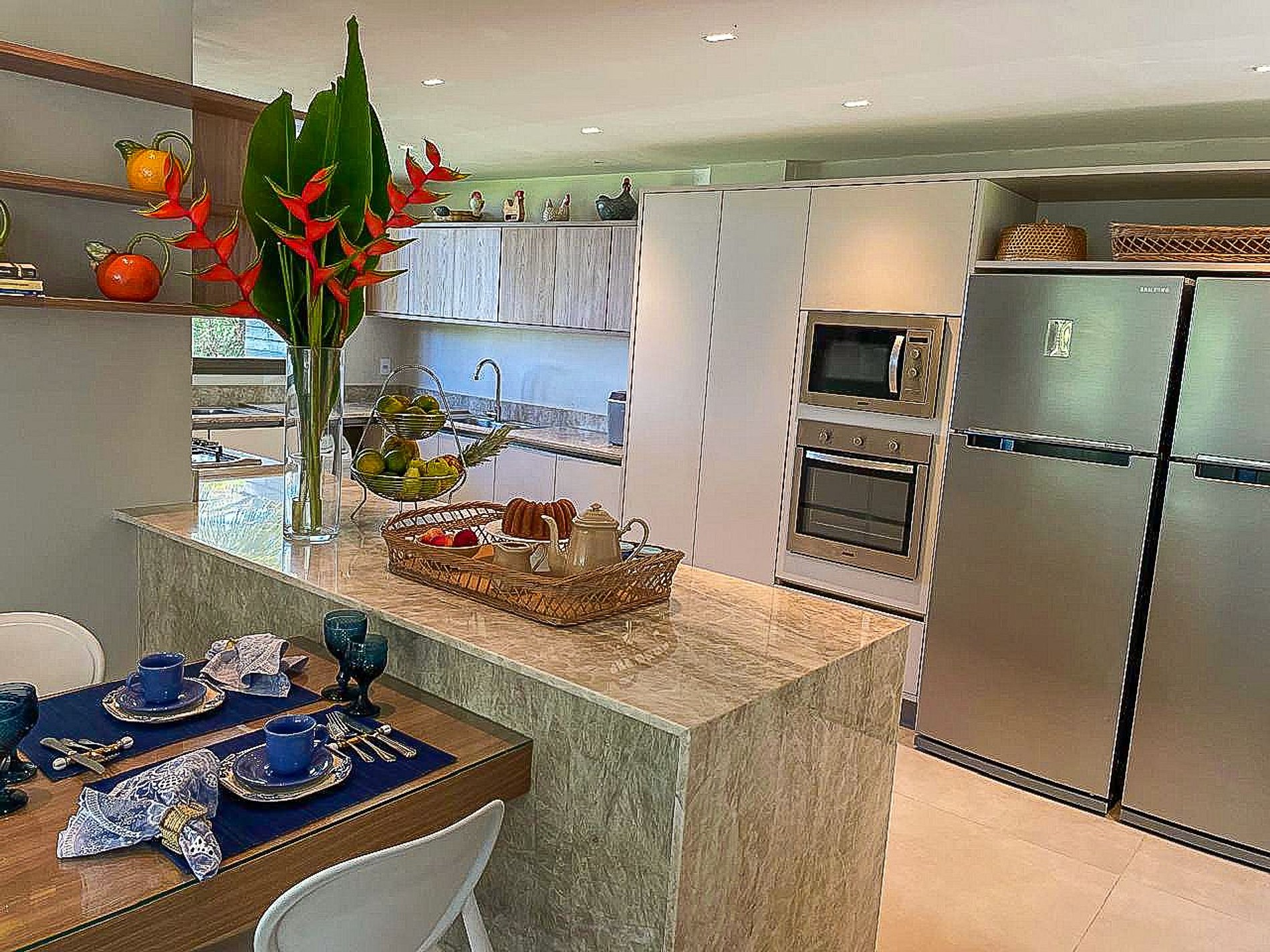A cozinha, espaçosa e funcional, foi projetada com acabamentos de alto padrão, como as bancadas em quartzito Perla Santana, e é equipada com tudo que se precisa para preparar grandes refeições: fogão 5 bocas com coifa, duas geladeiras, forno elétrico, micro-ondas, máquina de gelo, armários e todos os utensílios necessários. Há ainda uma copa com mesa para refeições mais rápidas e uma área de serviço equipada com máquina de lavar roupas e armários. A casa também conta com uma suíte para funcionária, garantindo mais privacidade e comodidade.