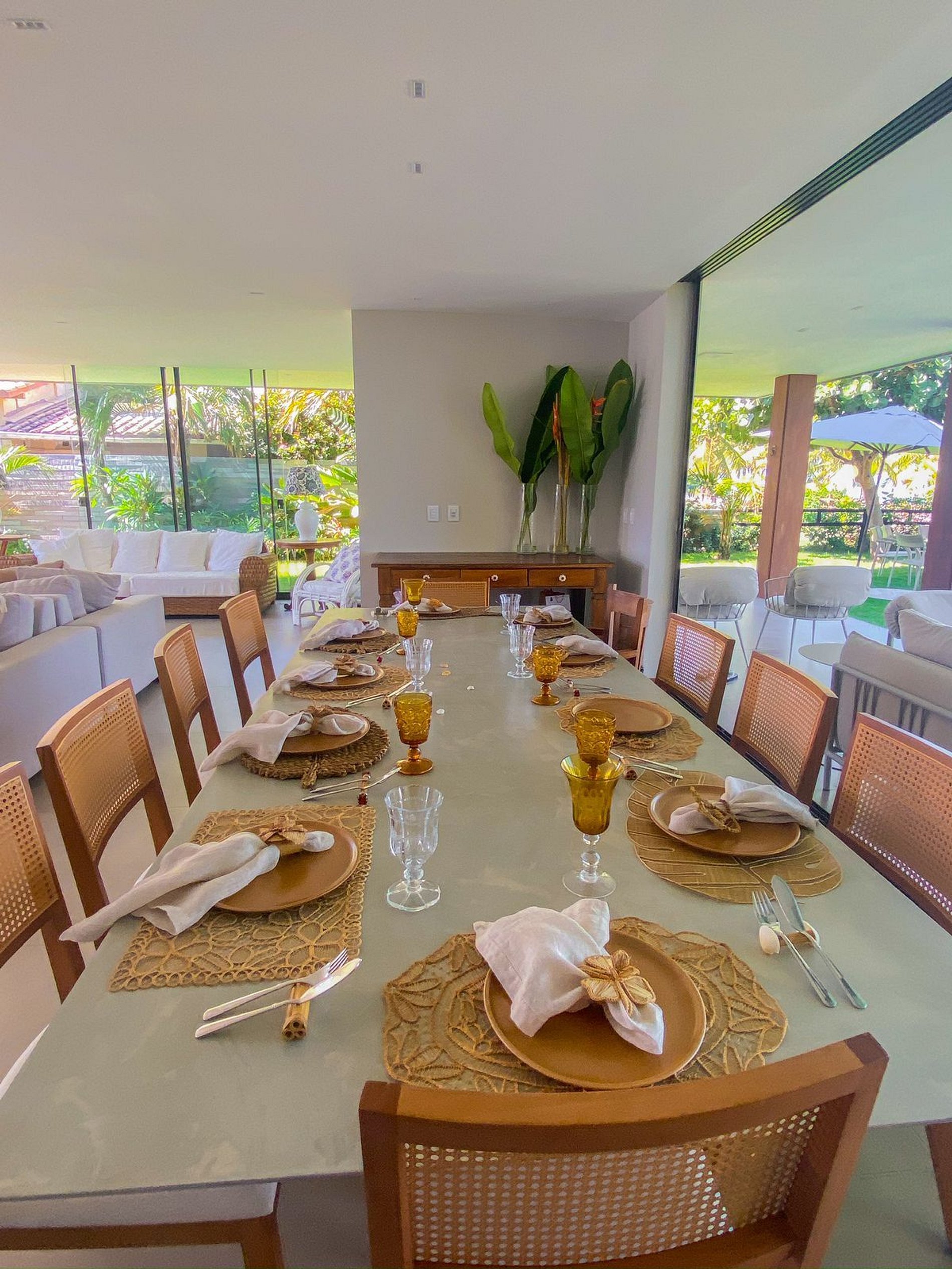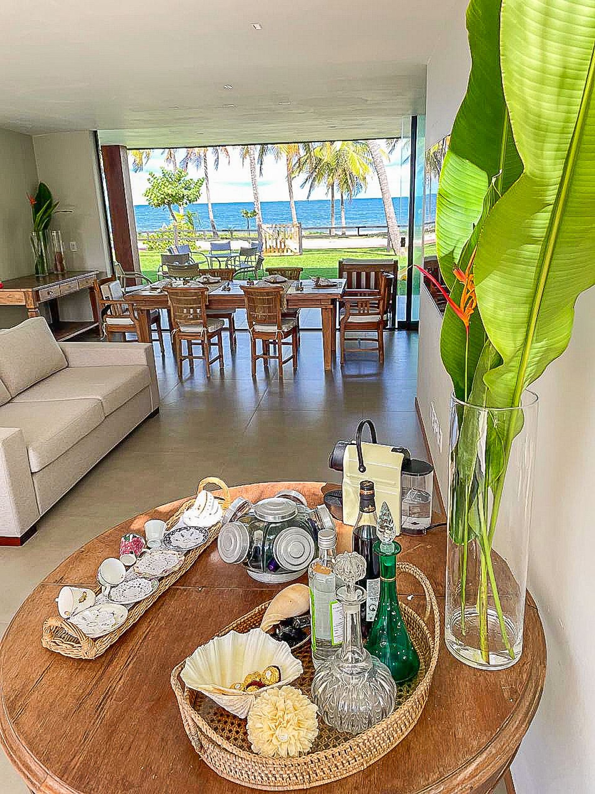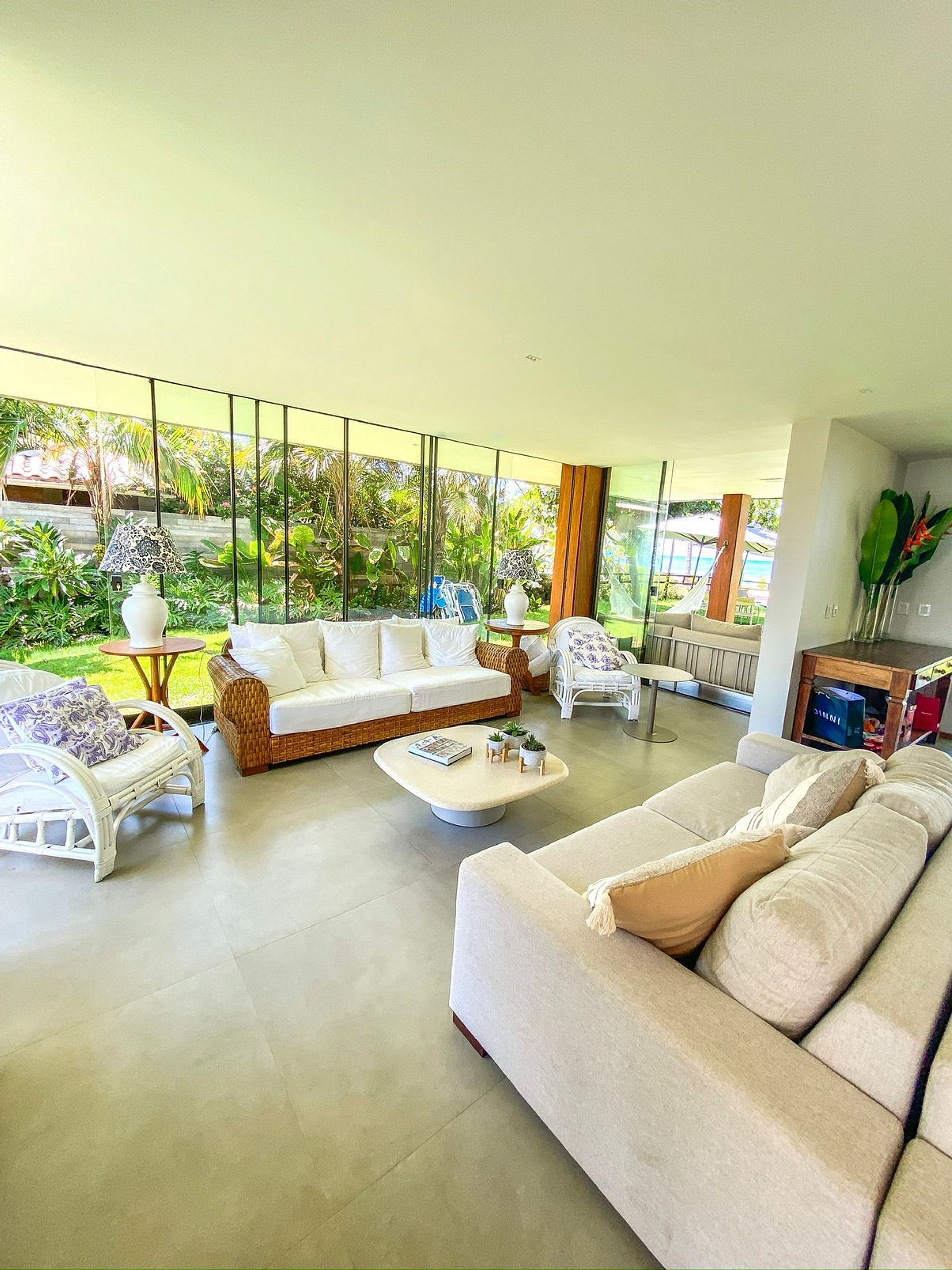 Por dentro, a casa impressiona logo na chegada com seus ambientes integrados e voltados para o mar. A ampla sala de estar é equipada com sofás e poltronas confortáveis, perfeita para relaxar ao final do dia. Logo ao lado, a sala de jantar se conecta à varanda por meio de esquadrias de vidro que emolduram a paisagem tropical e permitem que a brisa do mar circule livremente por todo o espaço.