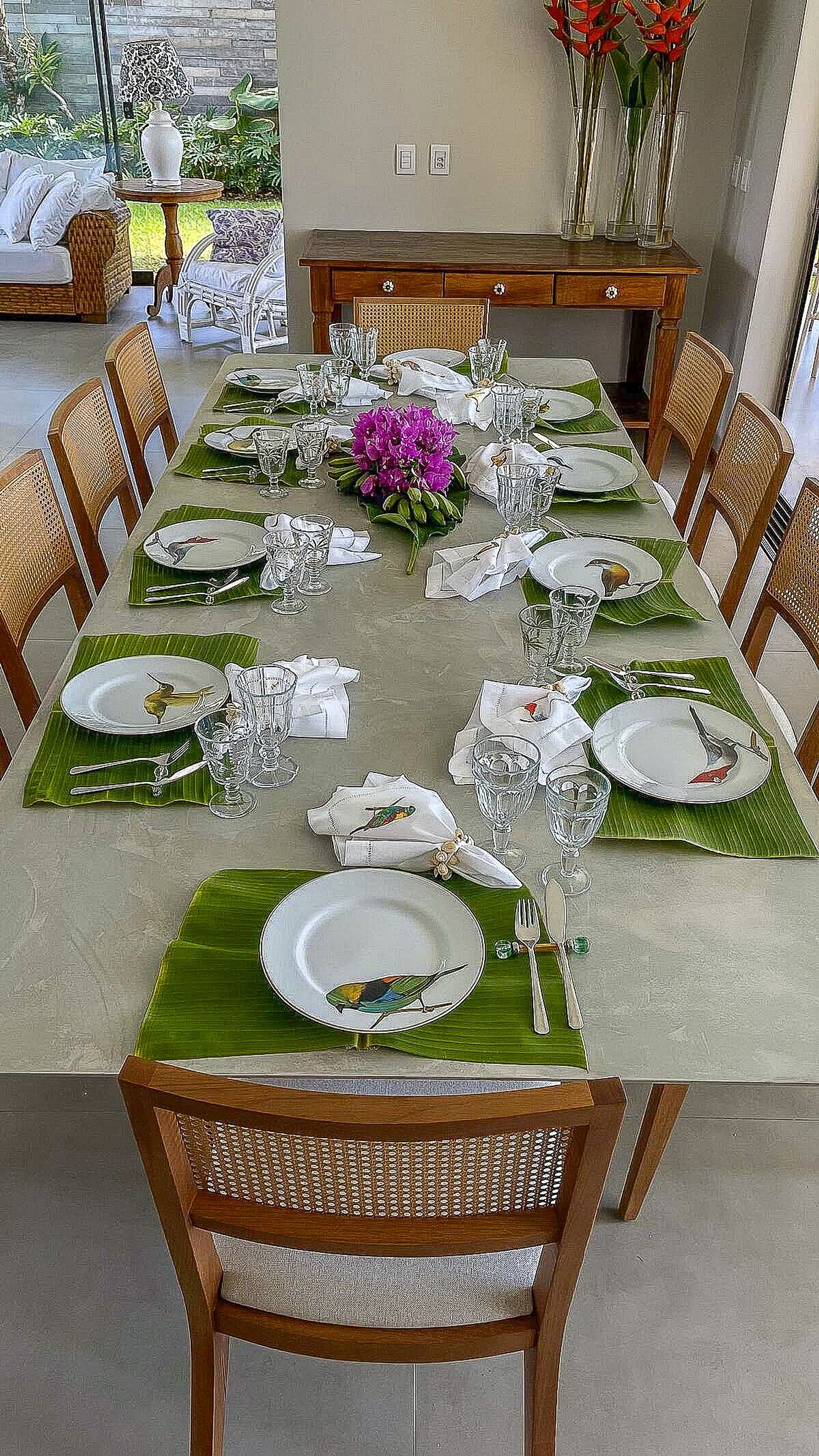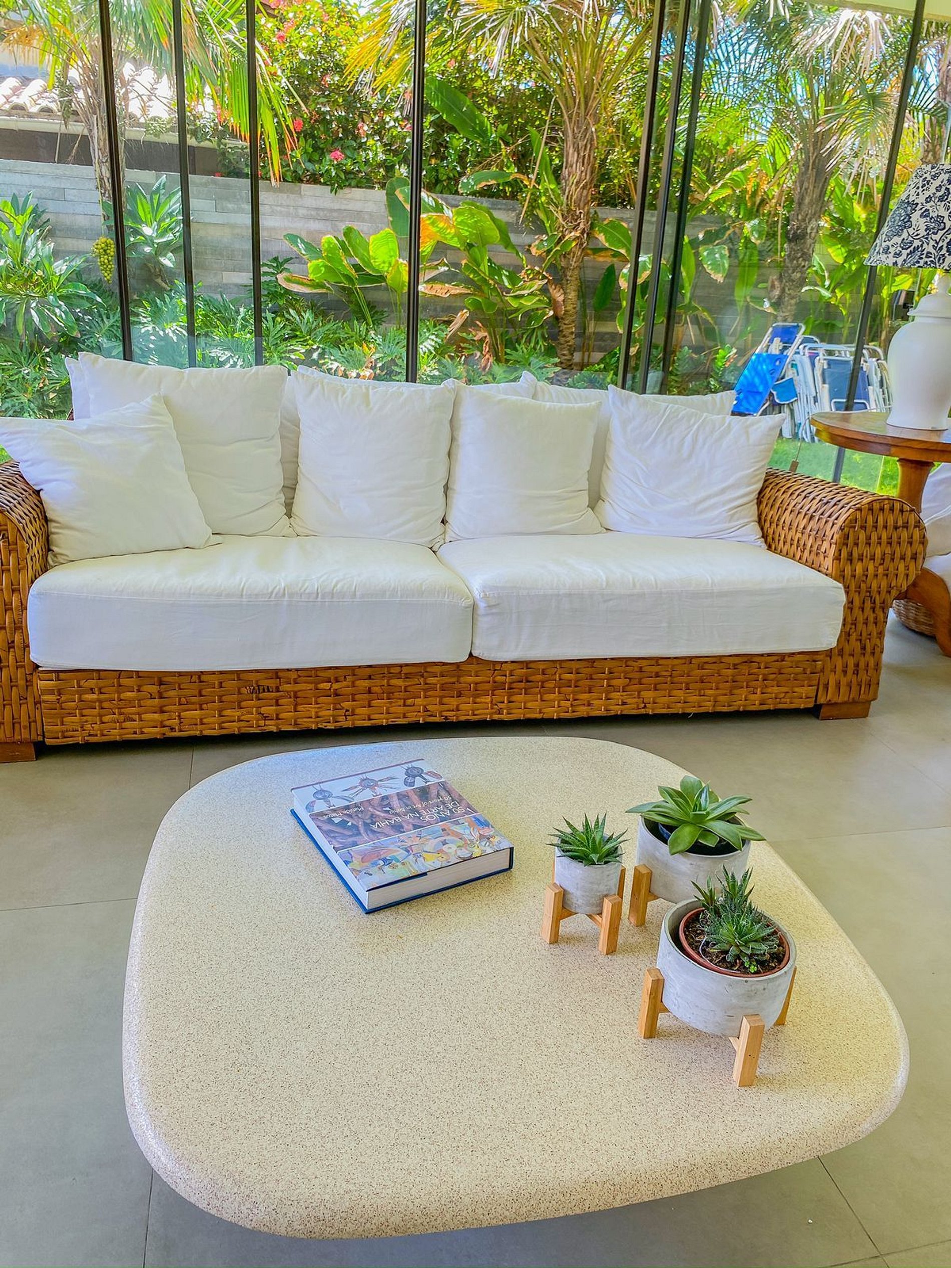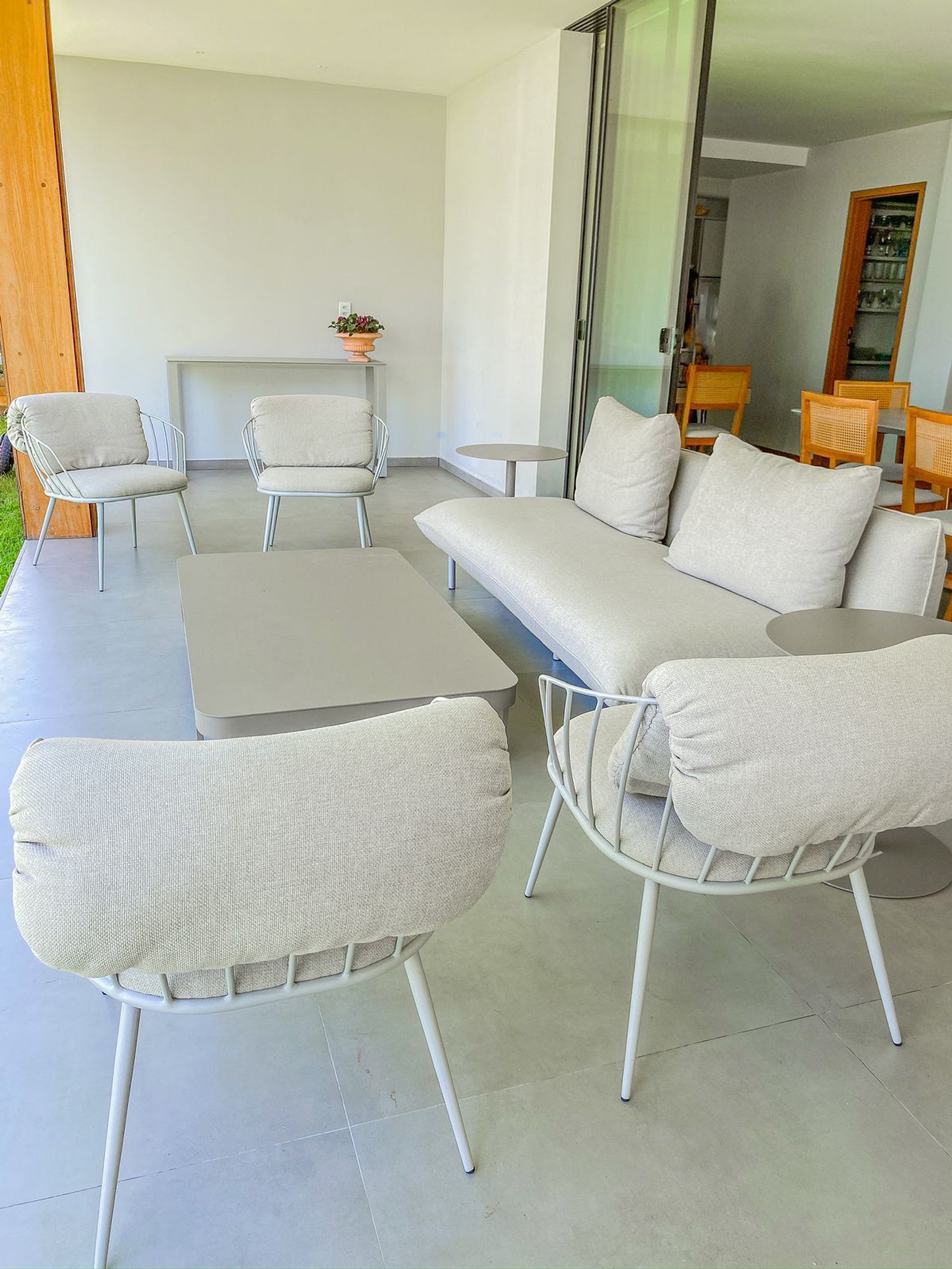 Por dentro, a casa impressiona logo na chegada com seus ambientes integrados e voltados para o mar. A ampla sala de estar é equipada com sofás e poltronas confortáveis, perfeita para relaxar ao final do dia. Logo ao lado, a sala de jantar se conecta à varanda por meio de esquadrias de vidro que emolduram a paisagem tropical e permitem que a brisa do mar circule livremente por todo o espaço.