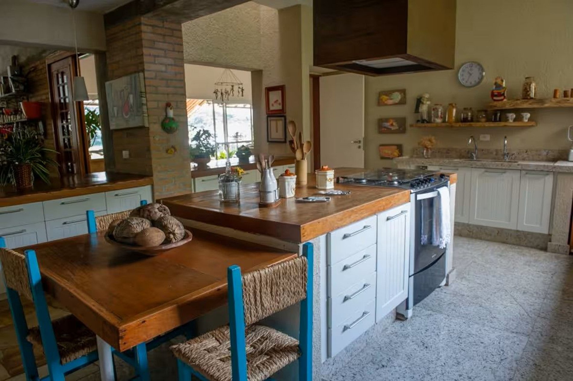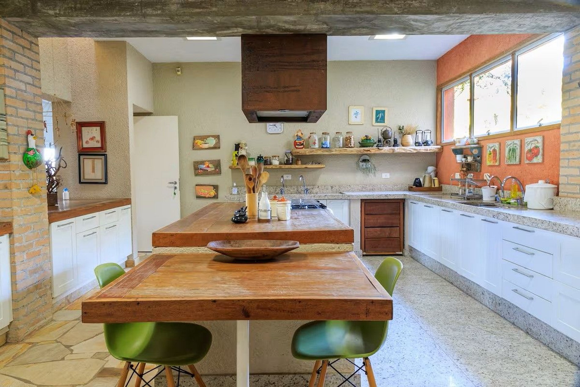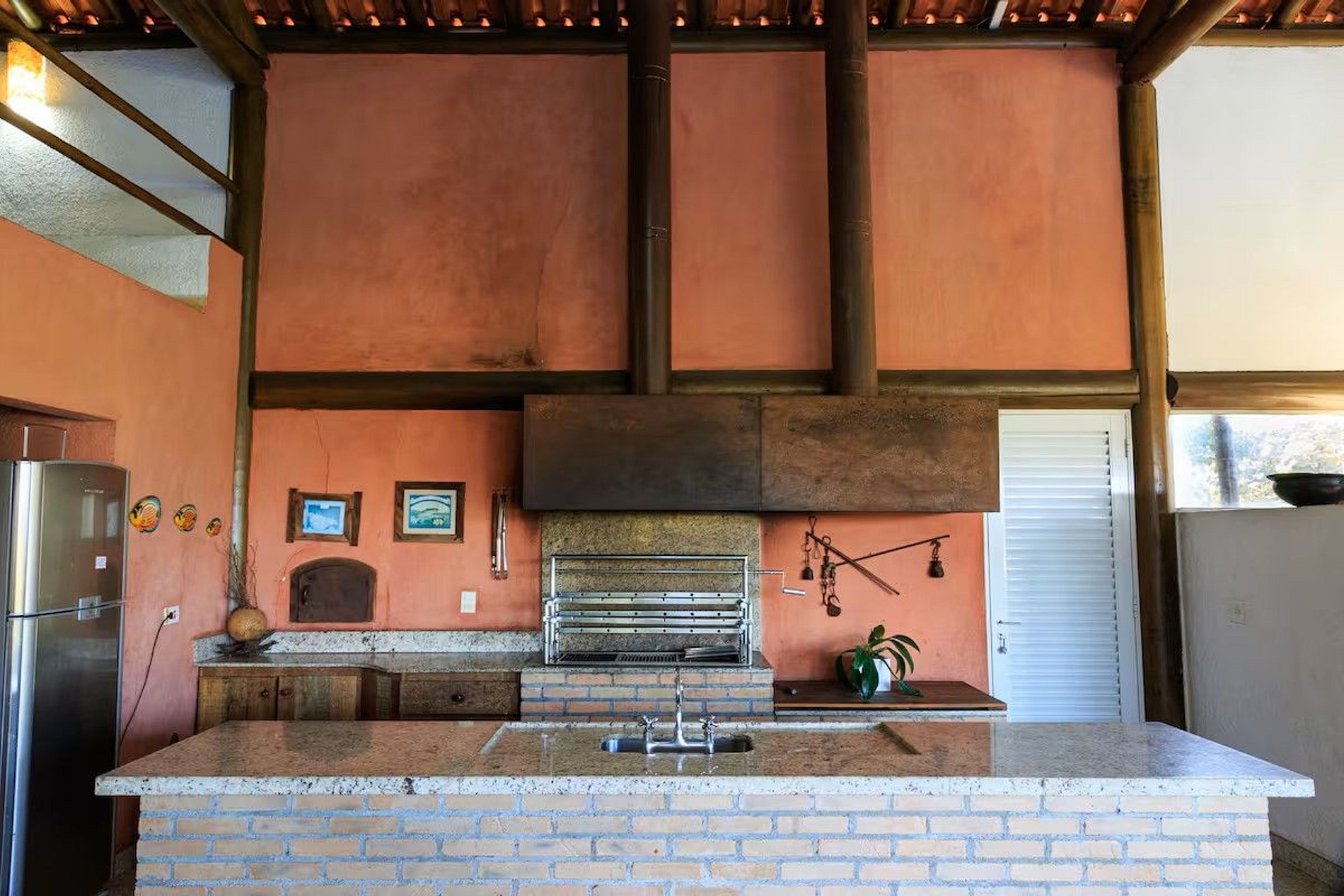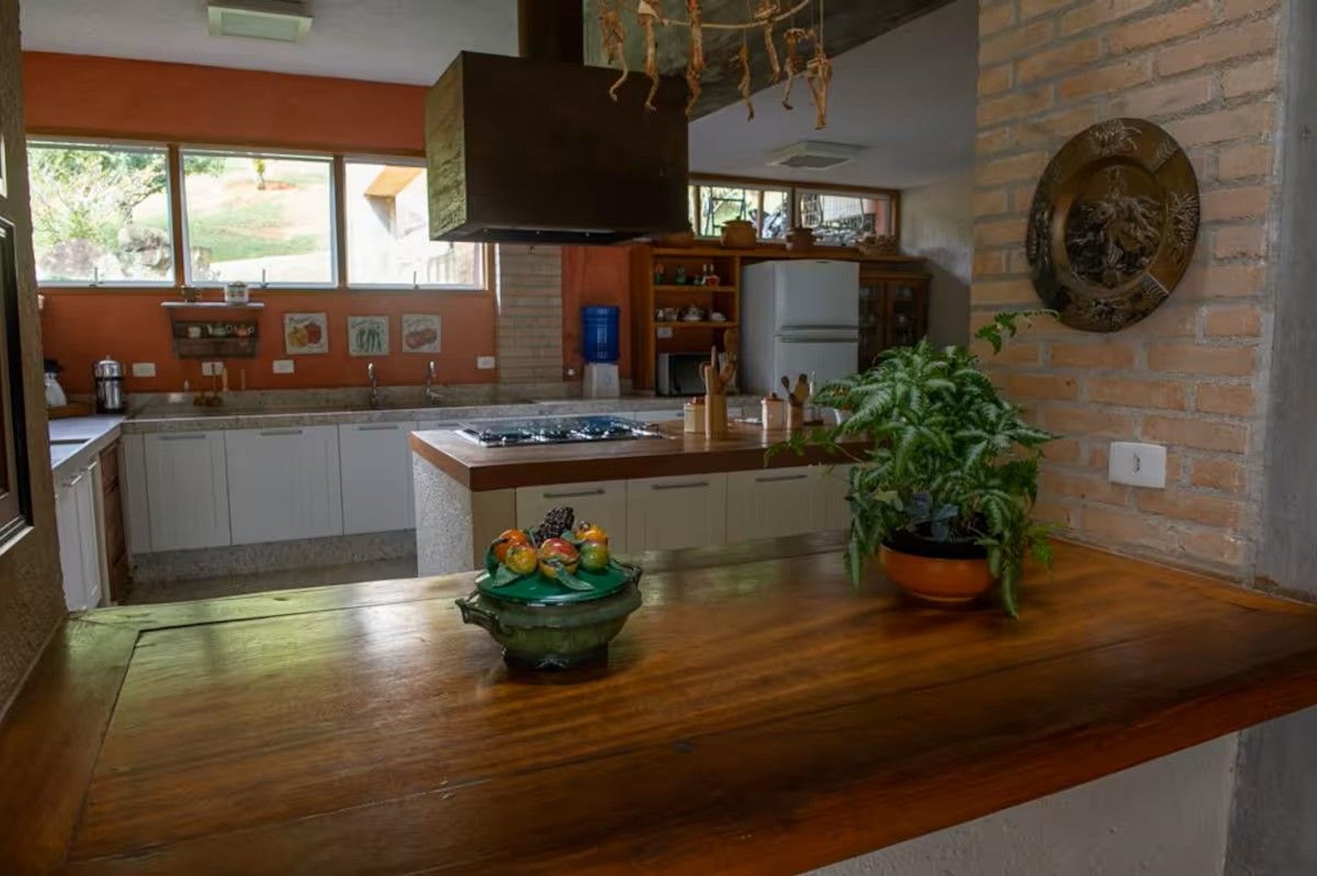 A casa conta com uma cozinha completa e bem equipada, oferecendo utensílios e eletrodomésticos para atender tanto pequenos grupos quanto grandes eventos.