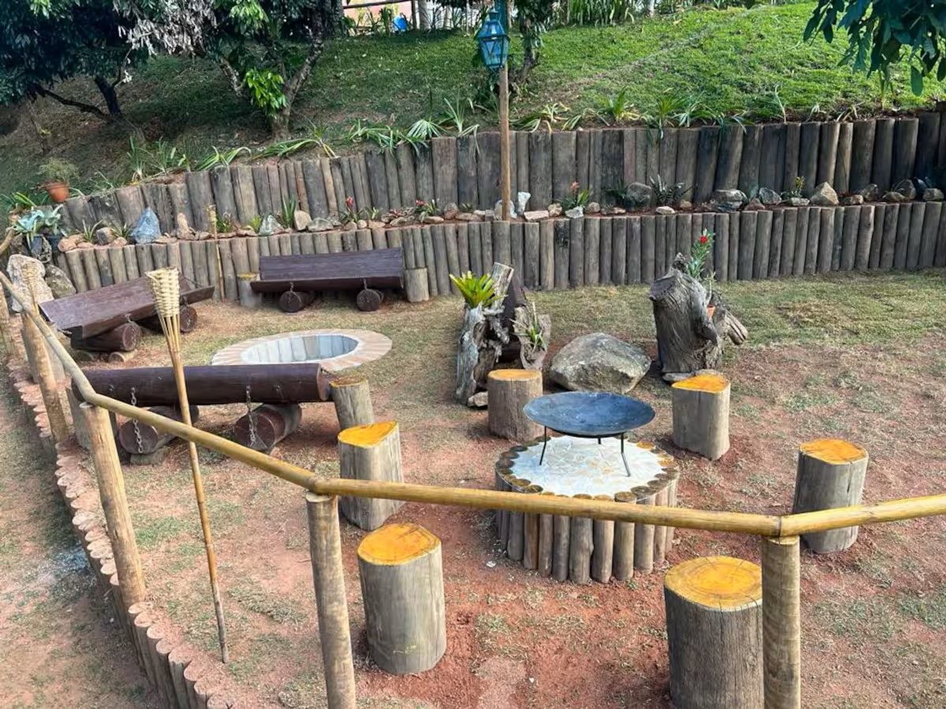 O espaço gourmet interno complementa essa estrutura com churrasqueira, forno de barro, fogão a lenha, bancada, refrigerador, freezer e uma charmosa mesa de madeira bruta para até 20 lugares — ideal para encontros memoráveis em família ou entre amigos.