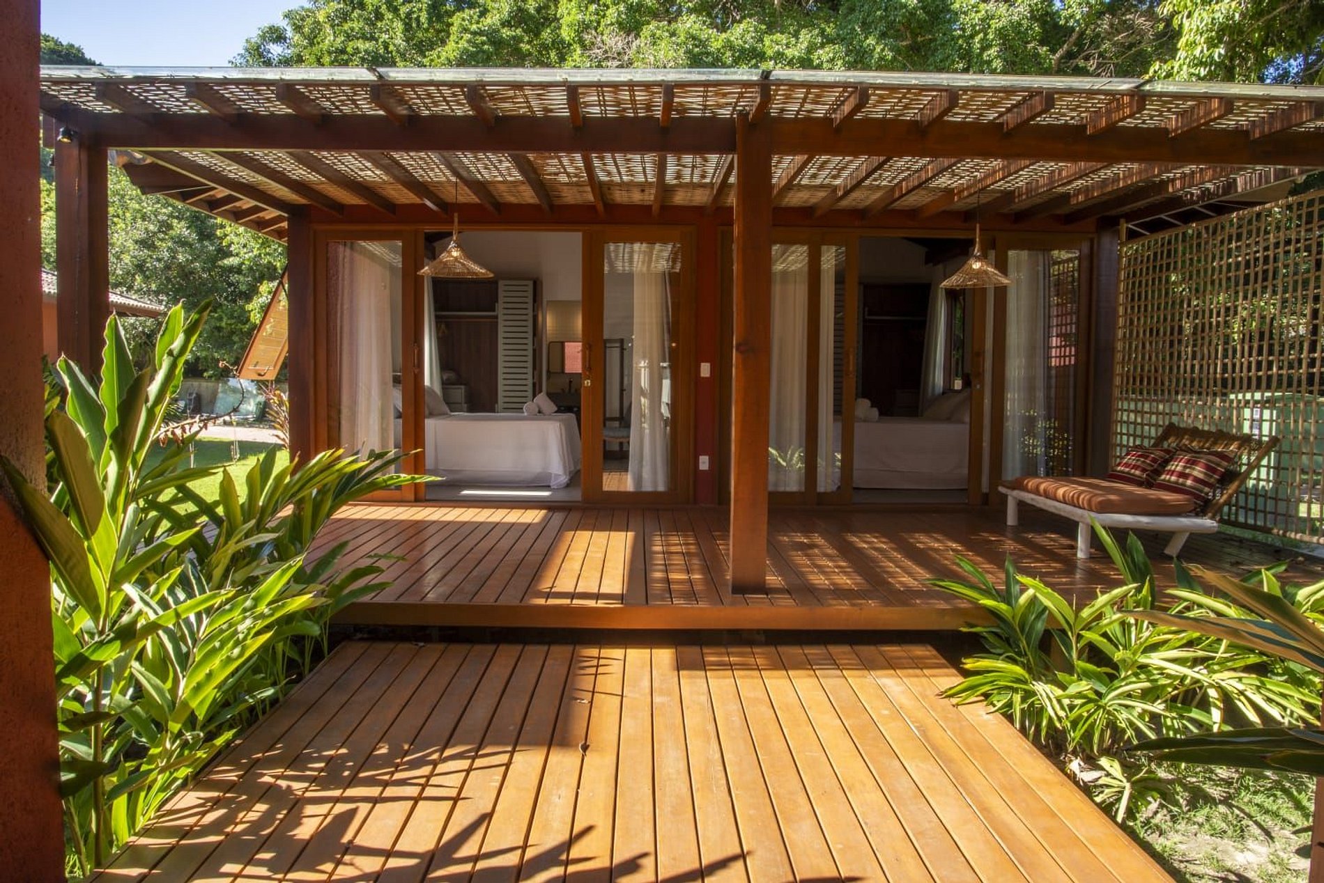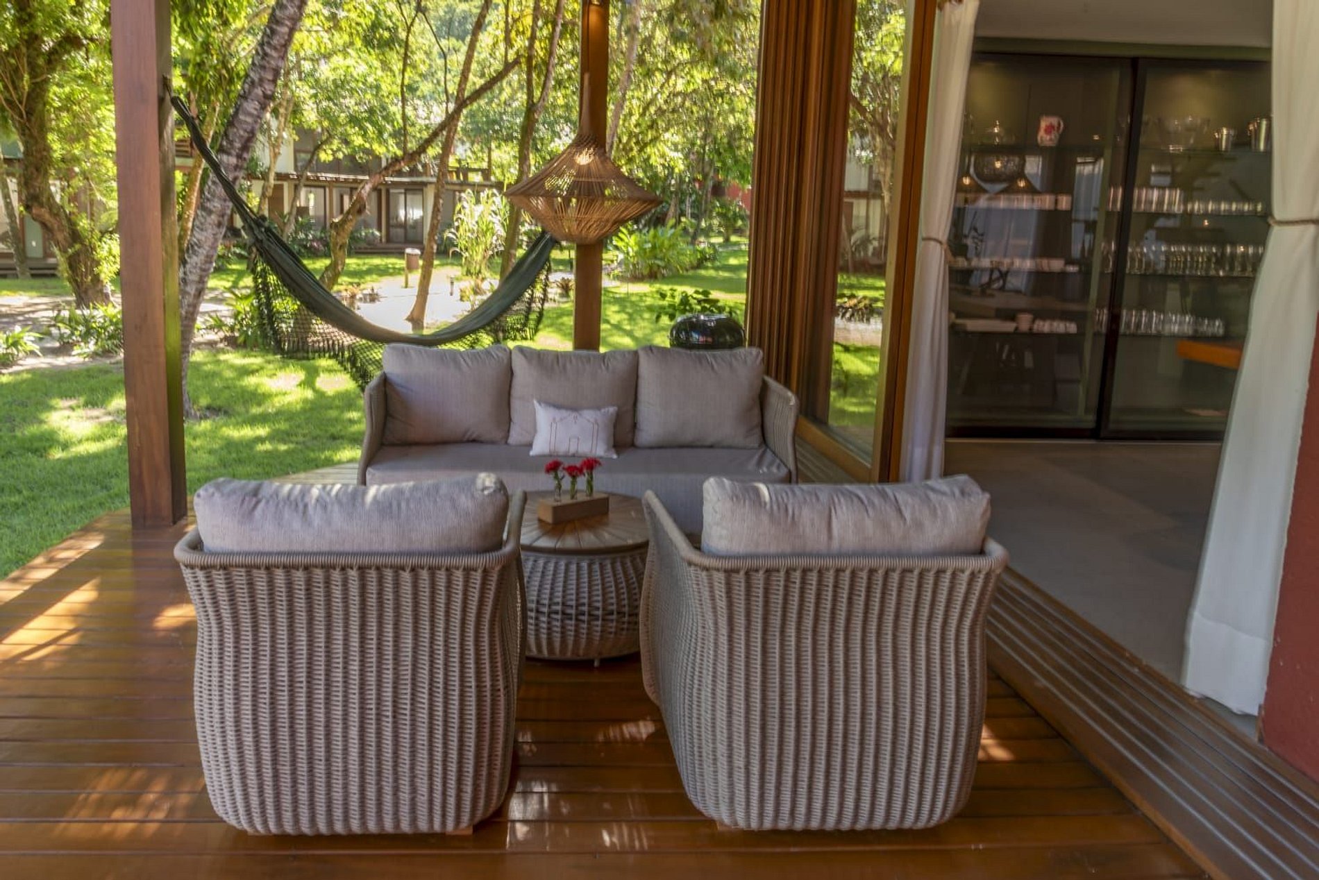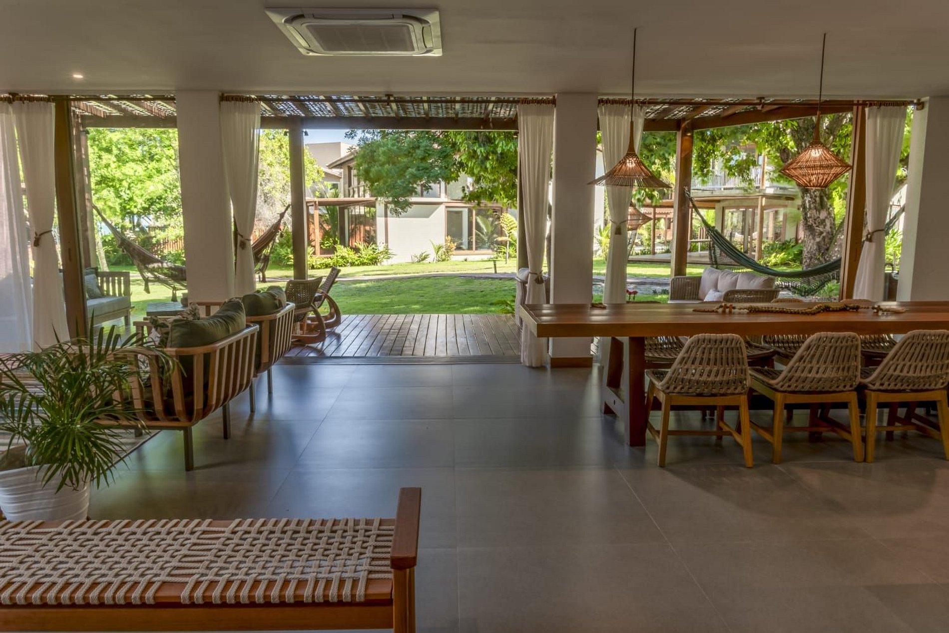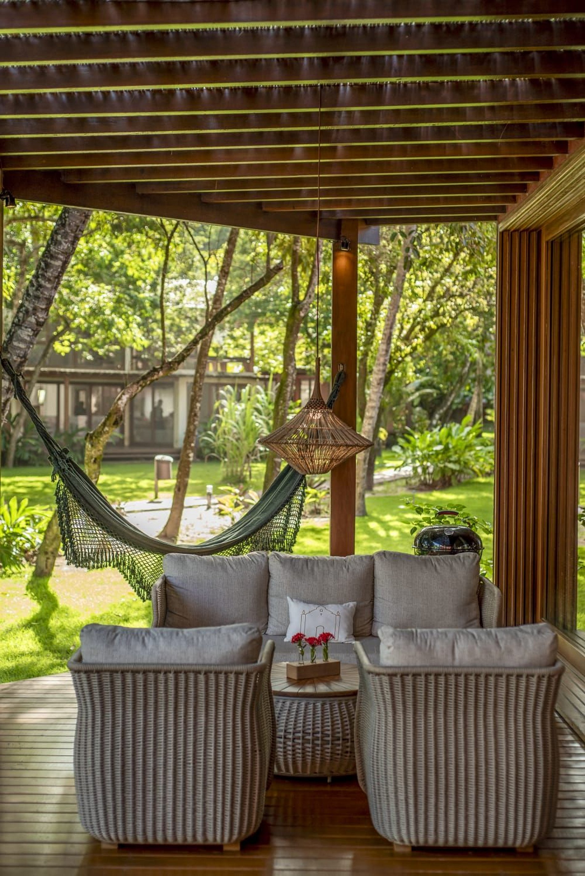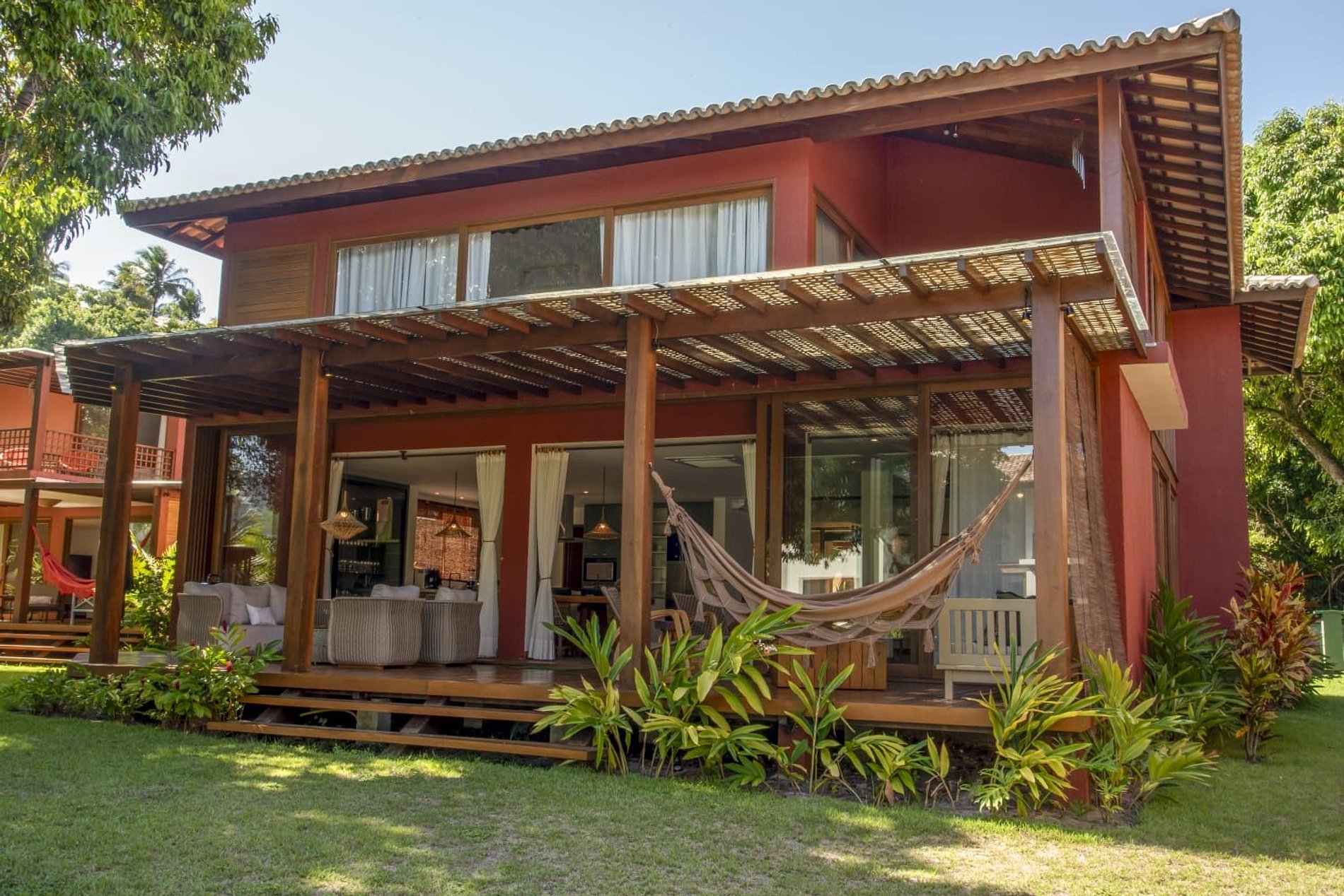 A casa conta com um charmoso deck de madeira integrado ao jardim, perfeito para momentos de descanso e contemplação da natureza. A varanda é ampla e equipada com sofás, poltronas e redes que convidam a relaxar enquanto a brisa do mar refresca o ambiente. O jardim gramado ao redor complementa a atmosfera tranquila e acolhedora.