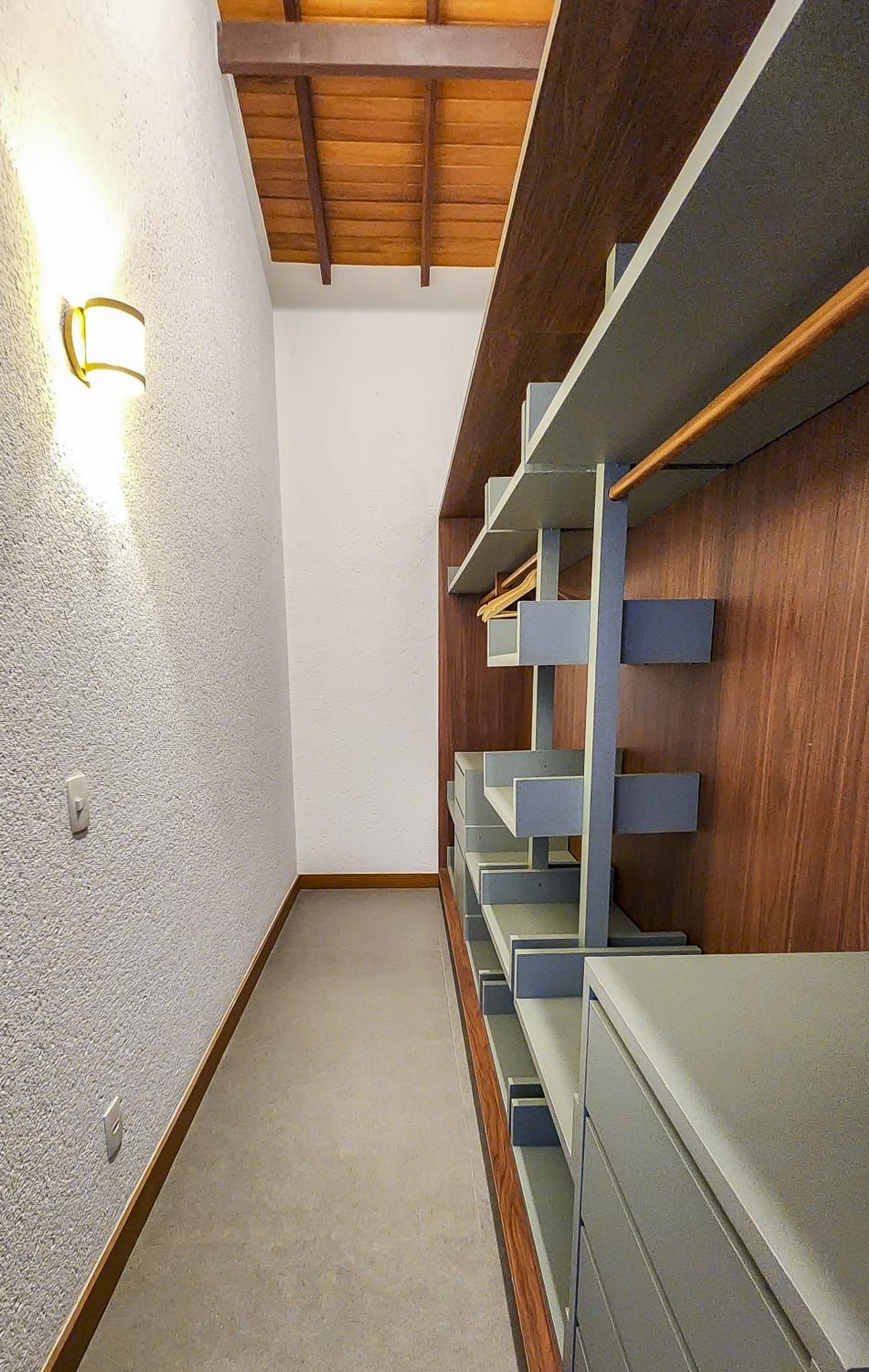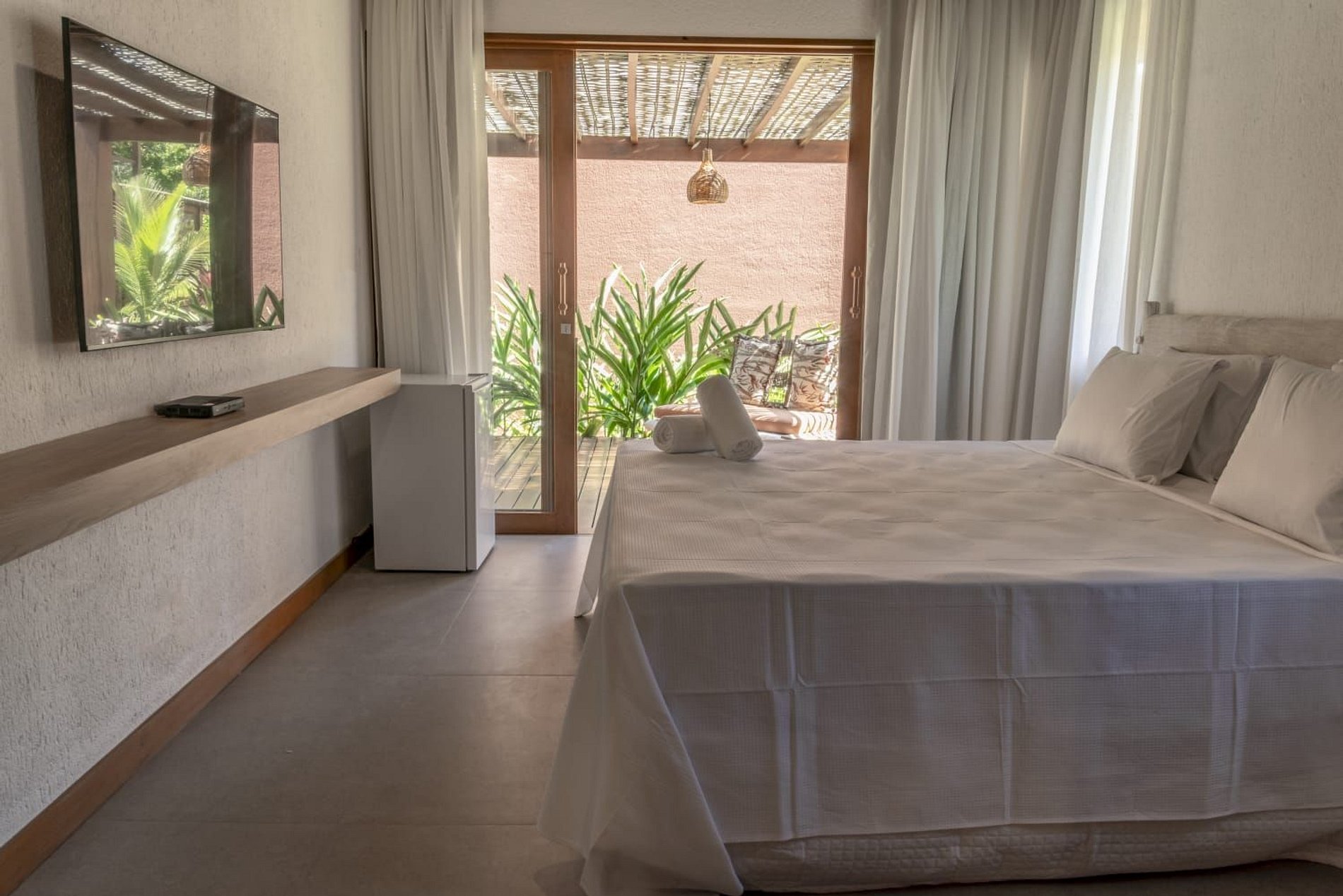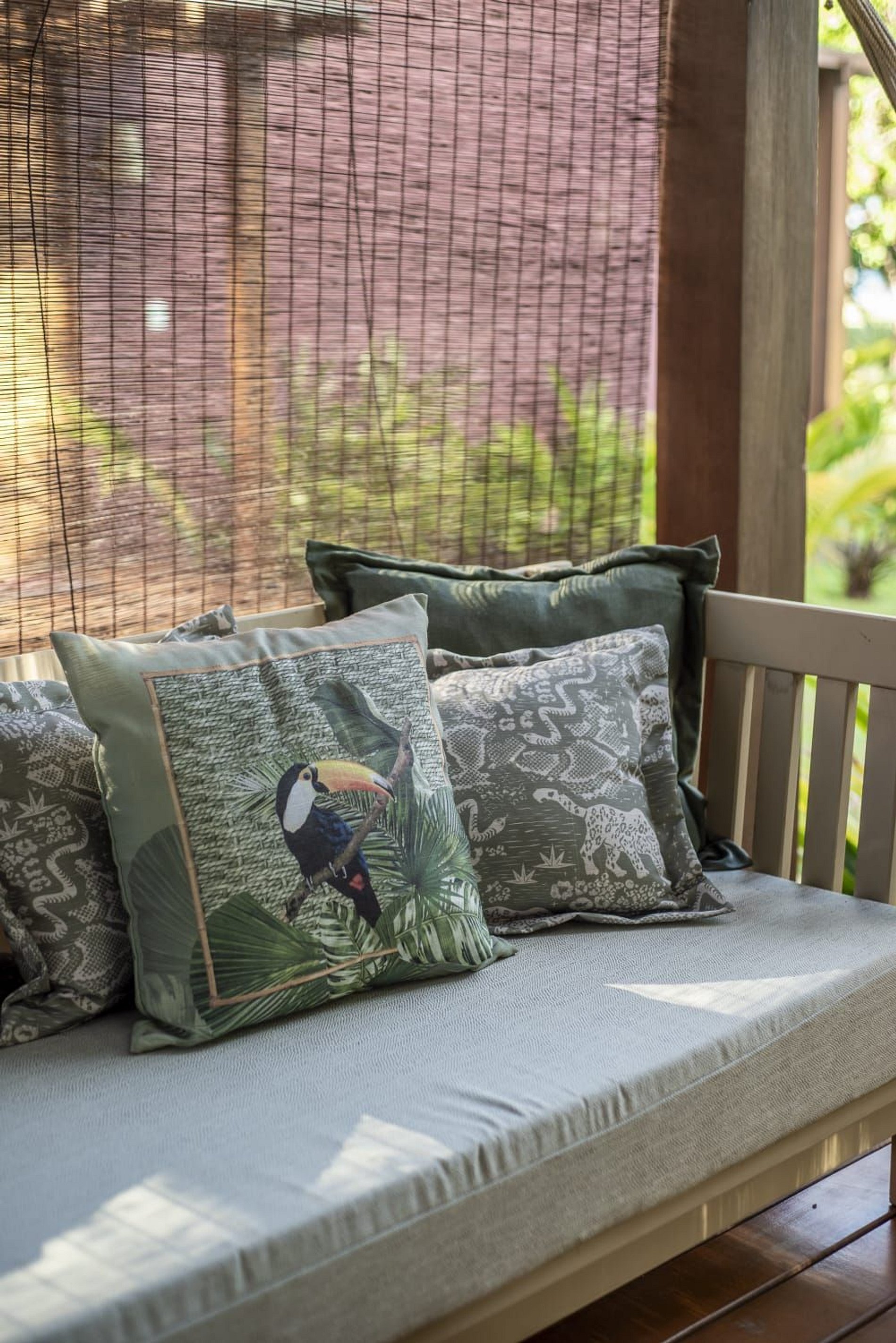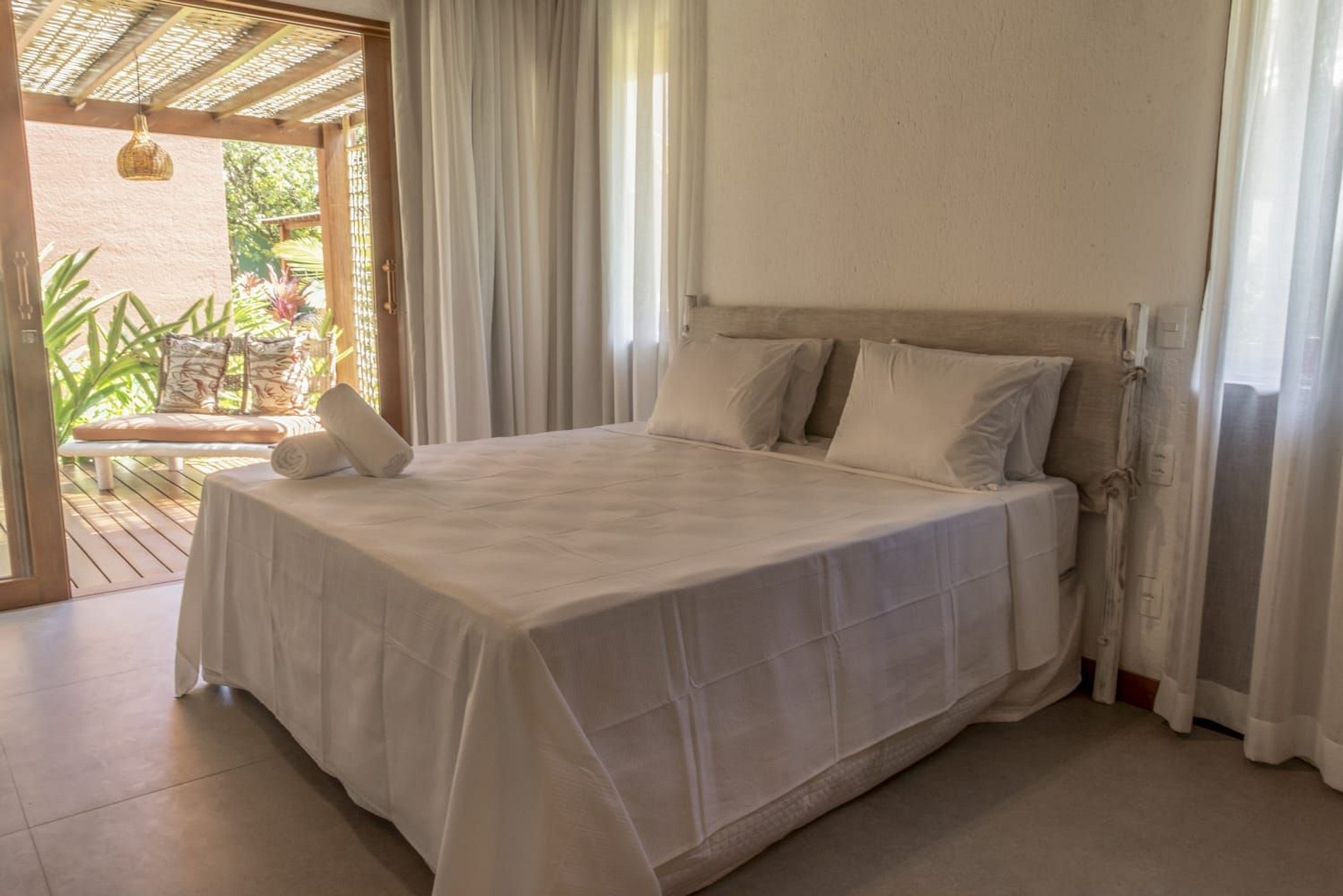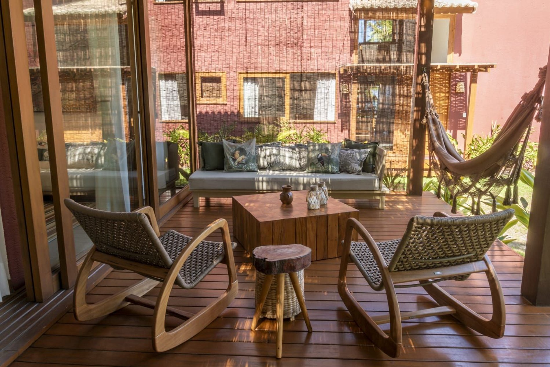 A casa conta com um charmoso deck de madeira integrado ao jardim, perfeito para momentos de descanso e contemplação da natureza. A varanda é ampla e equipada com sofás, poltronas e redes que convidam a relaxar enquanto a brisa do mar refresca o ambiente. O jardim gramado ao redor complementa a atmosfera tranquila e acolhedora.