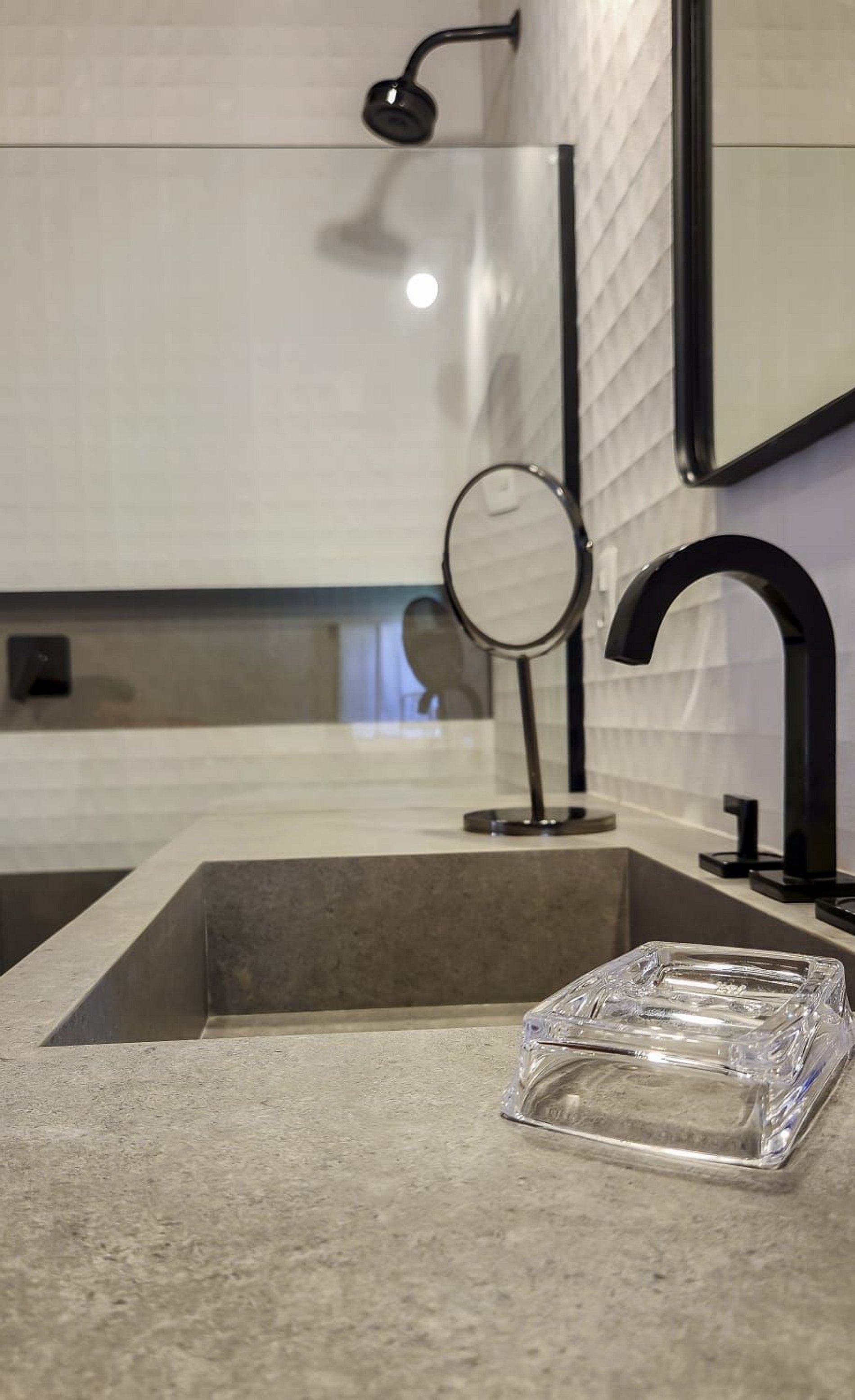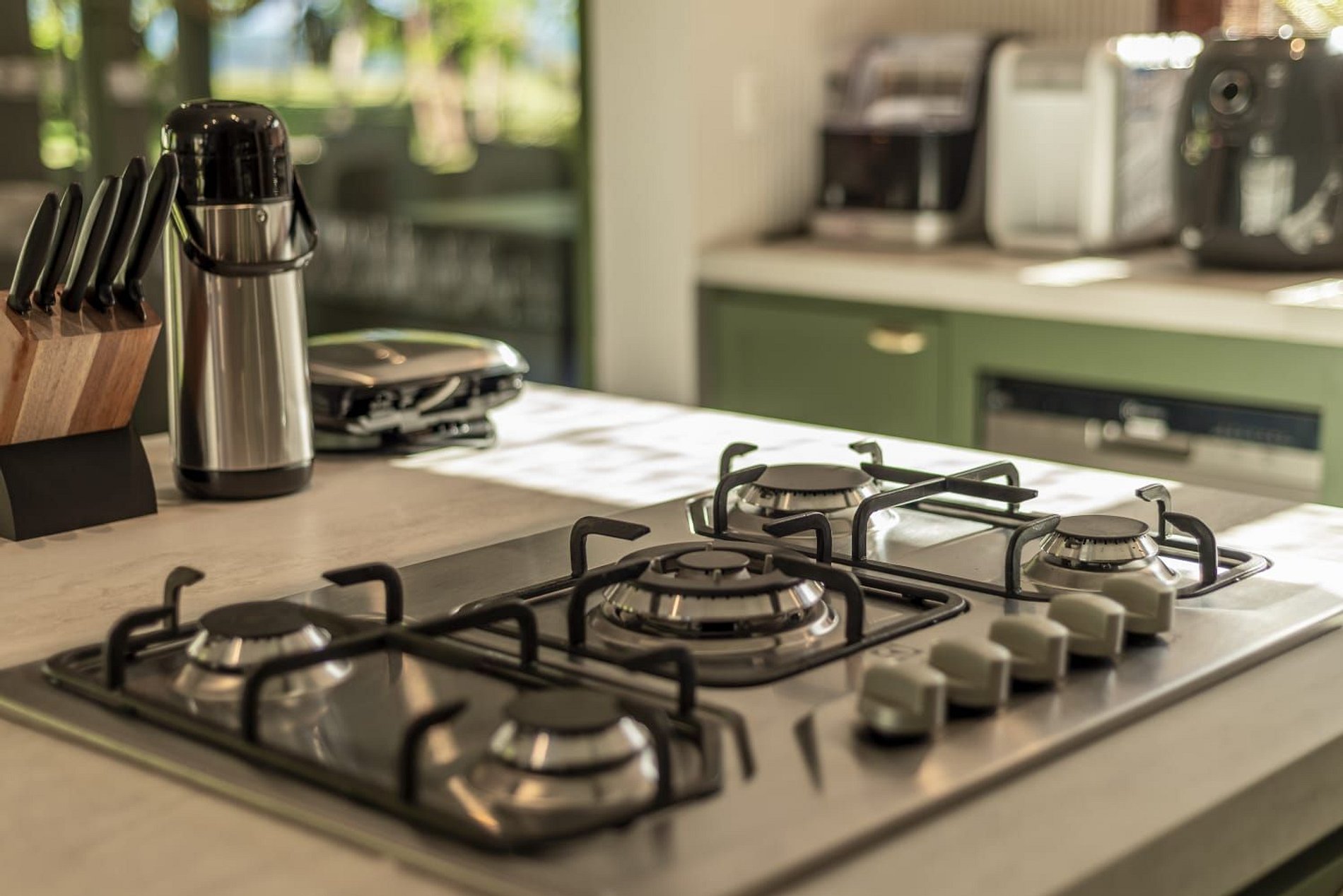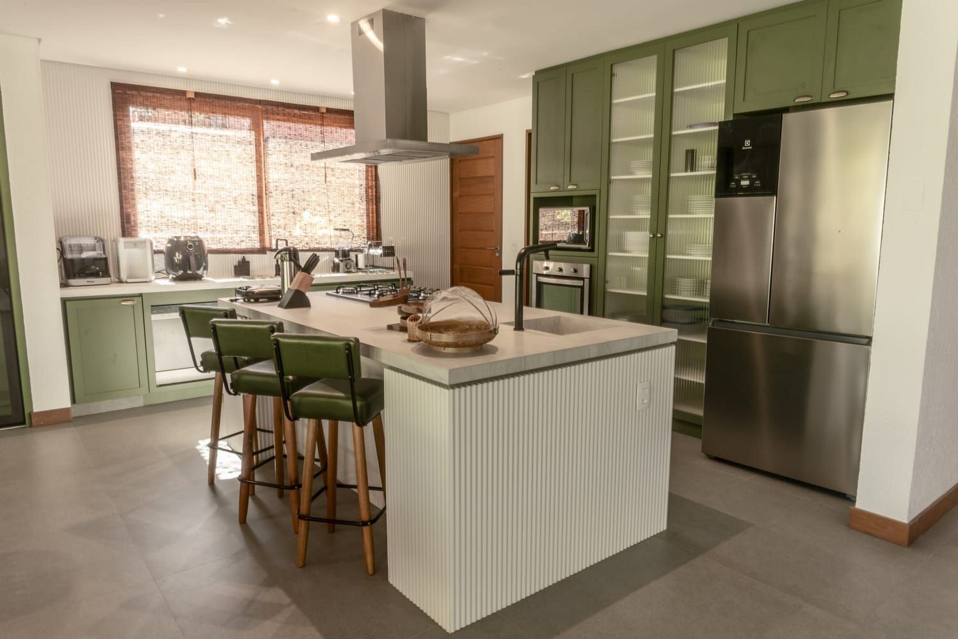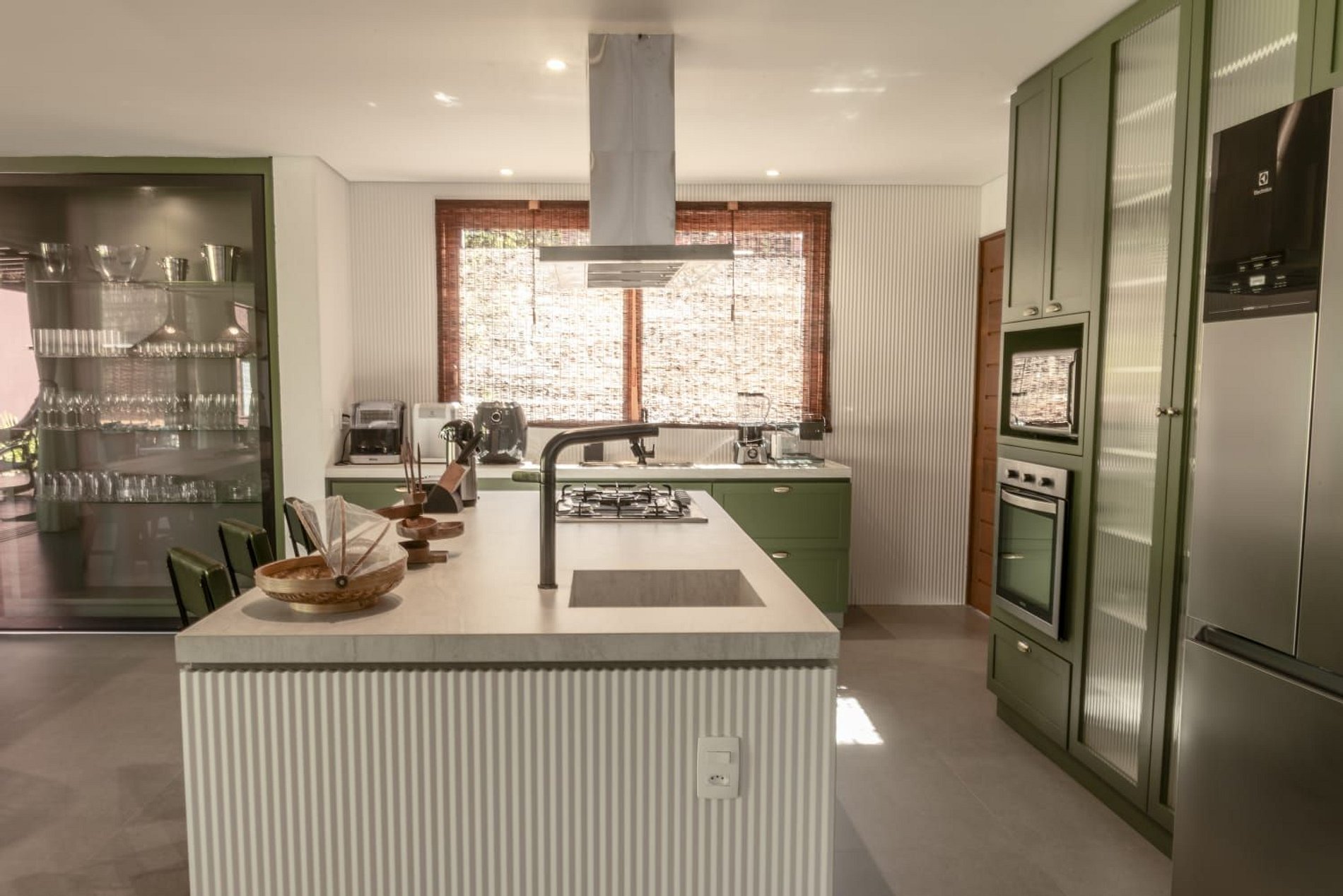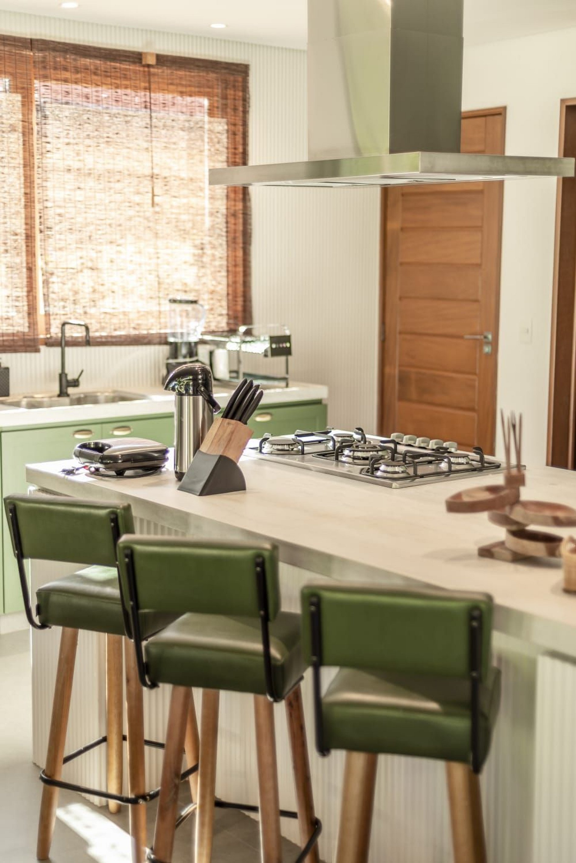 A cozinha é planejada e moderna, equipada com eletrodomésticos de qualidade, bancada funcional e armários bem distribuídos. Com estilo clean e sofisticado, é um espaço ideal tanto para refeições rápidas quanto para experiências gastronômicas completas.